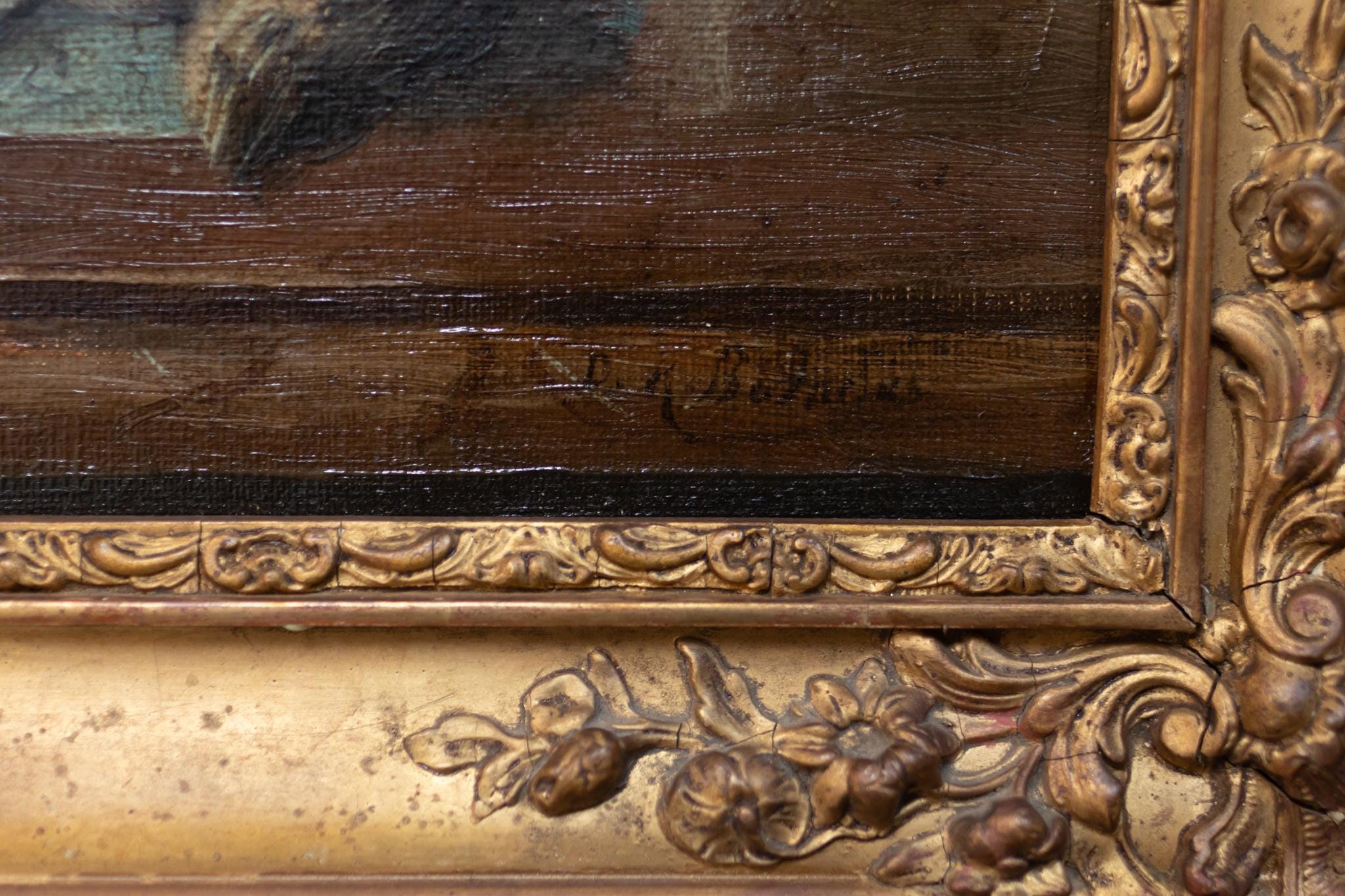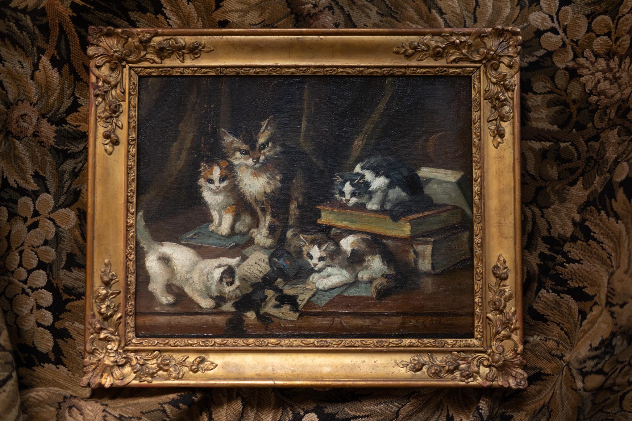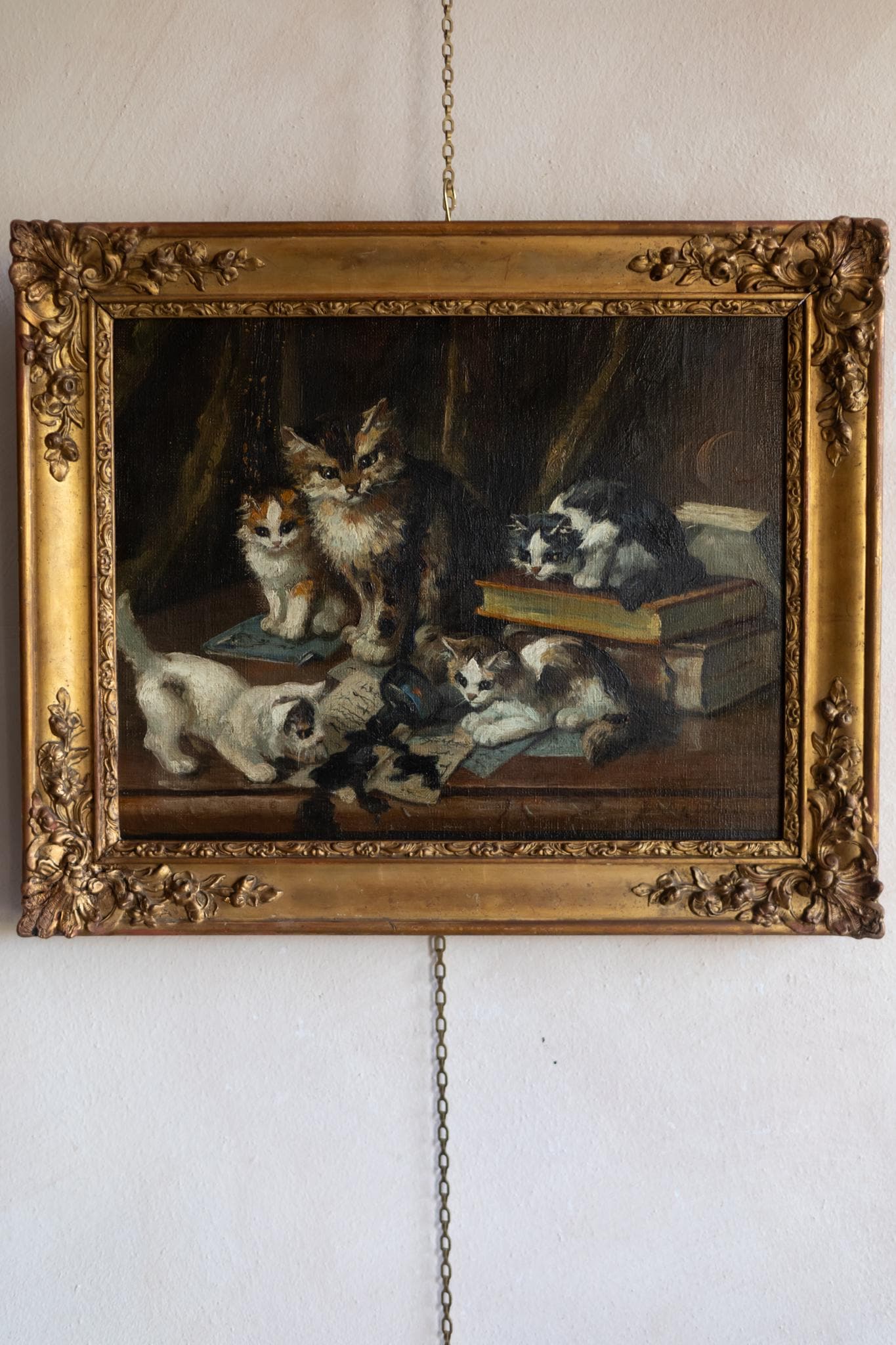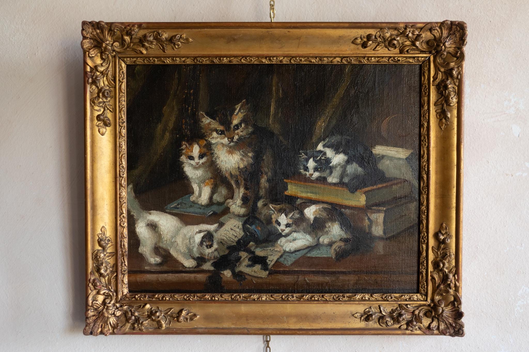 A charming French genre painting signed by the French artist "Baladus", depicting a lively group of kittens at play. The mischievous scene shows the cats exploring a writing desk—perched on books, pawing at papers, and spilling ink across the surface. Painted in the late 19th to early 20th century, the work captures the playful spirit and curiosity of kittens with warm detail and humour. Presented in an ornate gilt Napoleon III frame, it reflects the popular French tradition of animal painting, reminiscent of the whimsical domestic scenes collectors adored. A lovely thicker impasto on the kittens, highlighting the furs and giving the painting and it's objects some lovely depth. A delightful antique oil painting for cat lovers and enthusiasts of French decorative art. This antique painting is signed in lower right corner. The painting has recently been to the restorer for a professional cleaning and new varnish applied. The frame has some small signs of it's age, please see all photos.