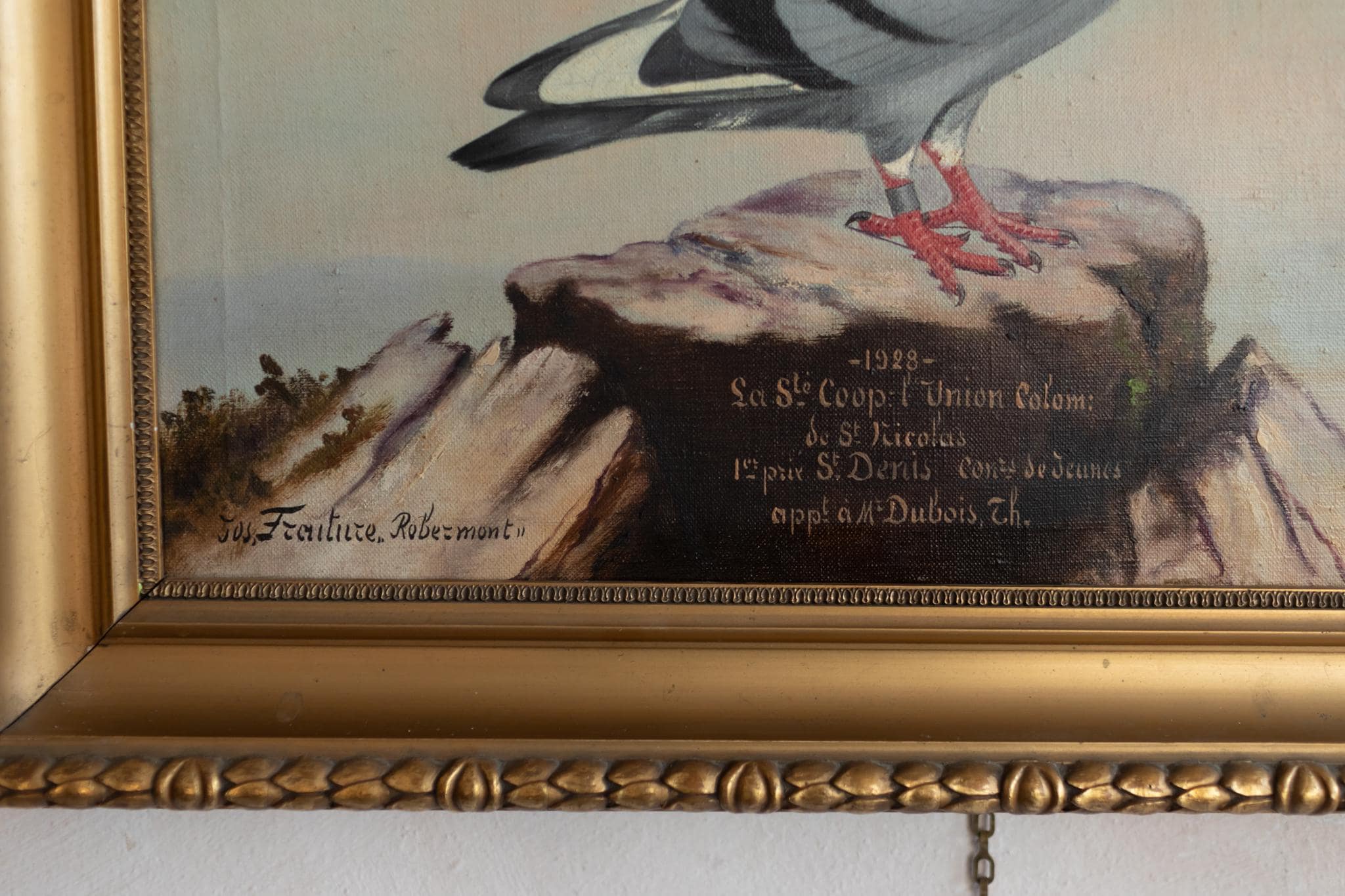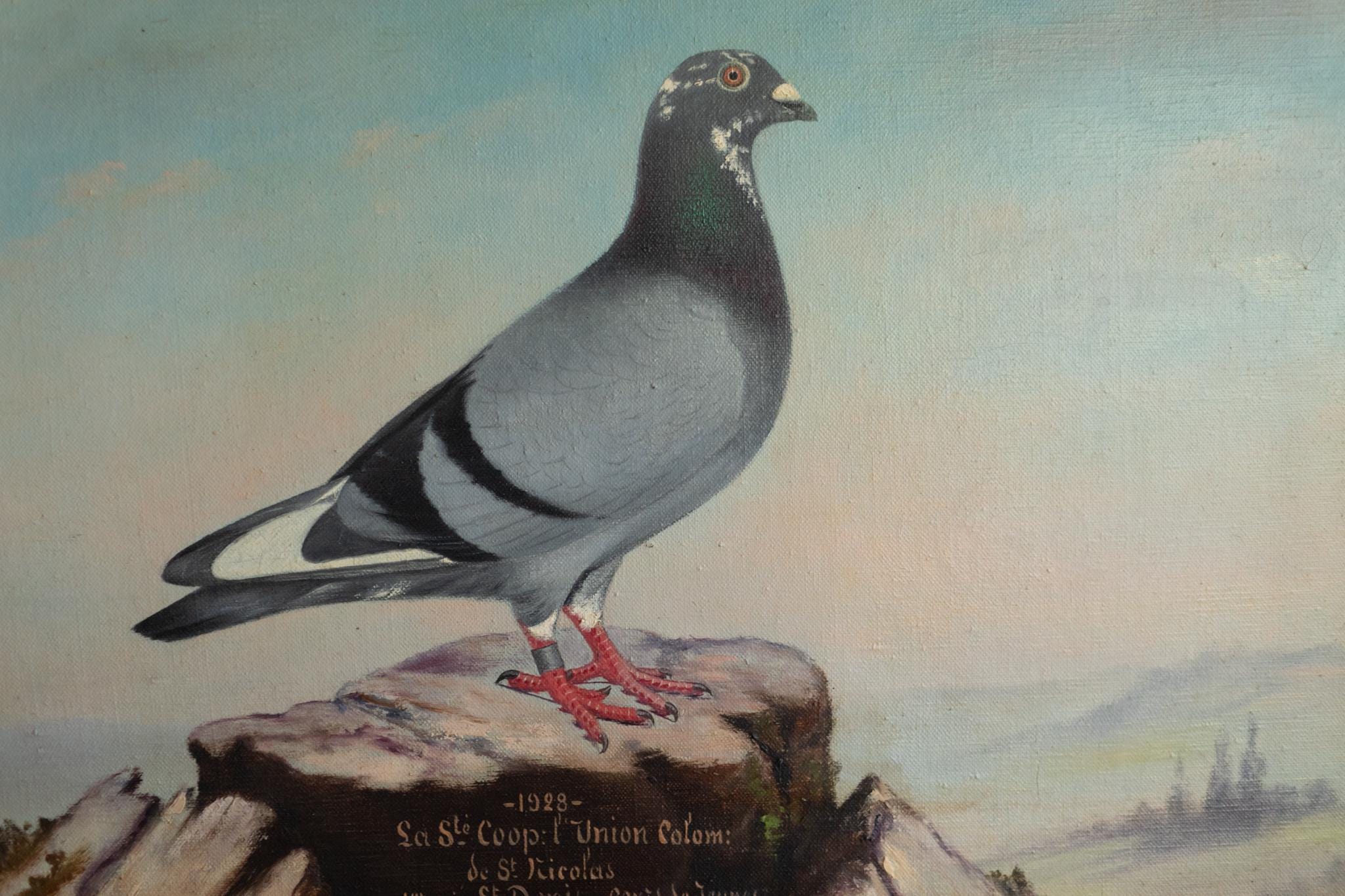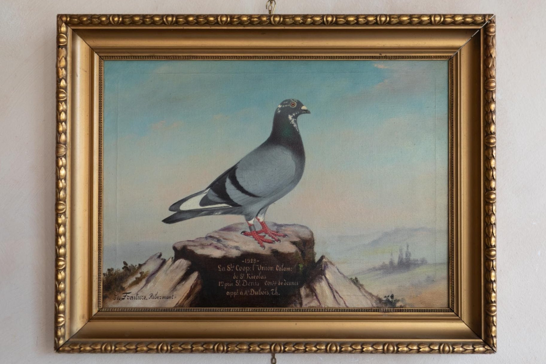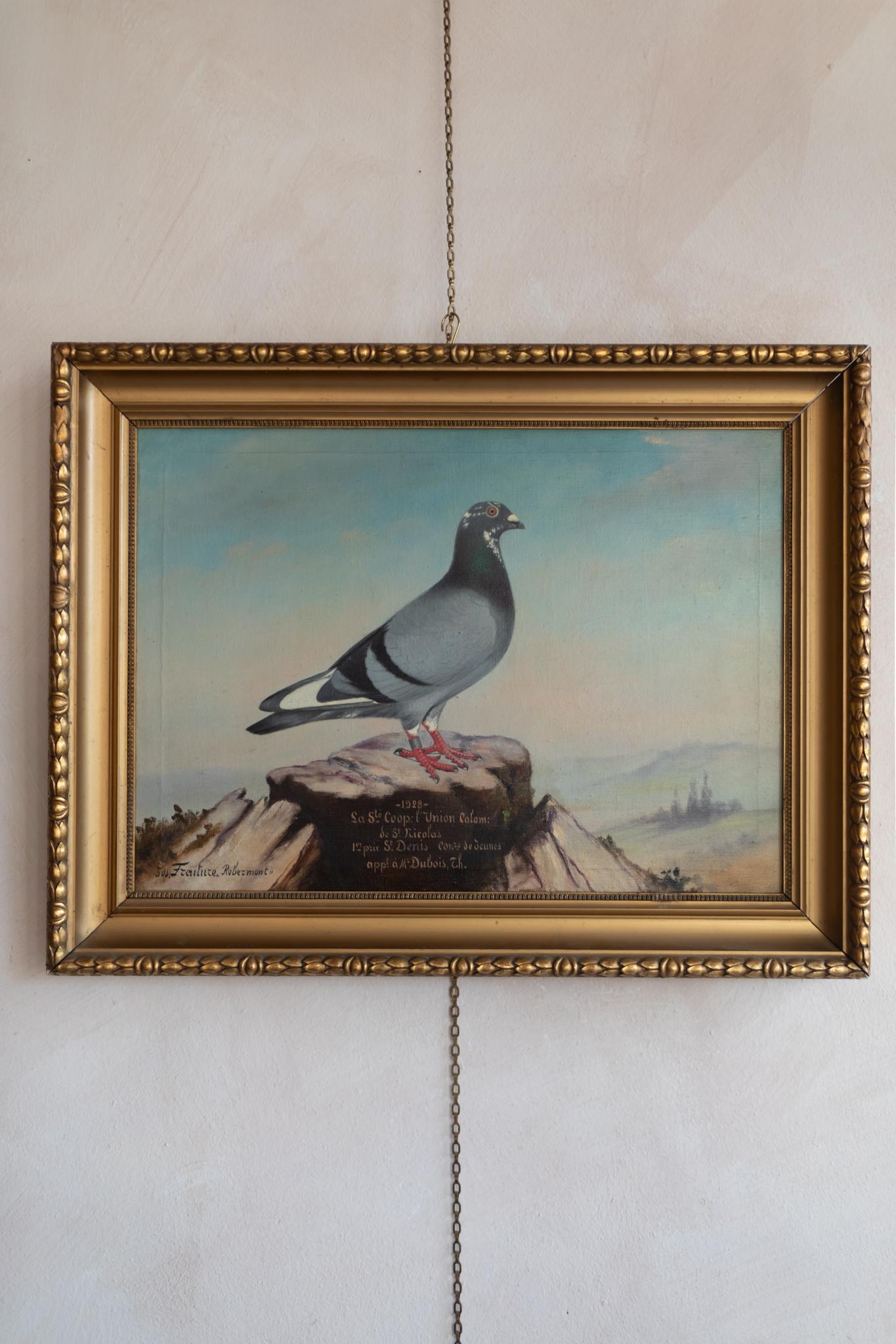 This antique folk art oil painting shows a very French prize pigeon, dating from 1928 and signed in lower left corner. This French racing pigeon has some of his winning races mentioned in underneath. This striking oil painting depicts a champion racing pigeon proudly posed on a rocky perch, with a soft landscape in the background. The detailed inscription below records the bird’s victories with the Union Colombophile of Saint-Nicolas, Belgium. Including a 1st prize at St. Denis (Paris), and names its owner, A. Dubois. Painted as a commemoration of sporting success, such works form part of a unique Belgian folk-art tradition, celebrating the prestige of prized racing pigeons. A highly collectible and historically significant piece for pigeon racing and folk art enthusiasts.