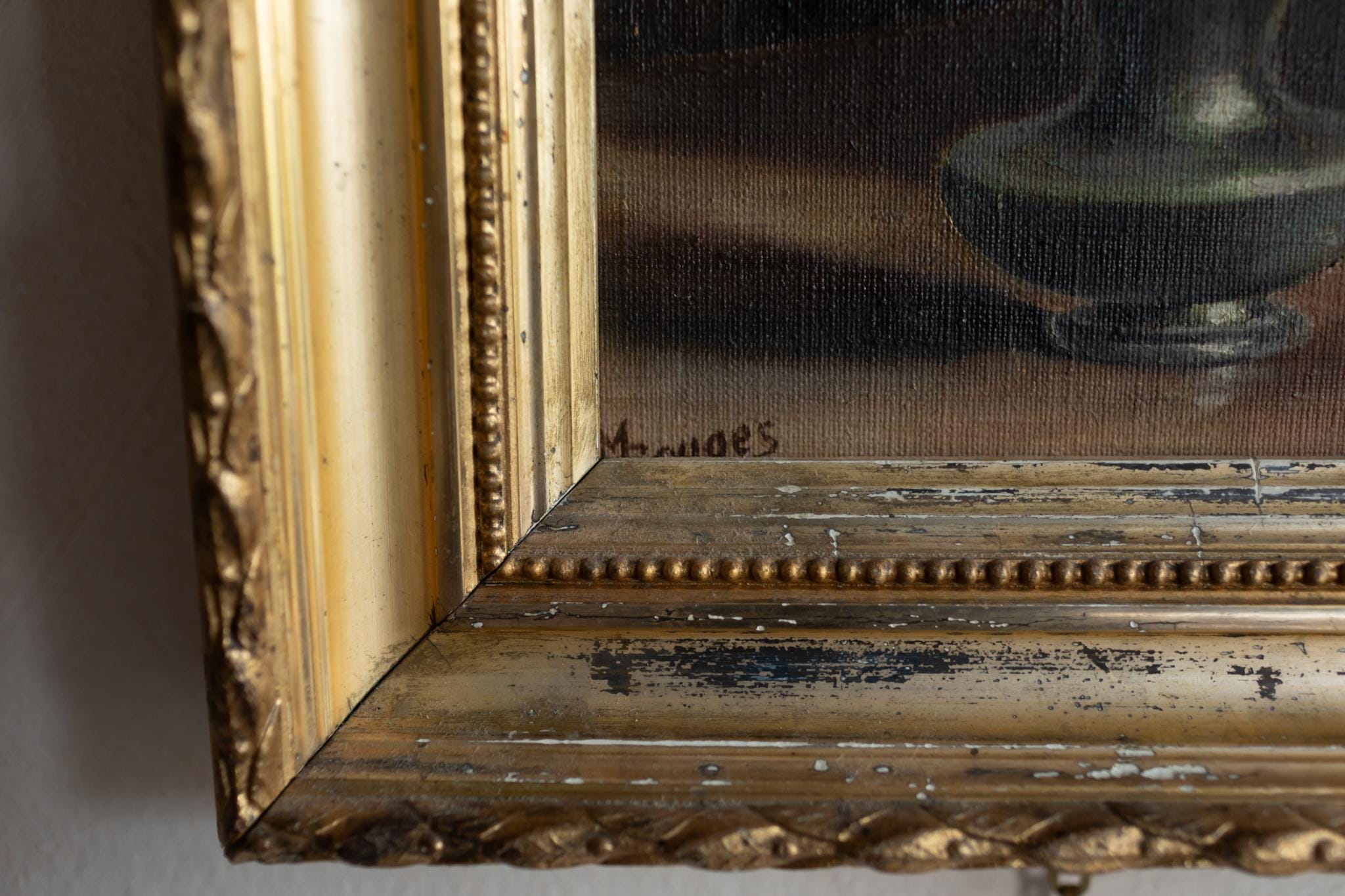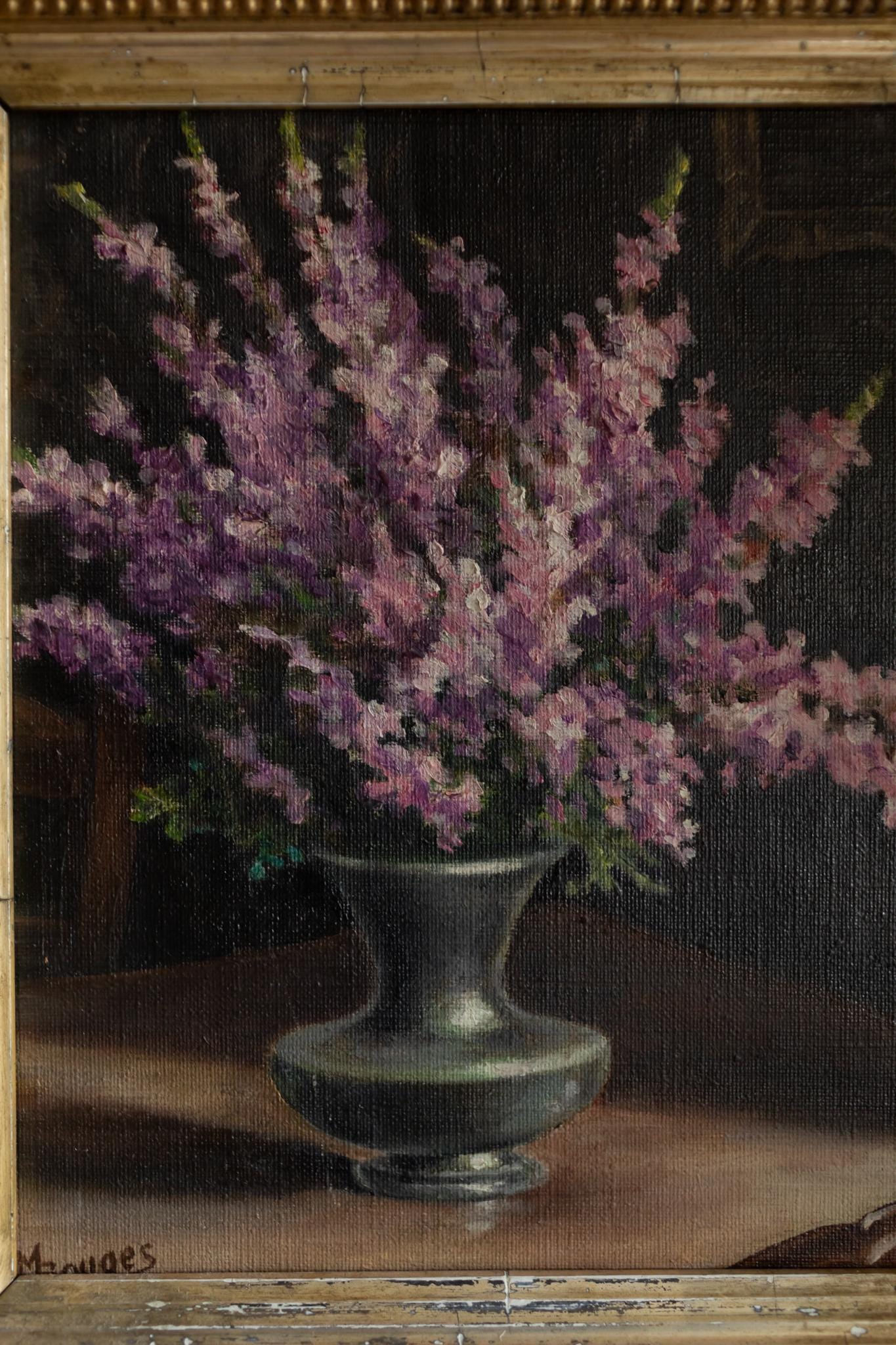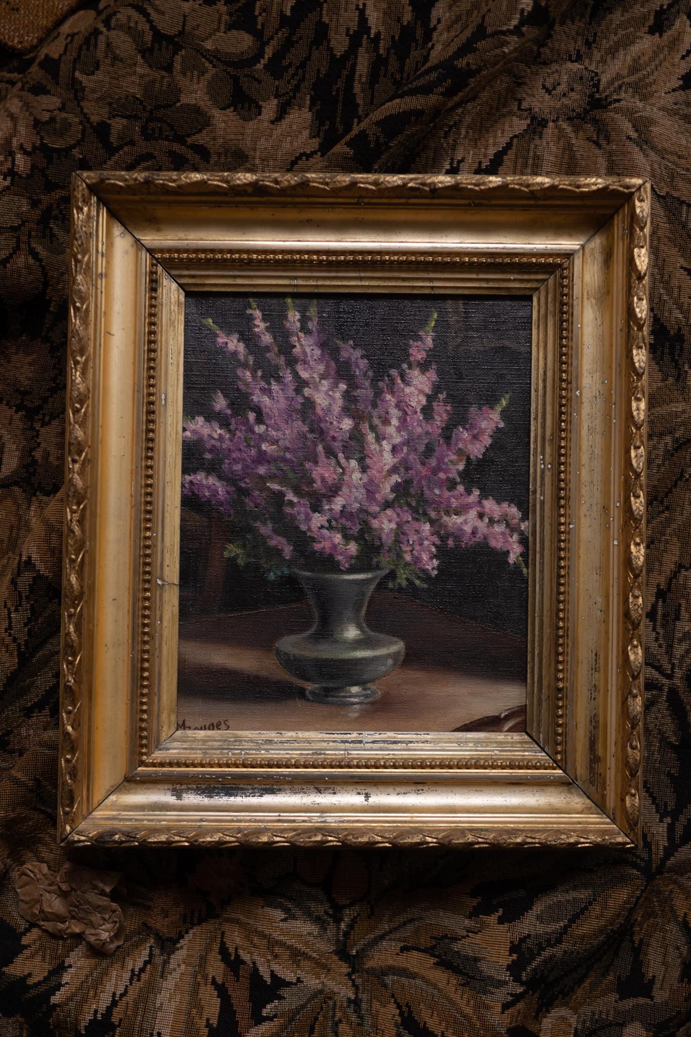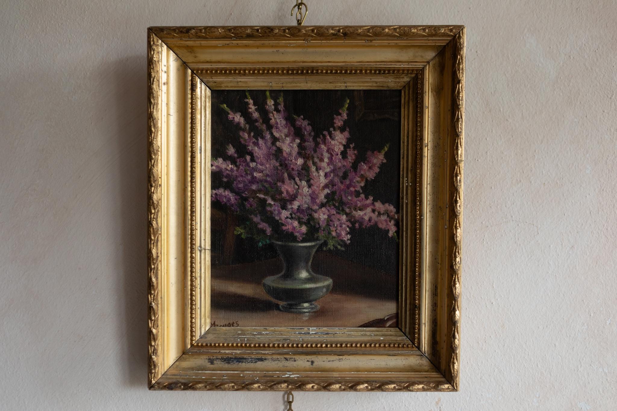 This French oil painting, dating from around 1940, presents a lush bouquet of lilacs arranged in a classical dark vase. Set against a subdued interior background, the delicate purples and pinks of the blossoms are emphasised through skilful contrasts of light and shadow. The composition reflects the enduring French tradition of floral still lifes, prized for their decorative appeal and technical precision. While rooted in academic realism, the looser brushwork suggests an early to mid 20th-century hand with a modern sensibility. Framed in an ornate gilt surround, the piece conveys both elegance and freshness, celebrating the timeless beauty of flowers in bloom.