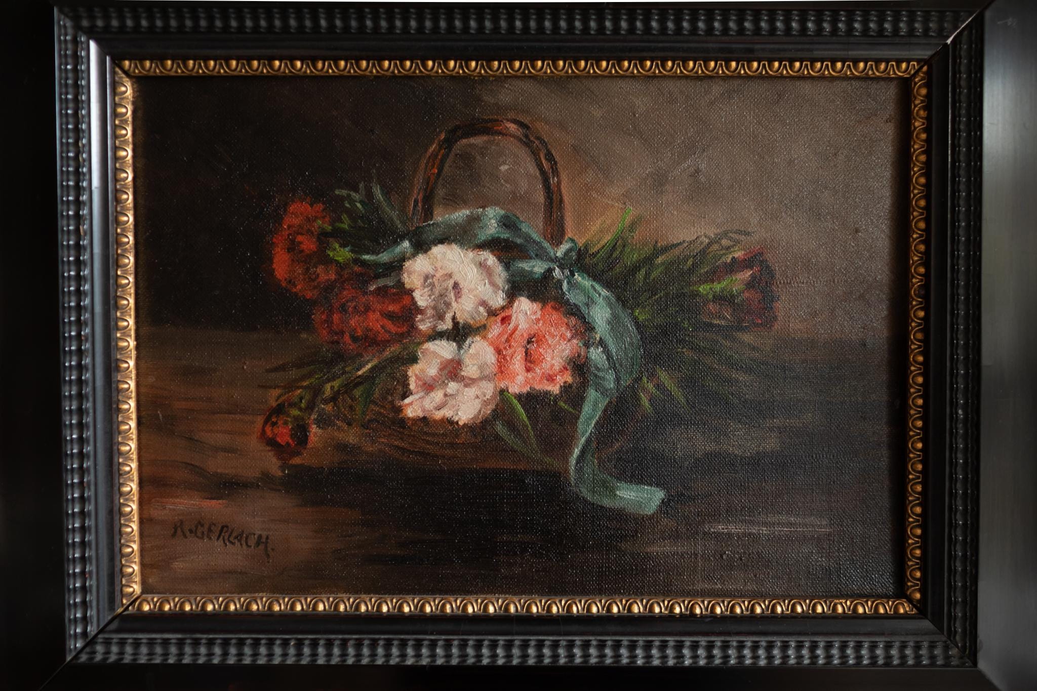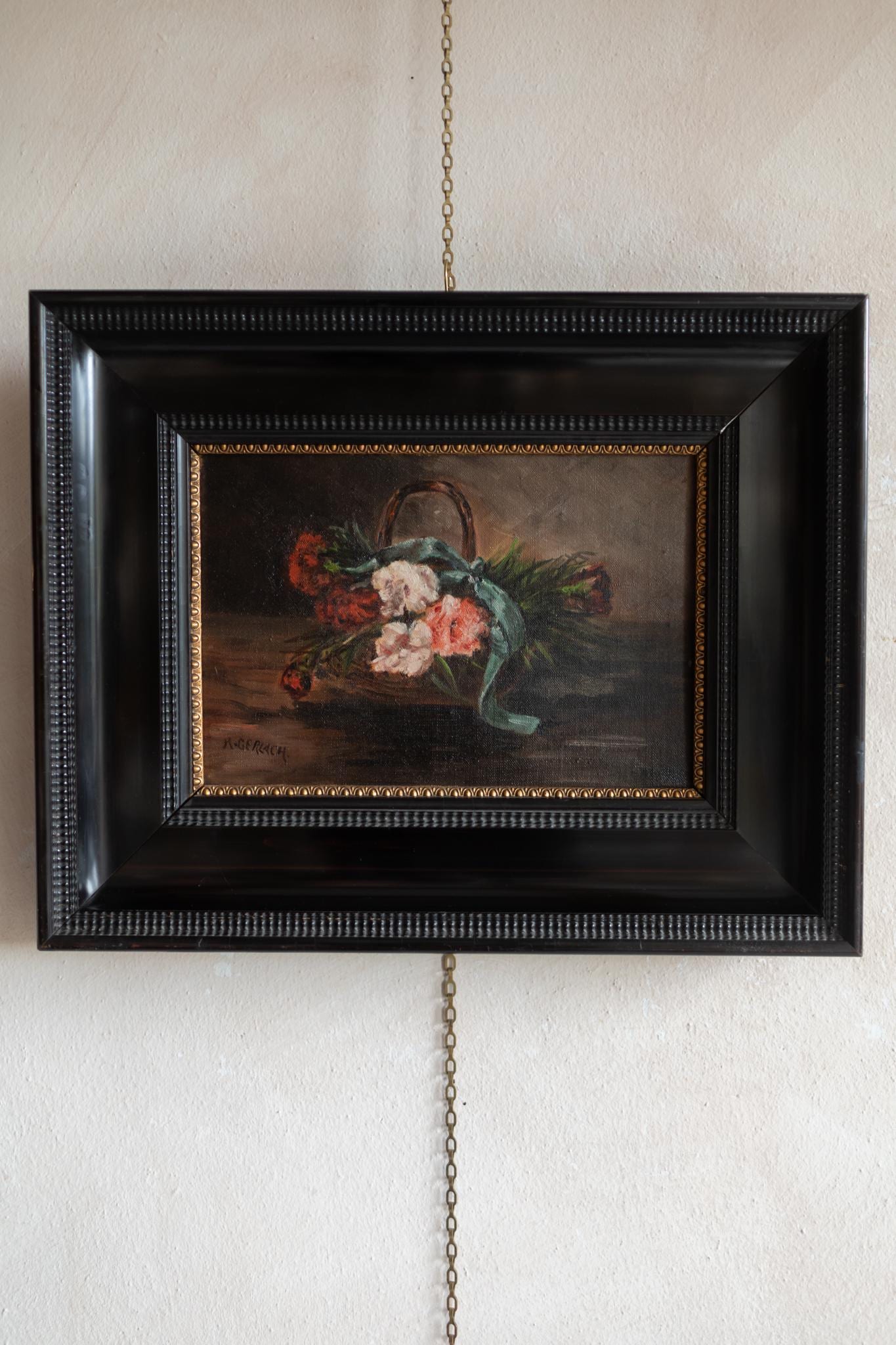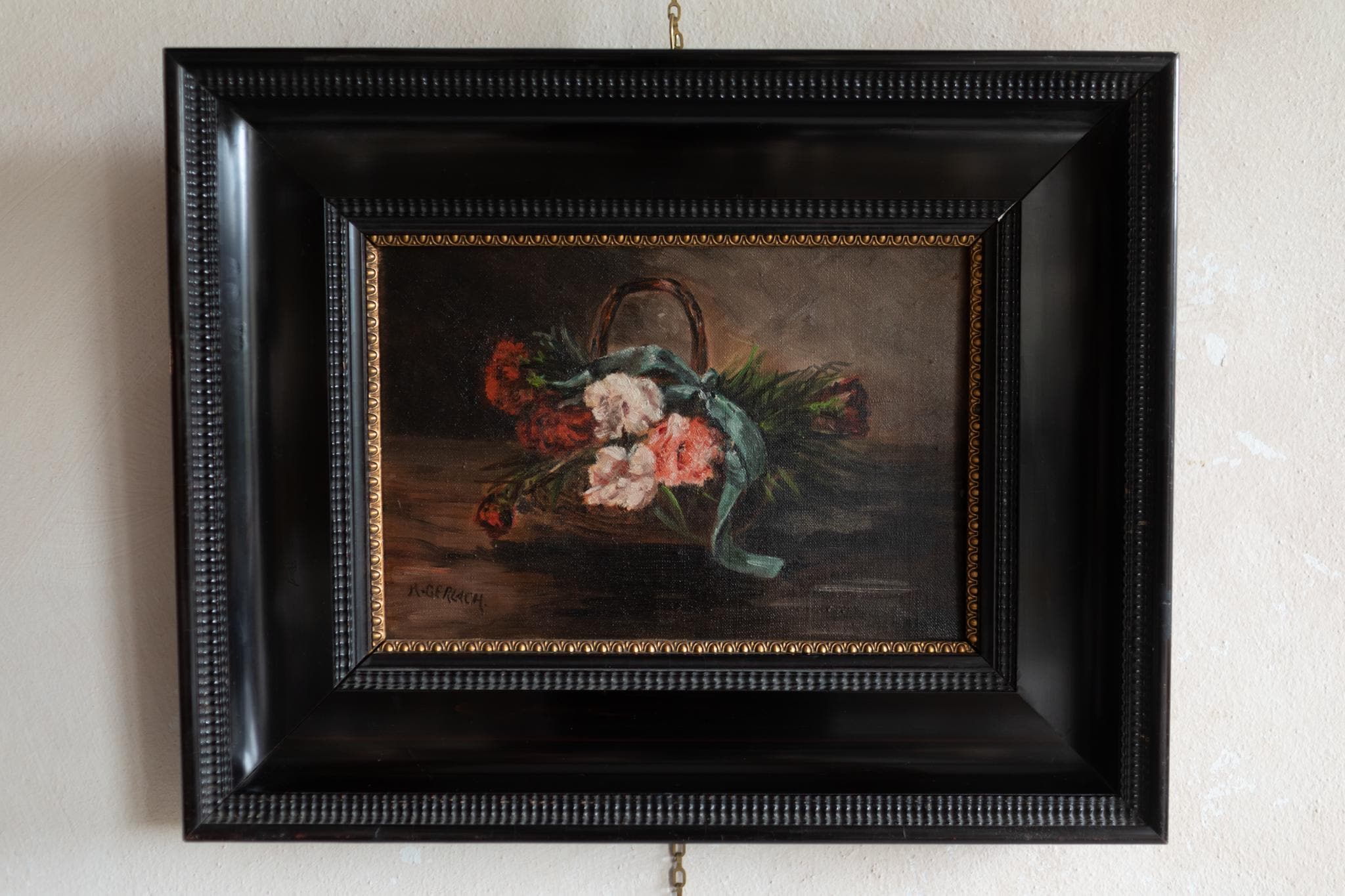 A charming early 1900s Dutch oil painting depicting carnations in a basket, signed at lower left. Depicting carnations arranged in a wicker basket tied with a soft blue ribbon. The red and white blossoms, symbols of love and admiration, are painted with lively brushwork against a warm, muted background. The piece reflects the enduring Dutch tradition of floral painting, reinterpreted in a more intimate and decorative format.