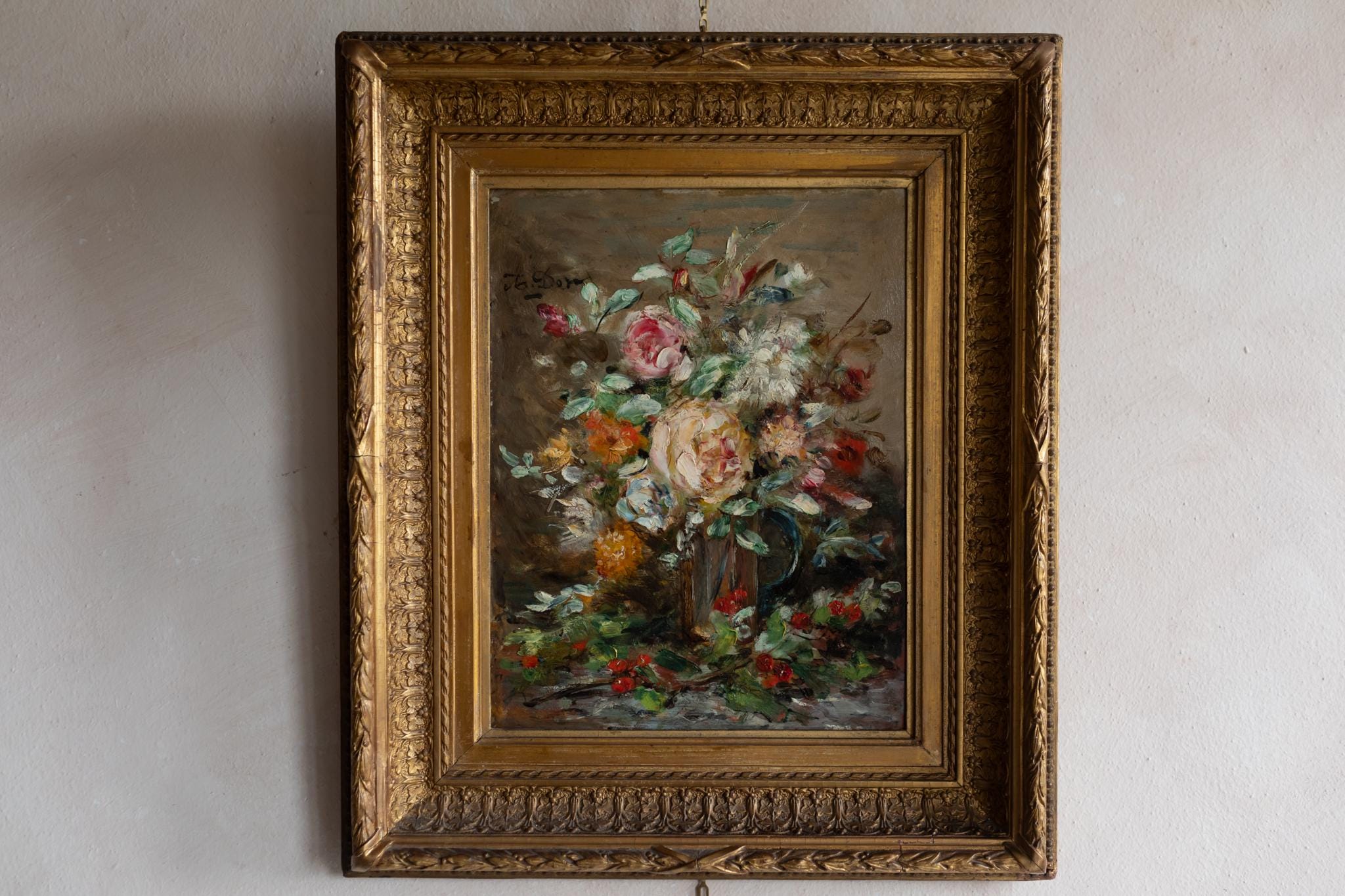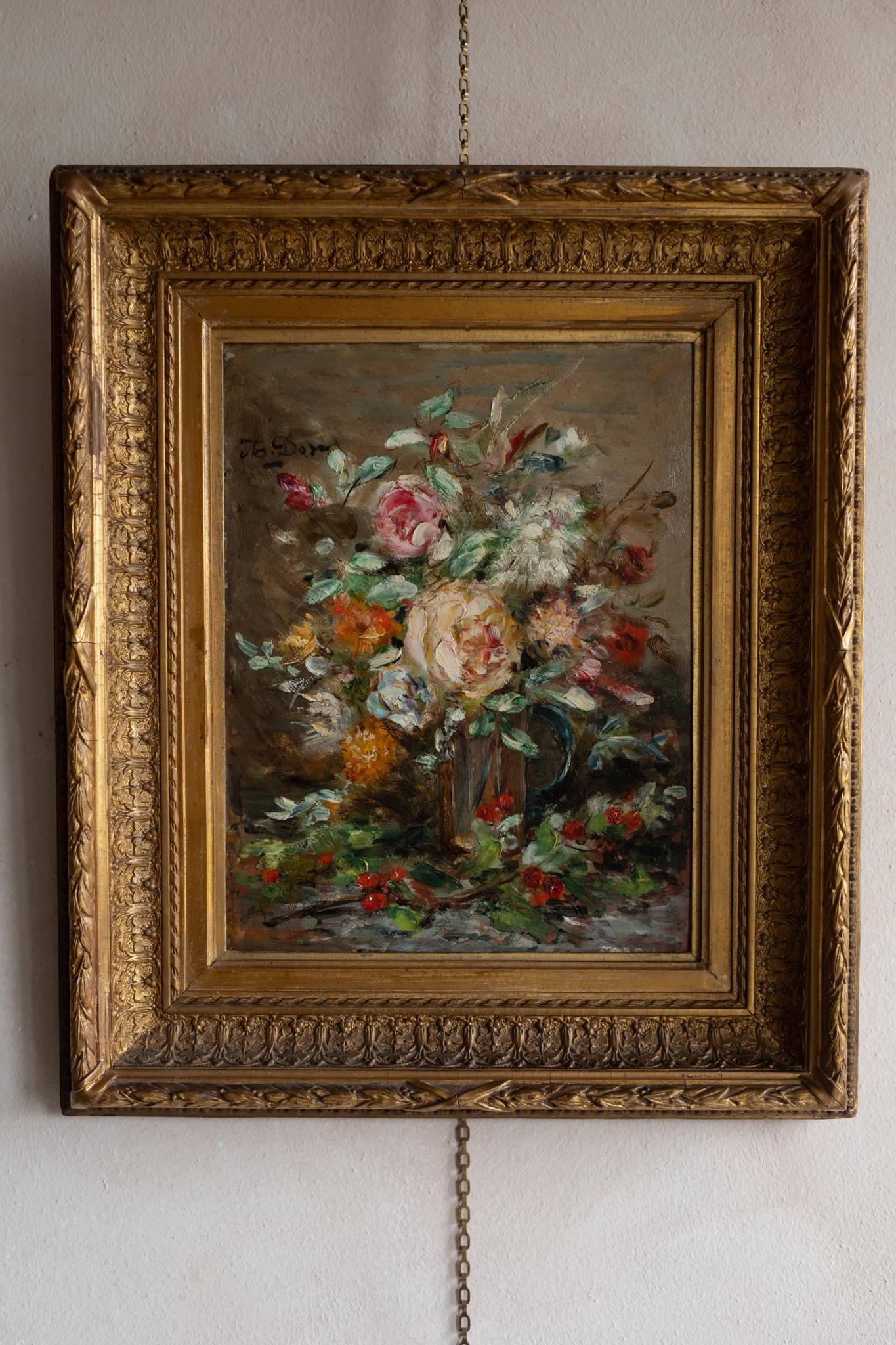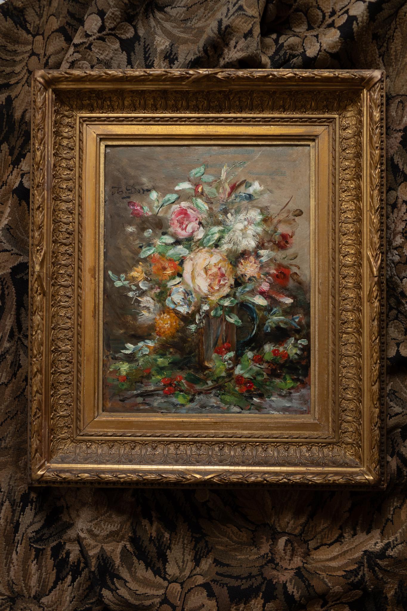 A charming French floral still life dating to around 1890, signed A. Duvel. This original oil on canvas captures the spirit of the late Impressionist era with its loose, energetic brushwork and luminous palette. Roses, peonies, and garden blooms are arranged in a rustic vase, painted with quick strokes that suggest movement and life rather than strict detail. The artist’s choice of vibrant reds, pinks, and creamy whites contrasts beautifully against the earthy background, creating a sense of depth and atmosphere. An elegant antique gilt frame completes the piece, making it ready to hang and enjoy.