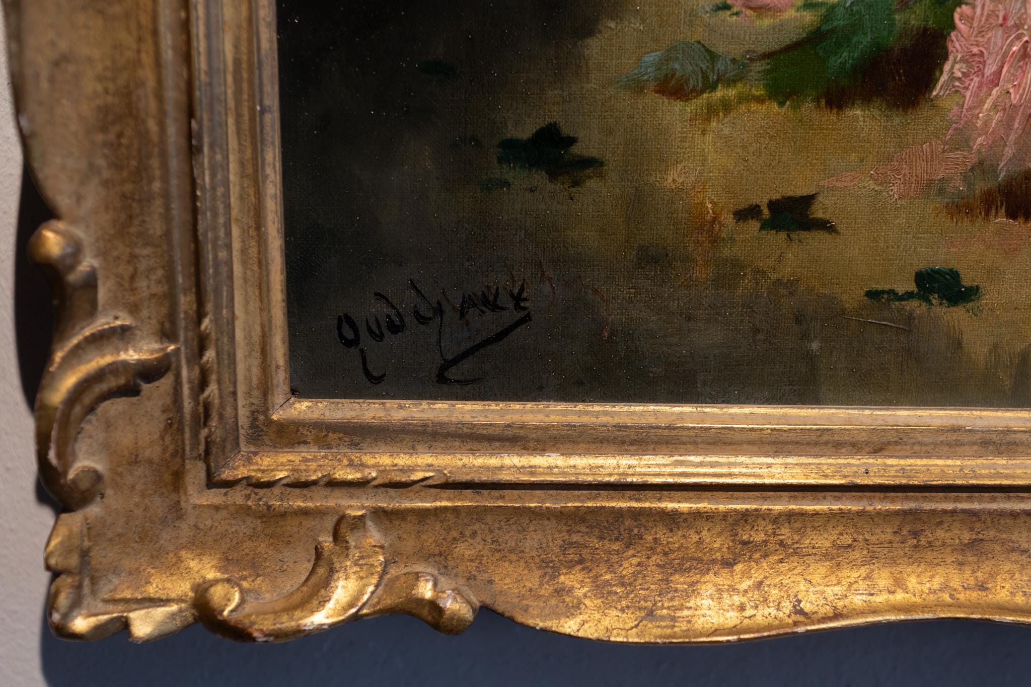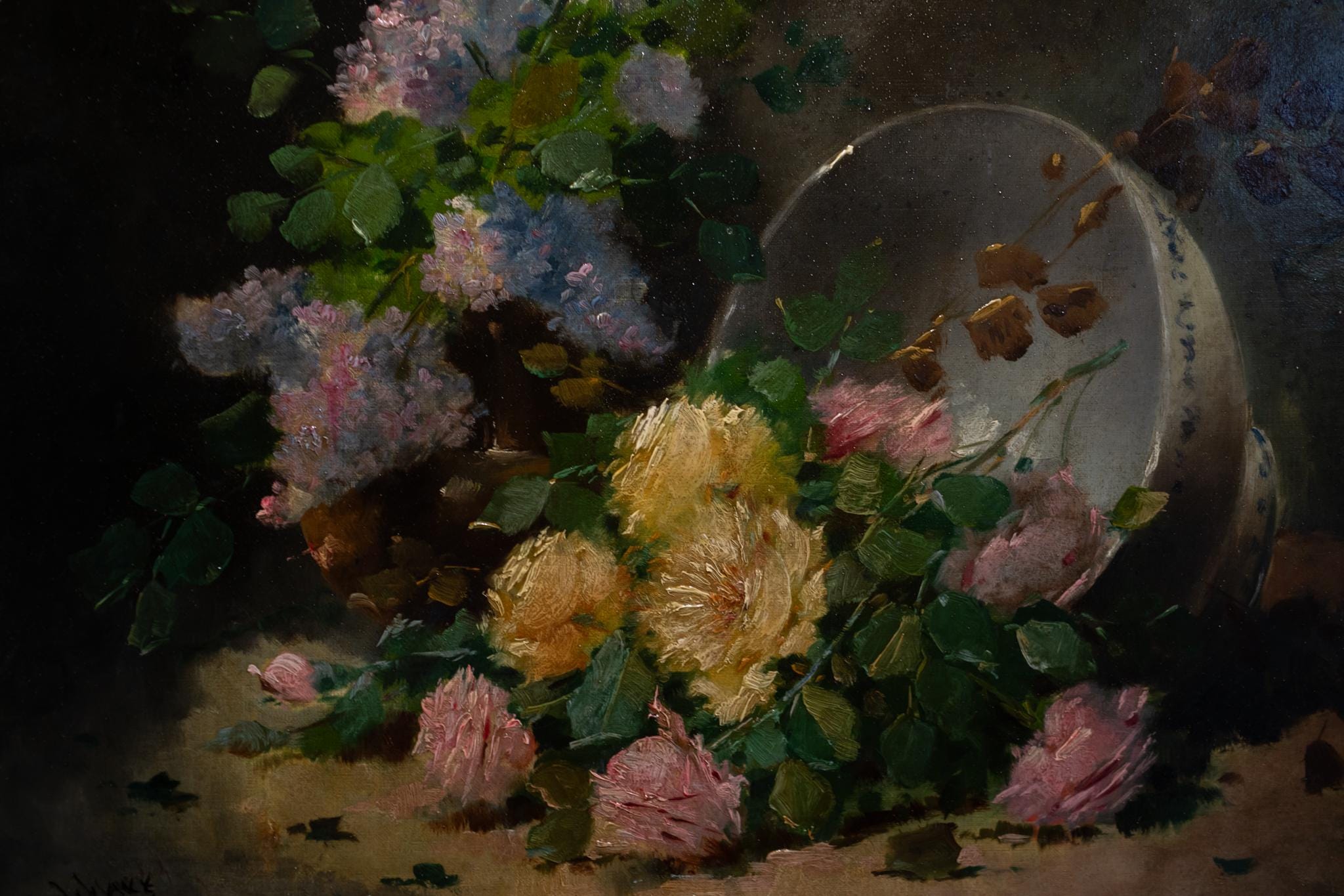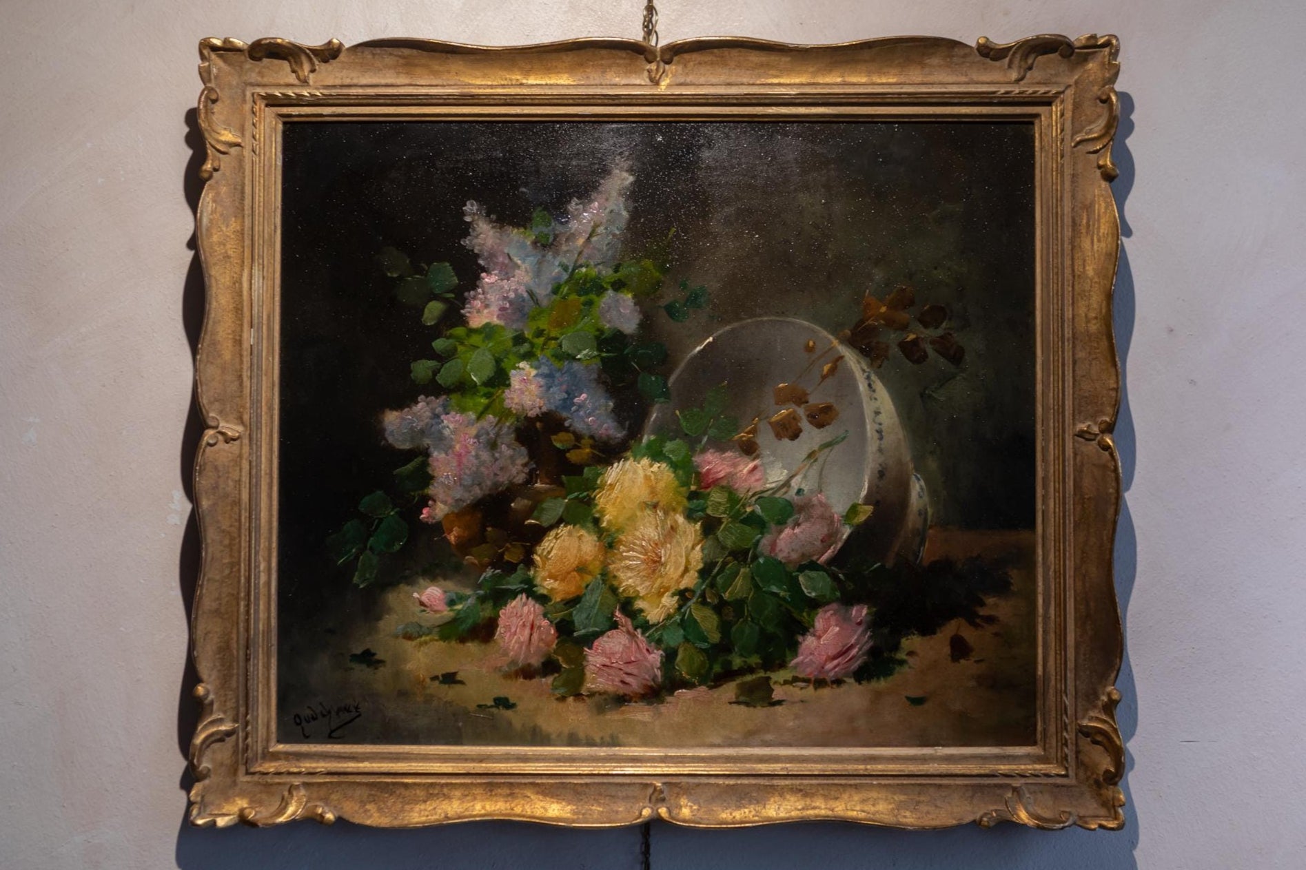 An original antique oil painting by French artist Émile Godchaux (1860–1938), depicting a rich floral still life with an overturned vase. A striking and collectible work from a celebrated painter of the Parisian Belle Époque.
