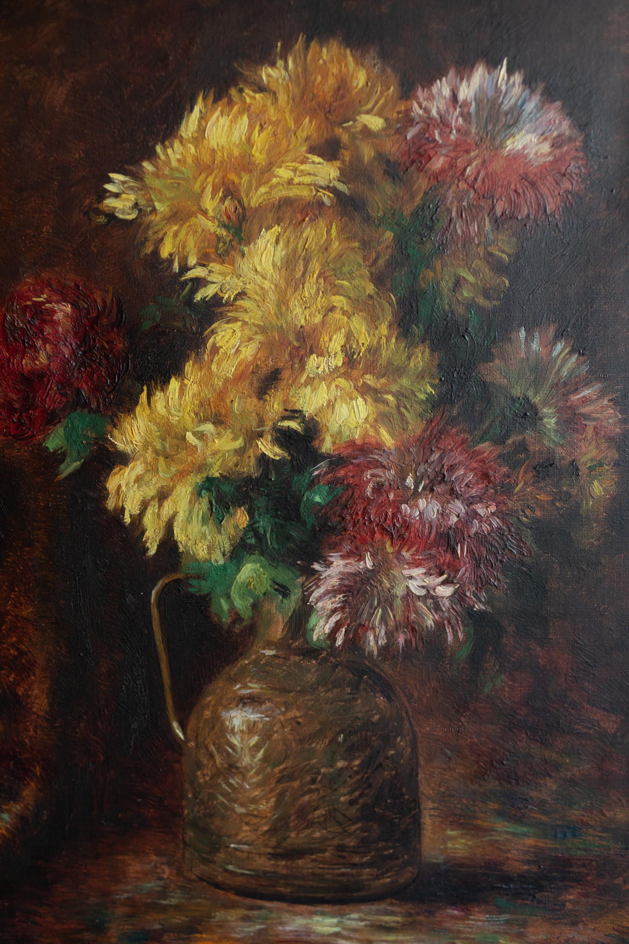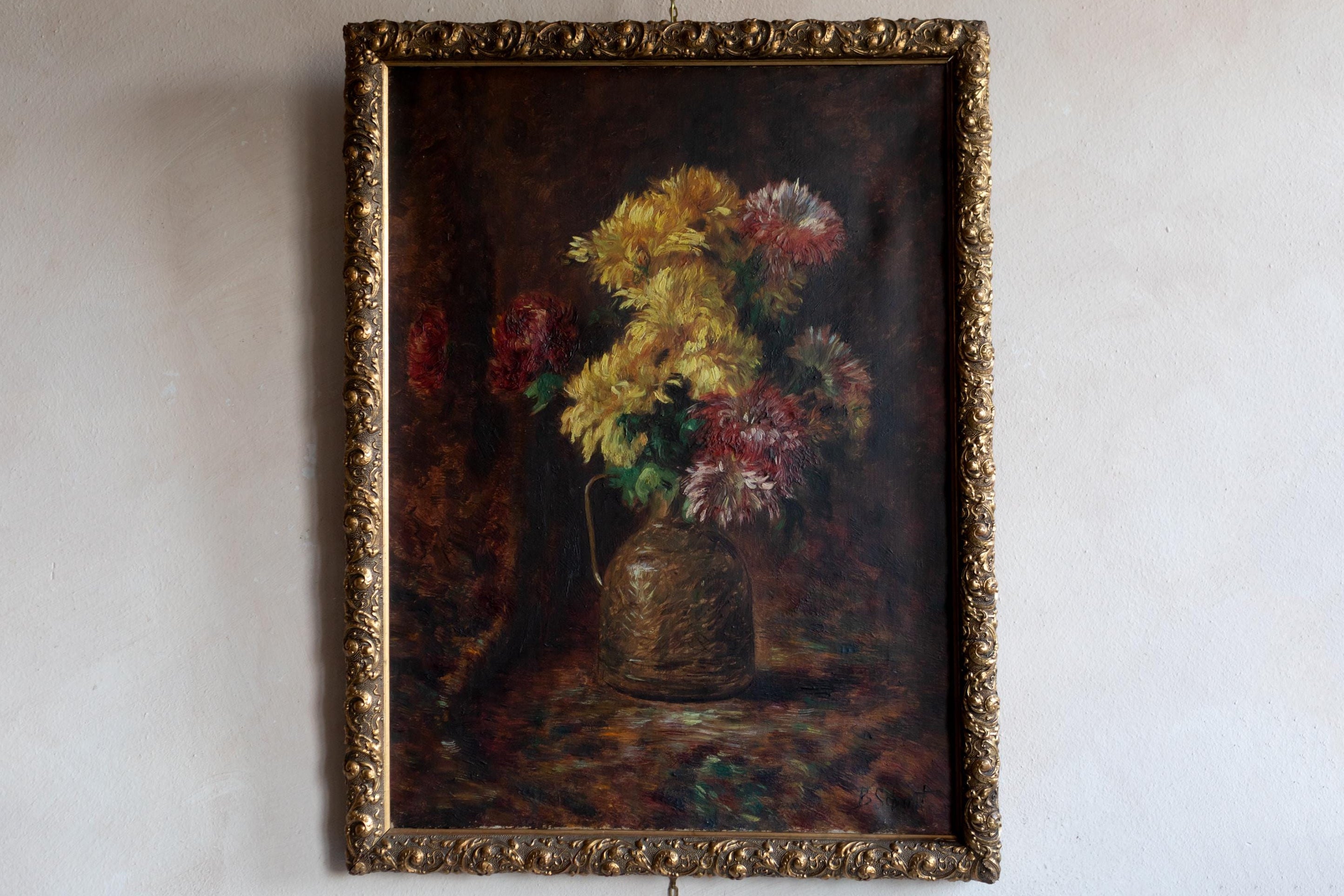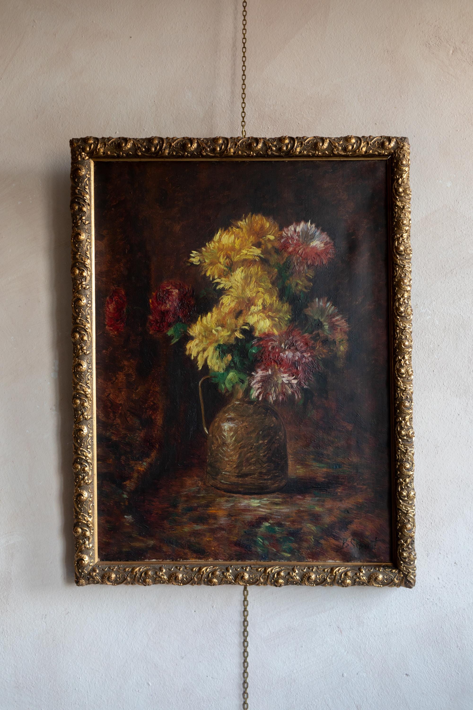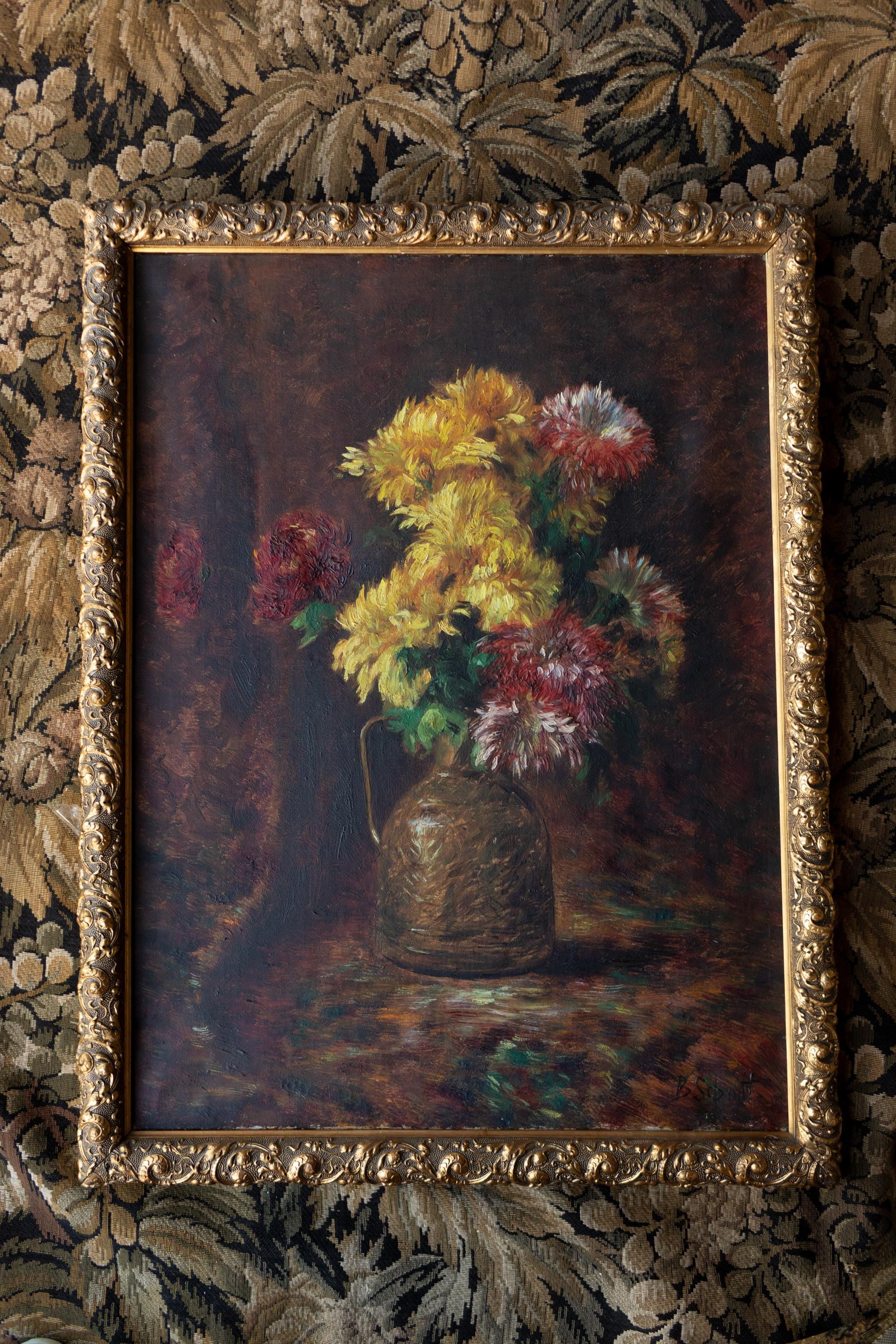 A rich and atmospheric French floral still life dating from around 1900, painted in oil with warm colour and expressive brushwork. Decorative and timeless, this elegant work is presented in its original gilt frame. This beautifully composed floral still life depicts a bouquet of chrysanthemums arranged in a rustic vessel, set against a deep, shadowed background. Golden yellows, soft reds, and muted greens are layered with confidence, creating a composition that feels both abundant and intimate.