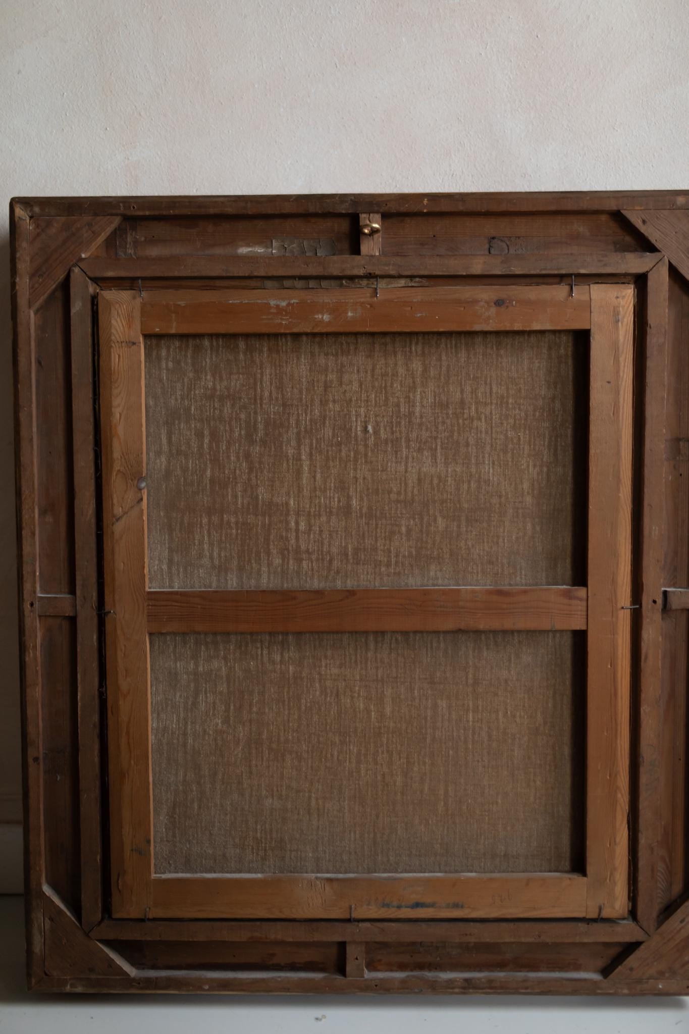 The painting and frame are in good antique condition with light age and surface wear consistent with age. Paint surface is stable and clean. Frame retains its original gilding with expected patina and minor wear. The painting is housed in a large, richly ornamented gilt frame, whose sculptural corner details and warm patina enhance the decorative impact of the work and underscore its period character.
