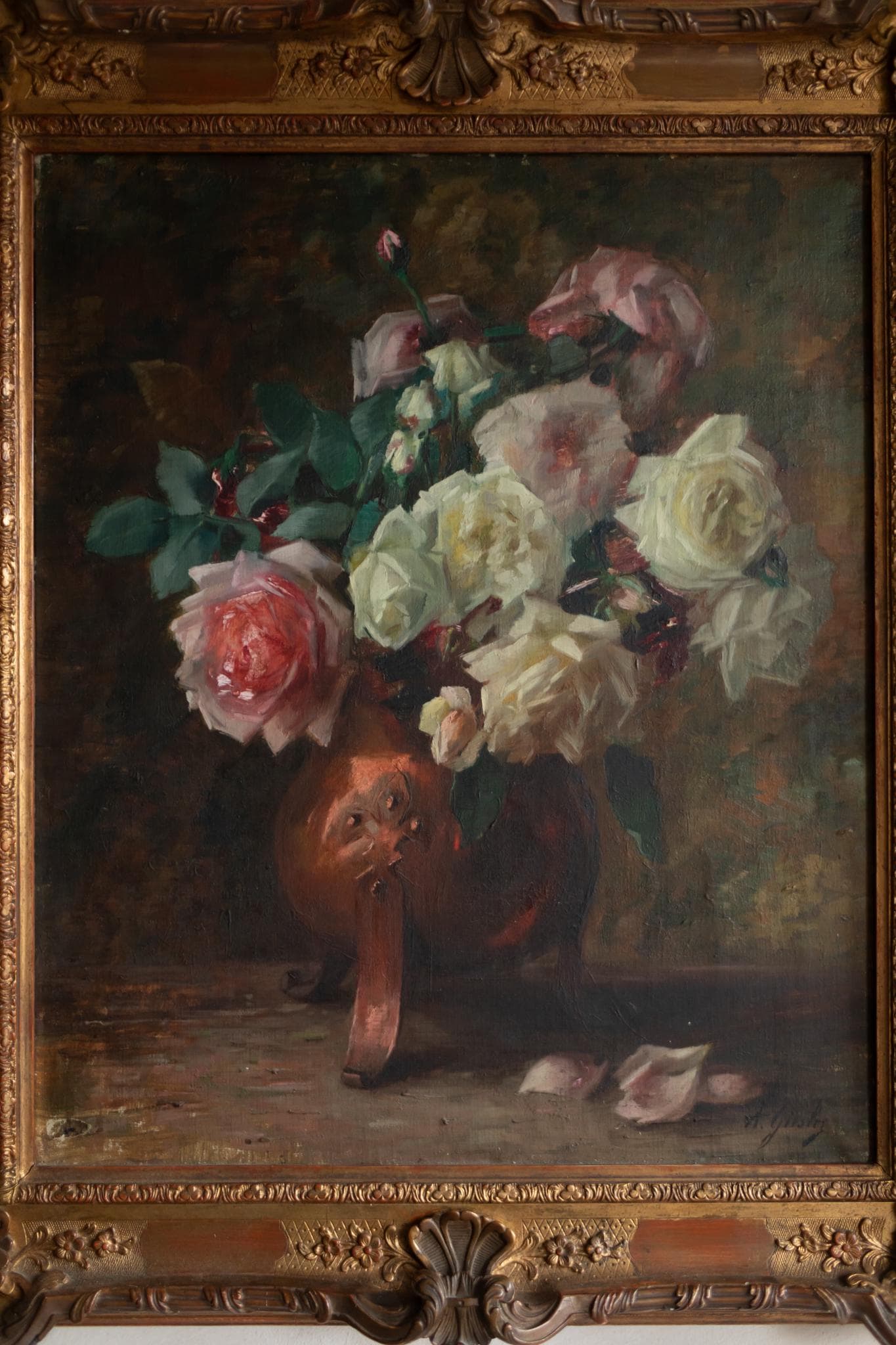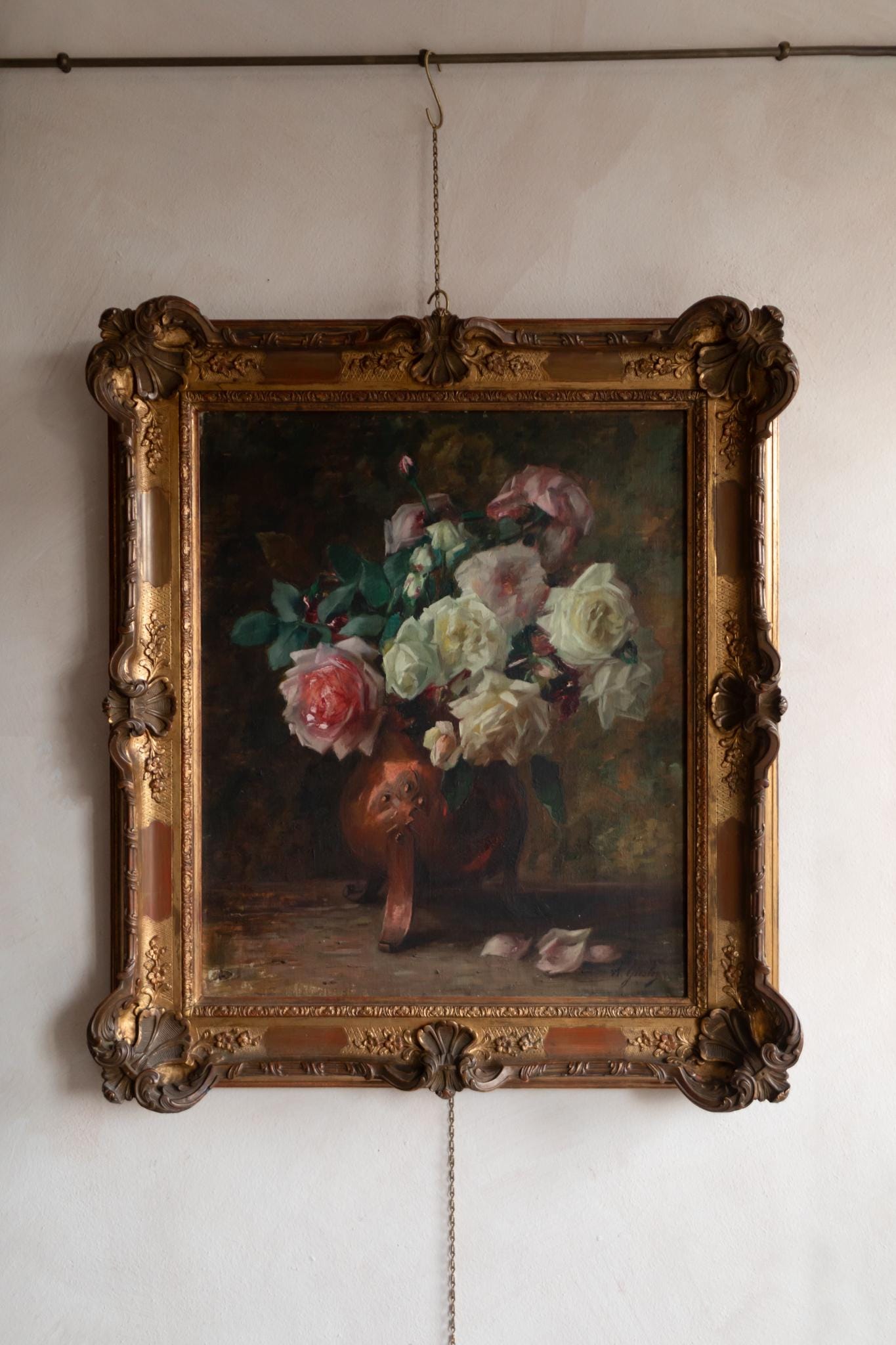Painted around the turn of the century, the work reflects the continuation of Impressionist influence into studio still life, where artists focused on painterly surface, colour harmony, and atmosphere rather than strict botanical detail. Brushwork is confident and expressive, particularly in the handling of petals and foliage, while the dark, softly modulated background allows the bouquet to glow forward.