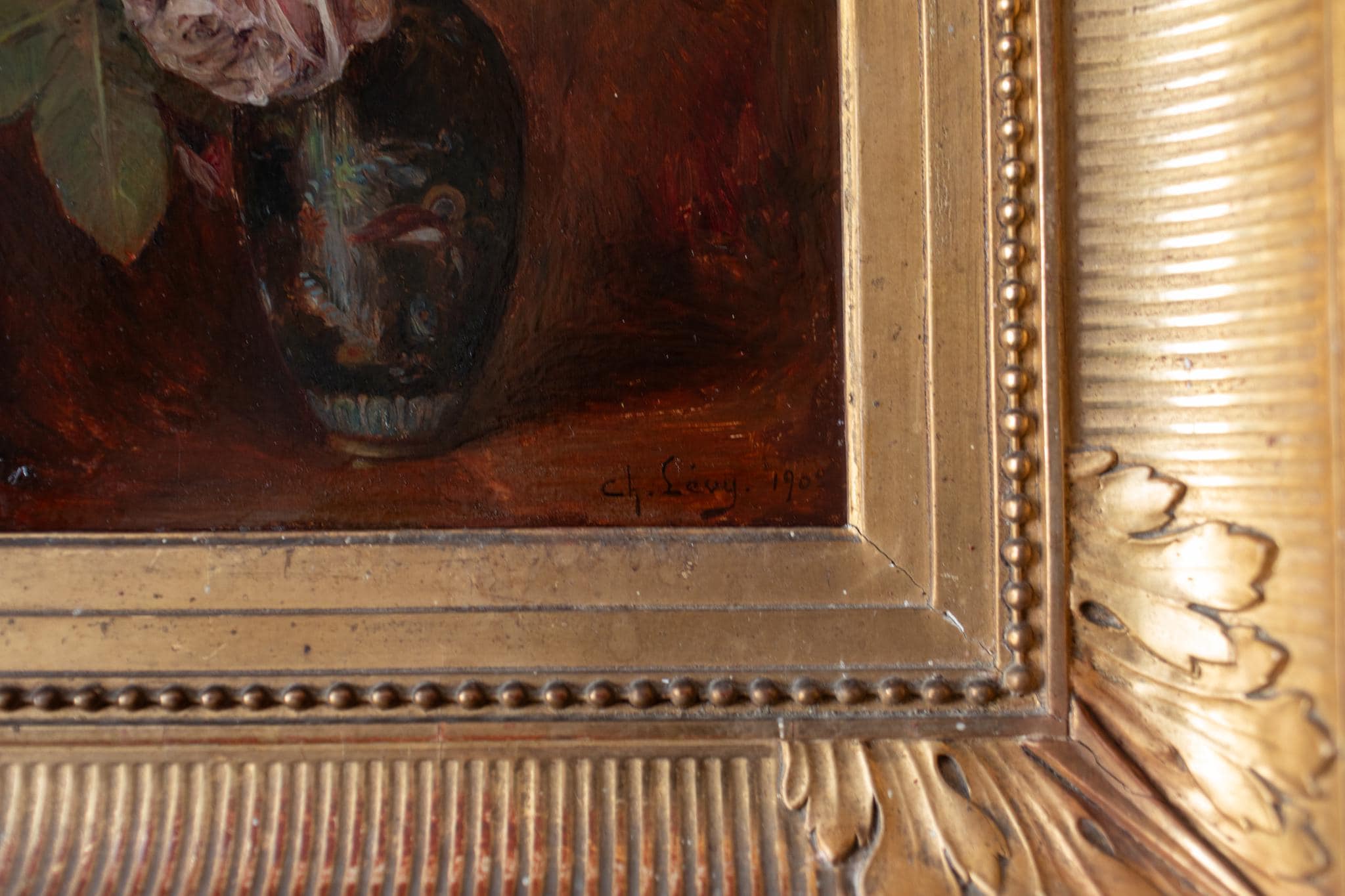 Dated 1909 French Impressionist Floral Still Life. Signed “Ch. Levy”. Oil Painting in Gilt Frame