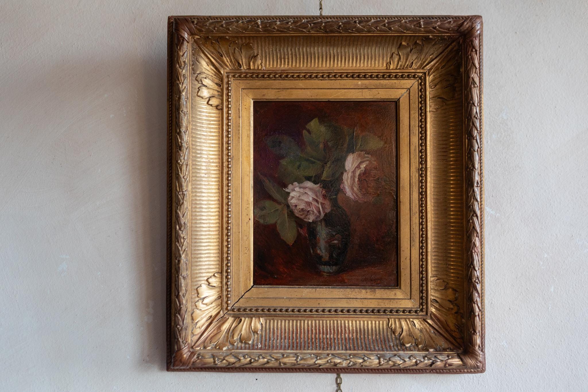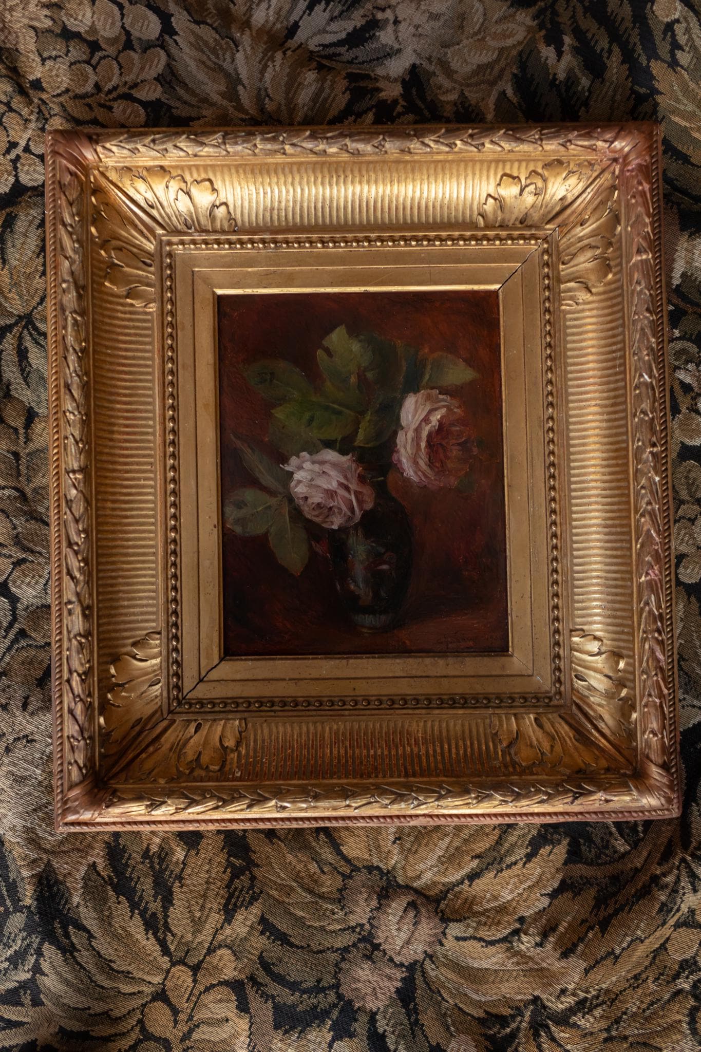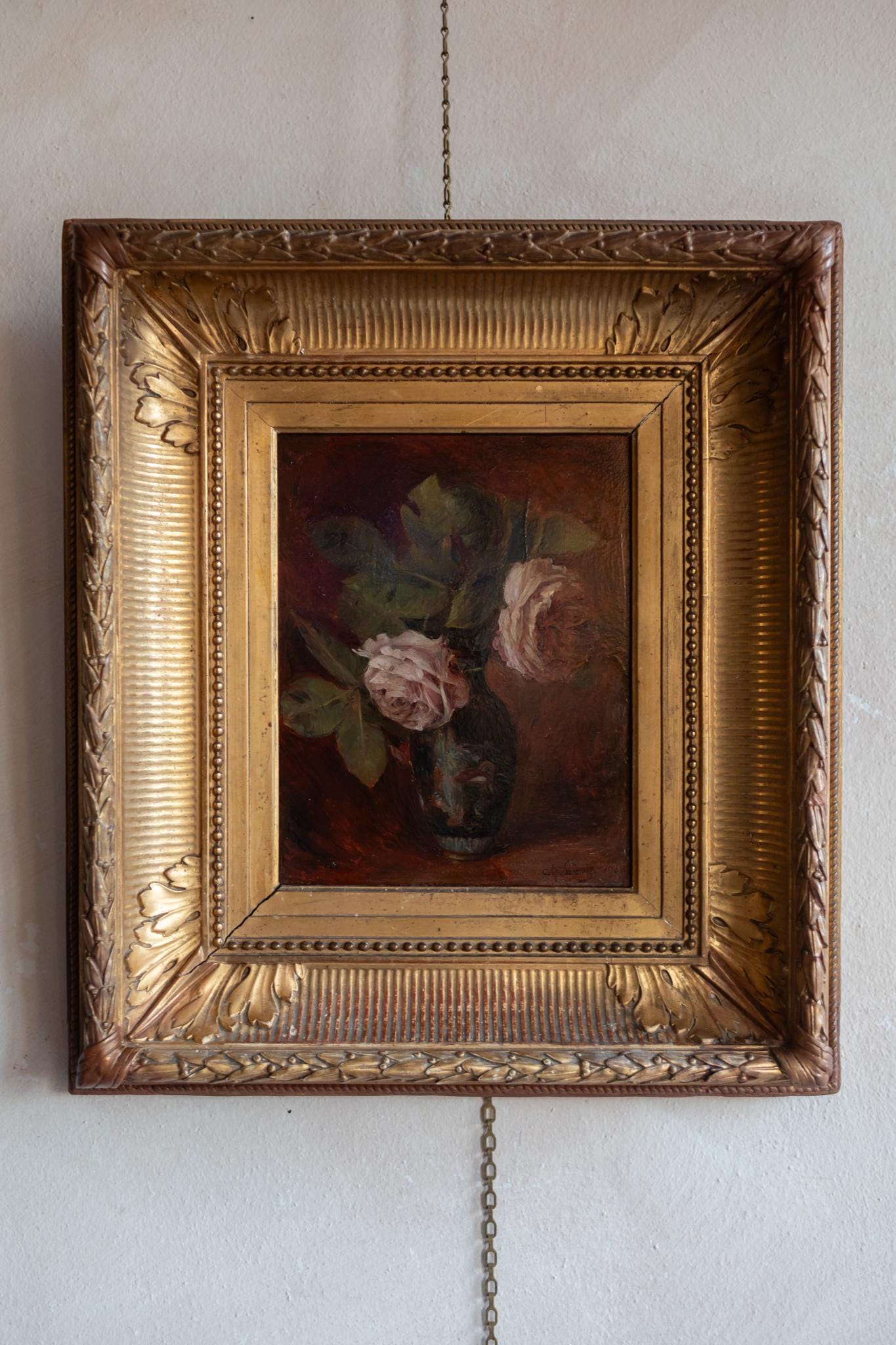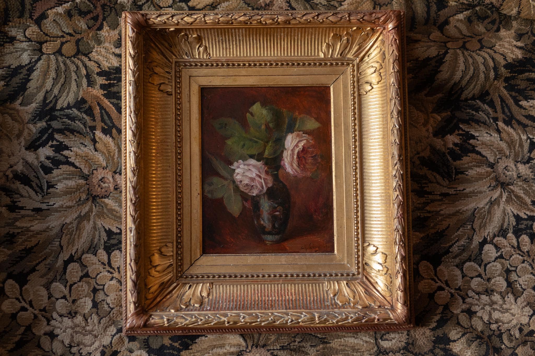 This refined floral still life depicts pale pink roses arranged in a dark vessel, set against a warm, shadowed background. The composition is intimate and restrained, allowing colour, texture, and brushwork to carry the visual weight rather than strict detail. Dated 1909, the painting sits squarely within the period when Impressionism had moved beyond plein-air landscapes into more personal, studio-based subjects such as flowers and still lifes. The artist employs loose, confident brushwork and softened edges, allowing the blooms to emerge gradually from the surrounding tones rather than being sharply defined.