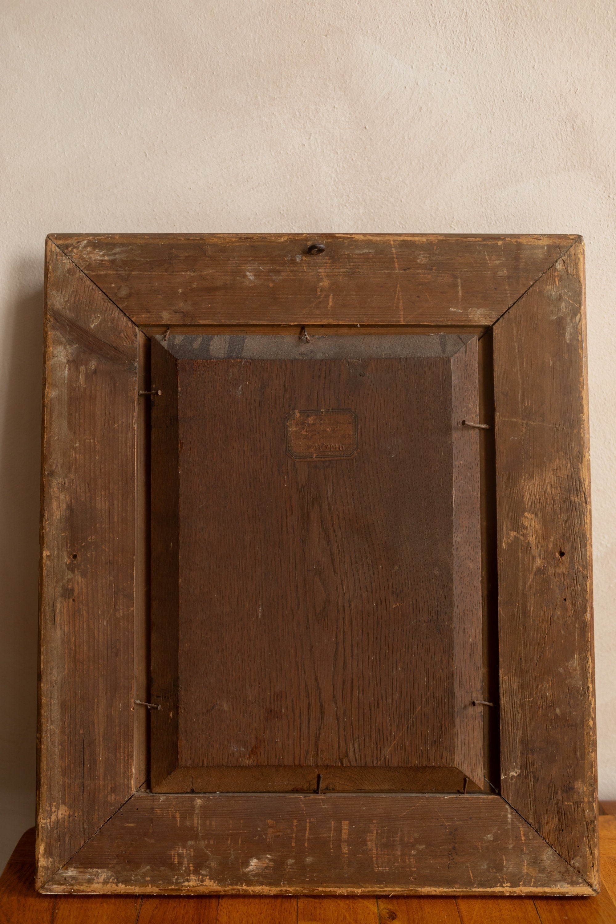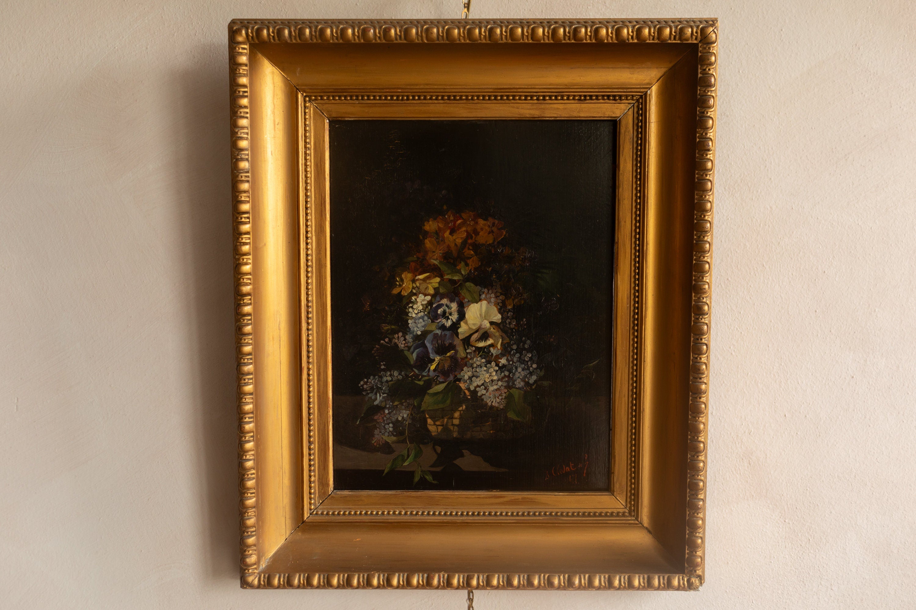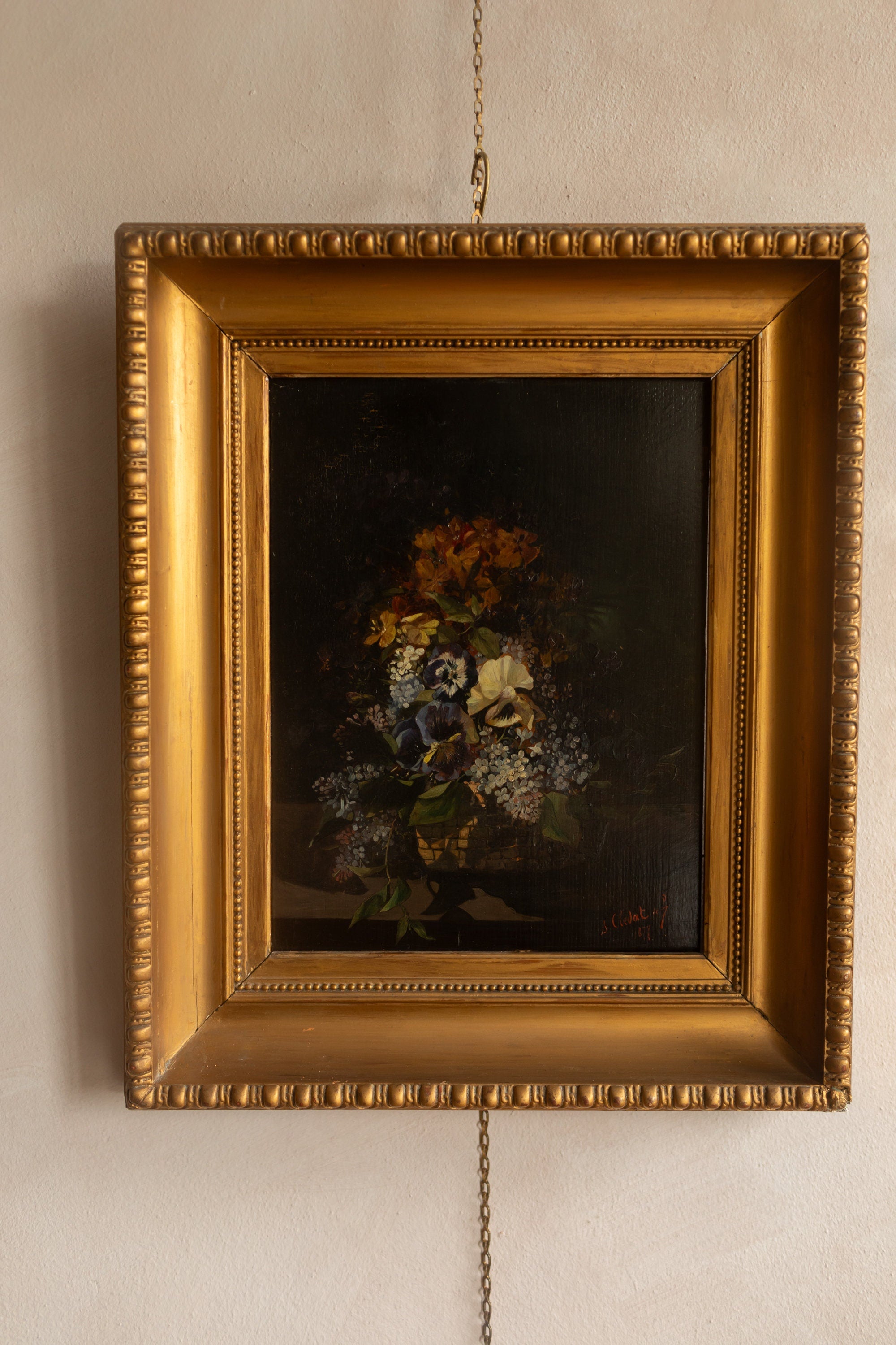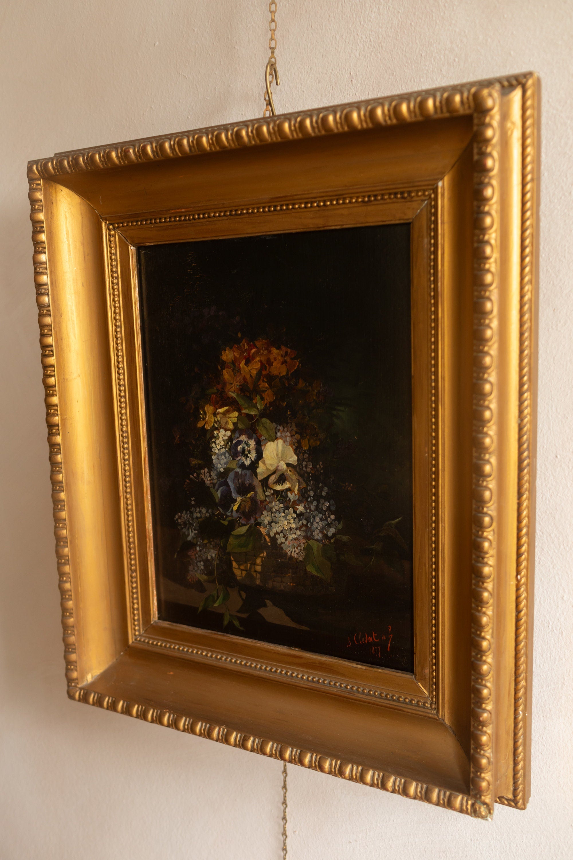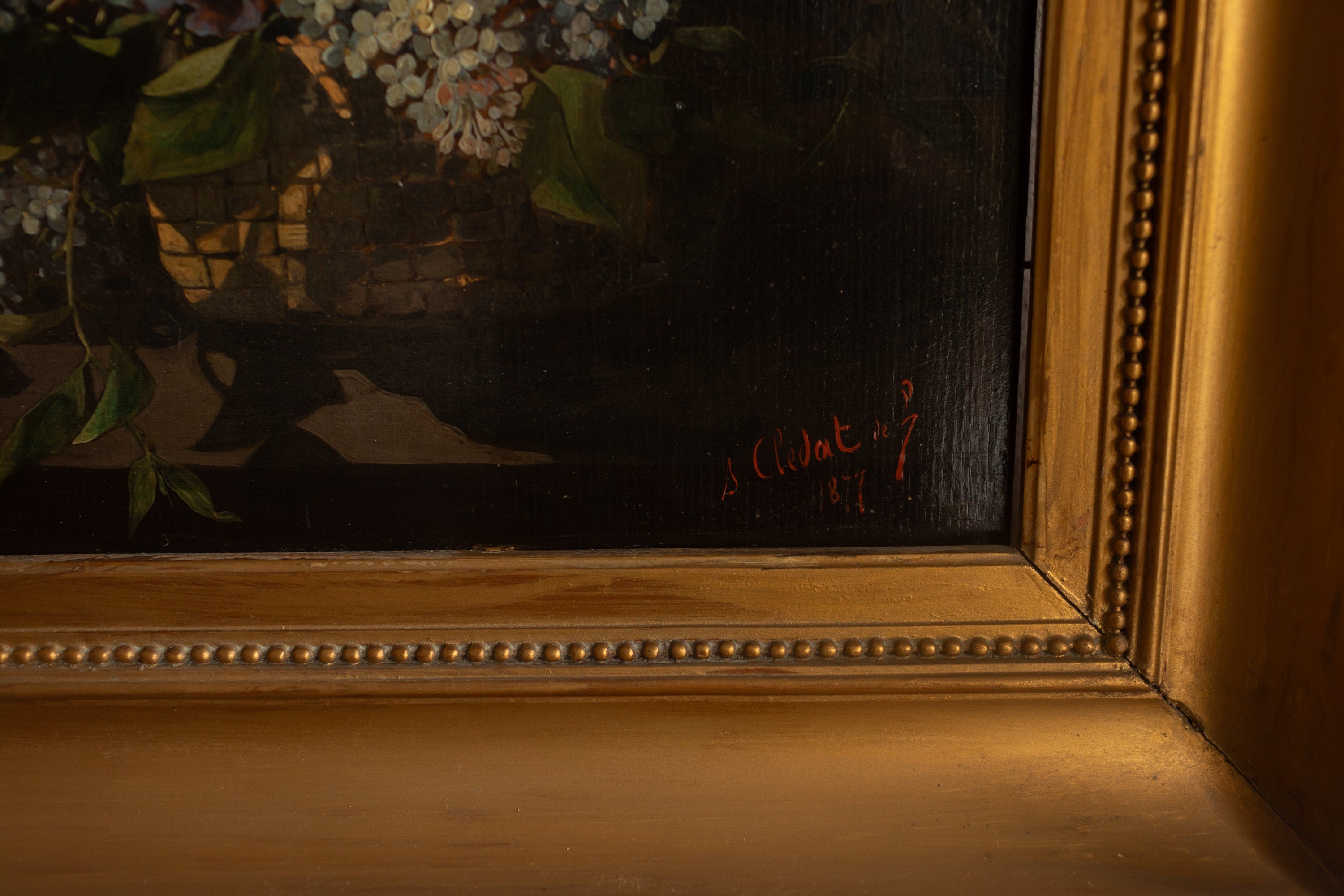 19th Century Large French Antique Floral Still Life Painting - Oil Paint on Panel by Samuel-Marie Cledat de Lavignerie. Dark & Moody. Signed and Dated in lower right corner and dated 1877. This piece is in good condition for its age. The heavy frame has some imperfections due to it's age. Please see all photos.
