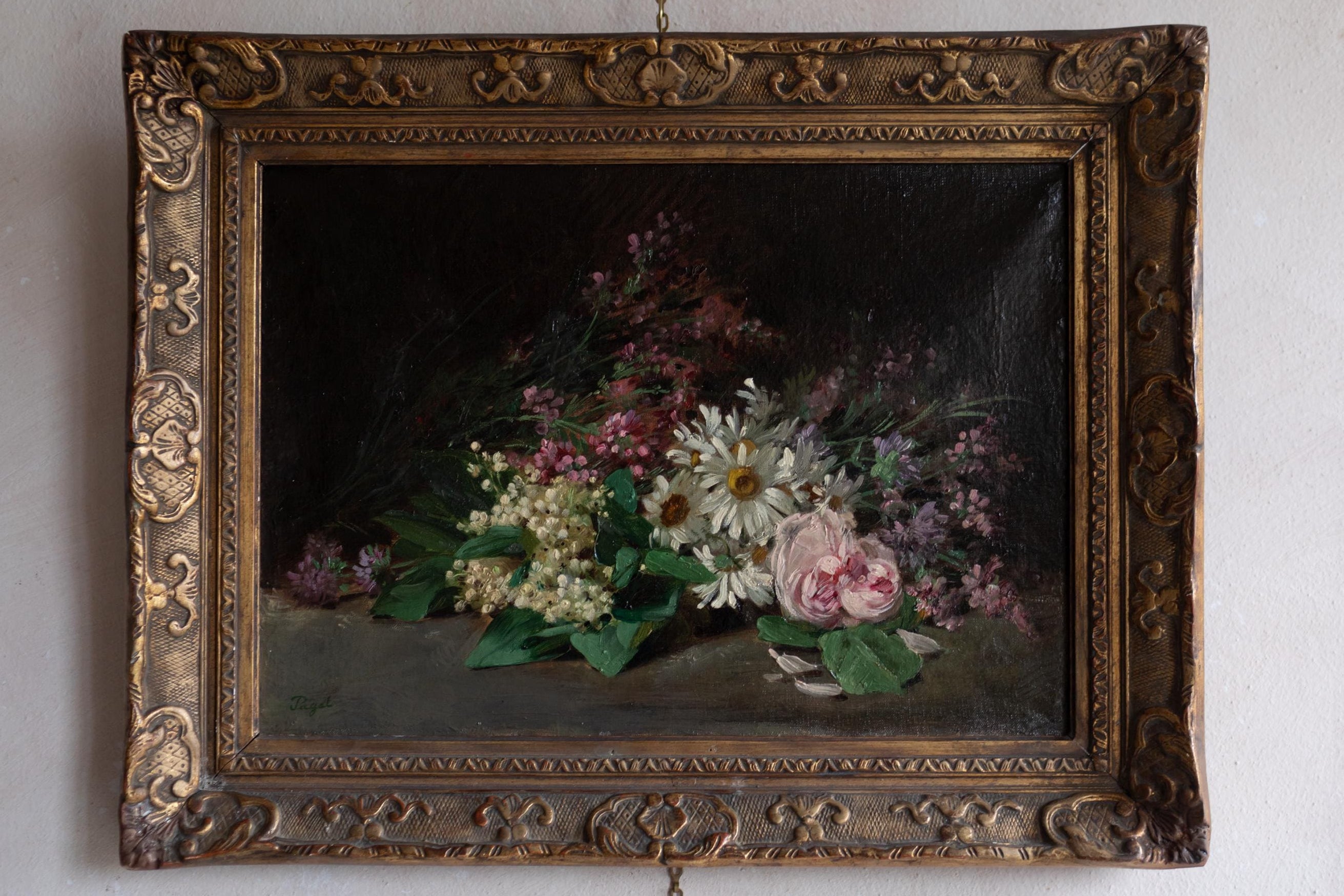 A dark and atmospheric late-19th-century French floral still life, signed Paget, painted in oil with rich colour and expressive brushwork. Elegant and moody in tone, this work is presented in its original ornate gilt frame. This refined floral still life depicts a loosely gathered bouquet resting against a deep, shadowed background. Daisies, roses, and delicate wildflowers are arranged low across the composition, allowing colour and texture to emerge gently from the darkness.