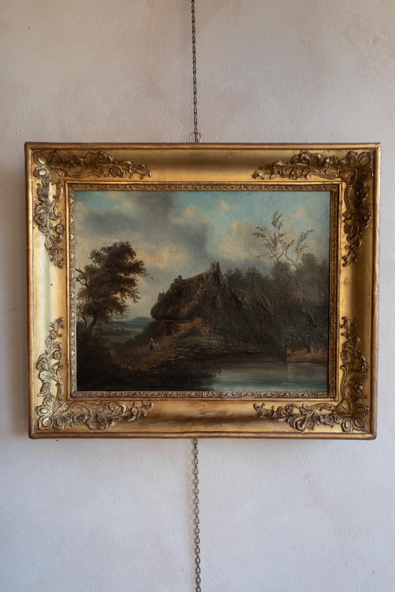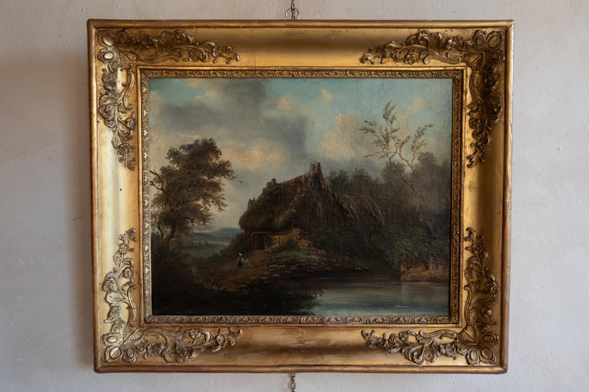 This charming mid-19th century landscape painting captures the rustic poetry of French rural life with a thatched cottage nestled by a quiet riverbank. A lone figure near the cottage lends a human touch to the peaceful, natural setting, framed by tall trees and a luminous sky. Painted in the French romantic tradition, the work reflects the era’s fascination with pastoral beauty and the harmony between people and nature. The warm earth tones and soft handling of light create a timeless, atmospheric mood. Presented in an ornate Napoleon III frame. The frame has some signs of their age, please see all photos.