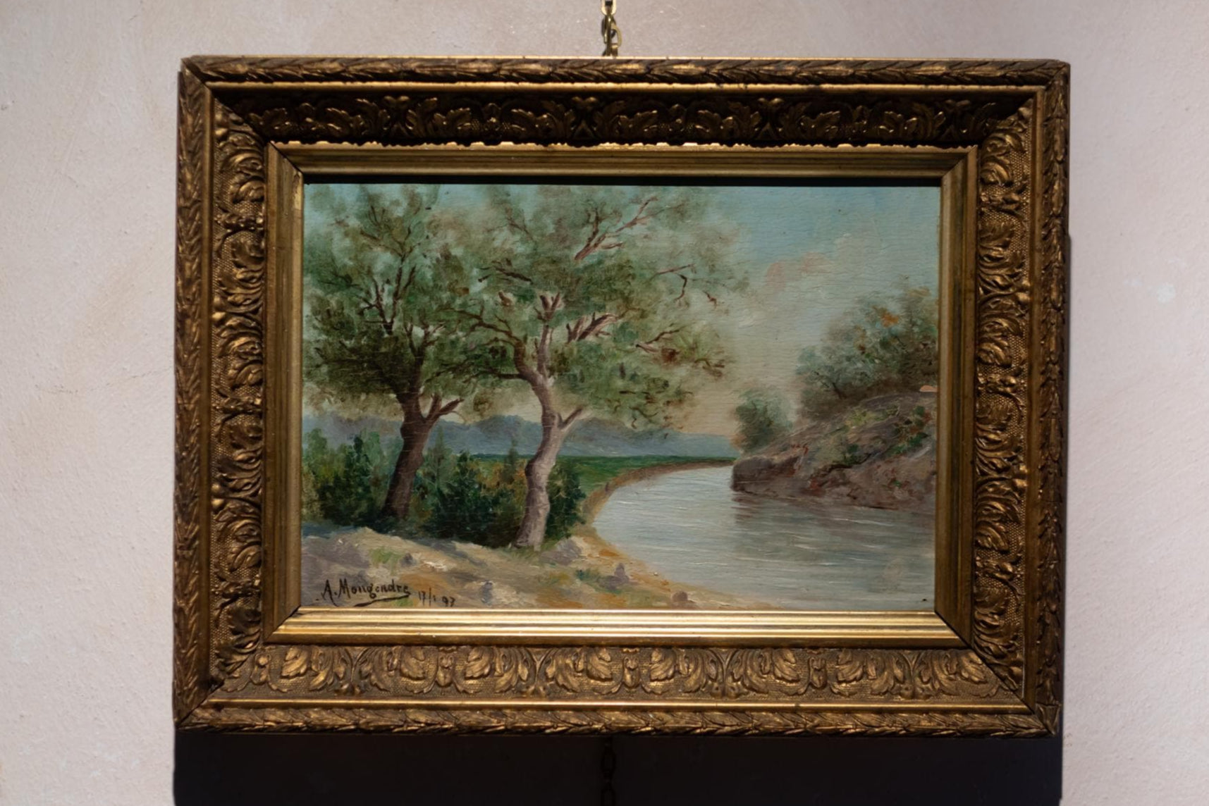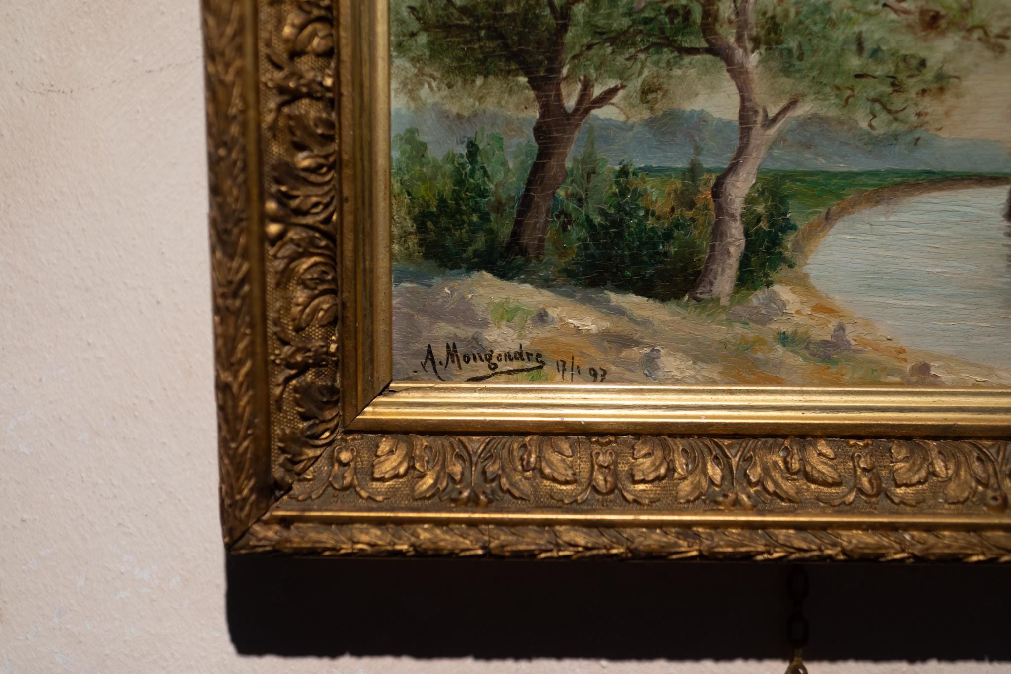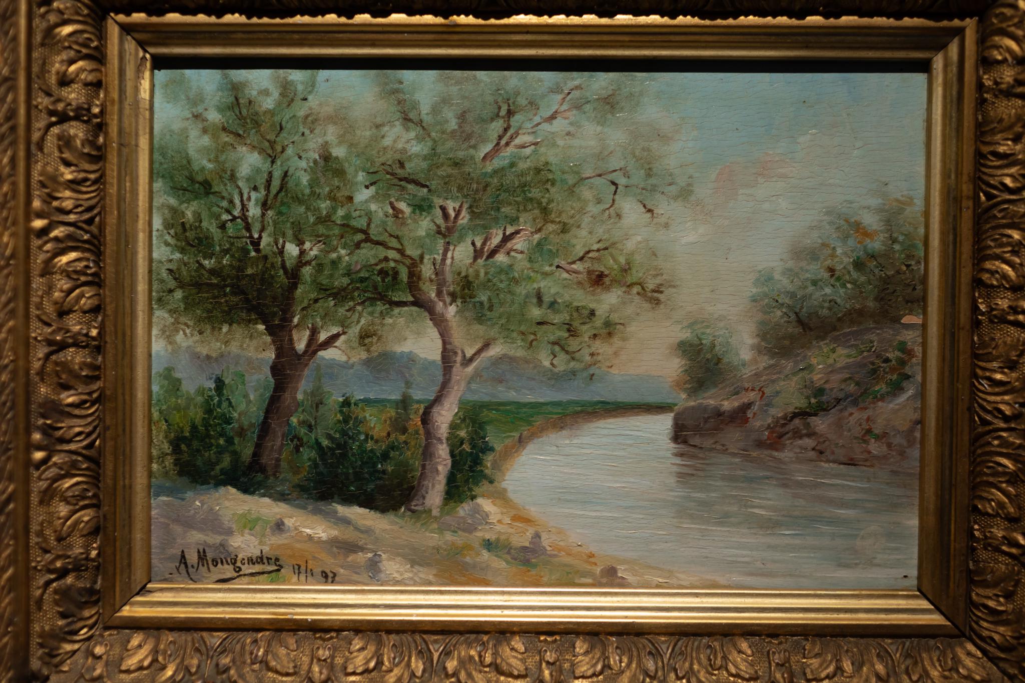 An antique oil painting of scenic landscape dating from the late 19th century. Signed in the lower left right corner "A. Mongendre" and dated "1897". Capturing the tranquil beauty of the Belle Époque landscapes. The scene depicts a quiet riverbend bordered by two graceful trees, their branches swaying gently against a soft, hazy sky. Painted with delicate, naturalistic brushwork, it reflects the late 19th-century French taste for idyllic rural views, blending realism with hints of impressionist atmosphere. Housed in its original ornate giltwood frame with feather motifs, the piece embodies the elegance of the period. A timeless work of art, it brings the poetry of 19th-century France into today’s interior.