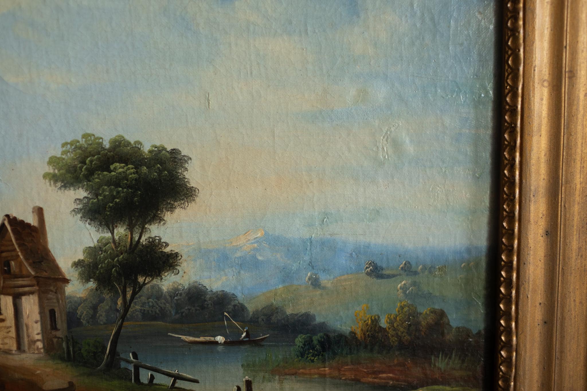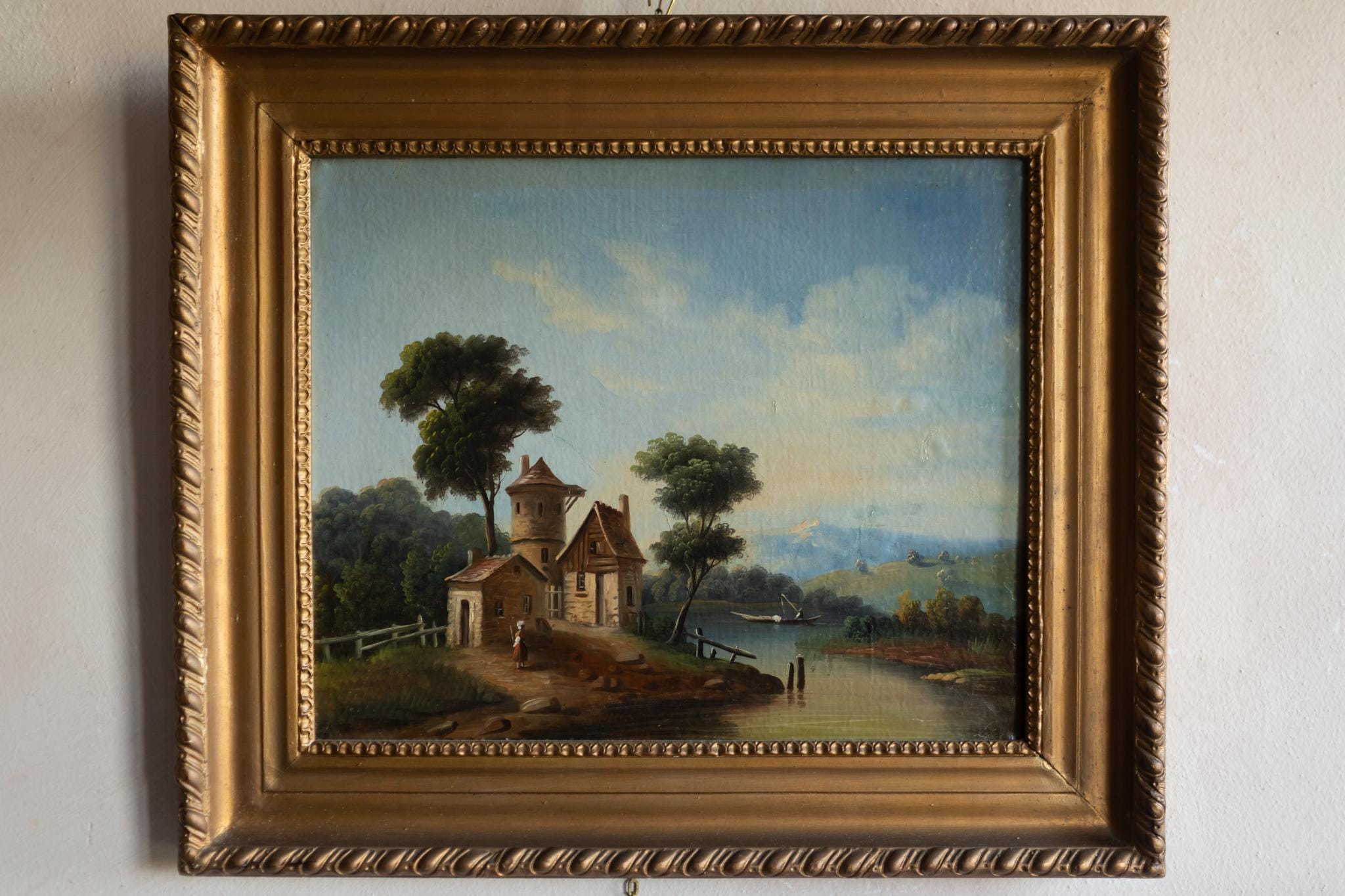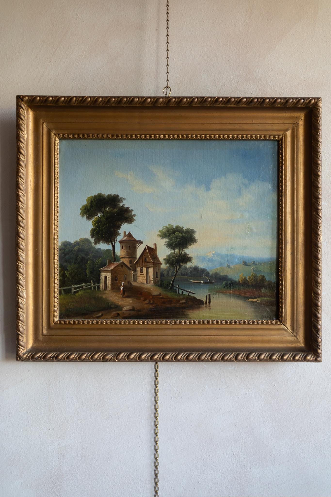 A serene early 19th-century French landscape painting, capturing a riverside view with a turreted house, tall trees, and distant hills. A small fishing boat drifts across the water, while a lone figure walks along the path, adding a human touch to the tranquil setting. Painted in the Romantic tradition, the work combines fine architectural detail with a luminous sky and soft rolling countryside. Likely dating from the 1820s–1840s, this antique oil painting embodies the elegance and charm of early French Pastoral landscape art. This original oil painting comes in a thick gold frame, overall good size. Not too big or small, can make a statement but not overwhelm a wall.
