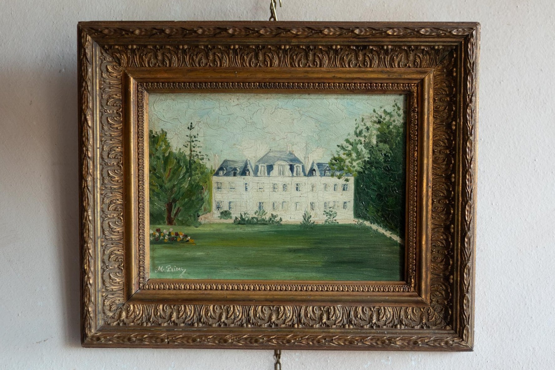 The impressionist influence is clear in the light handling of colour, the visible brush marks, and the gentle abstraction of foliage and sky. The bright lawn, balanced trees, and small flower border add warmth and narrative to the scene. The painting appears to date from late 19th to early 20th, during a period when regional French painters blended academic training with impressionist spontaneity. Signed in the lower left corner, this work carries the charm of a personal, plein-air observation rather than a formal architectural study. Its approachable style and elegant setting make it perfect for classic French interiors, gallery walls or country-house decoration.
