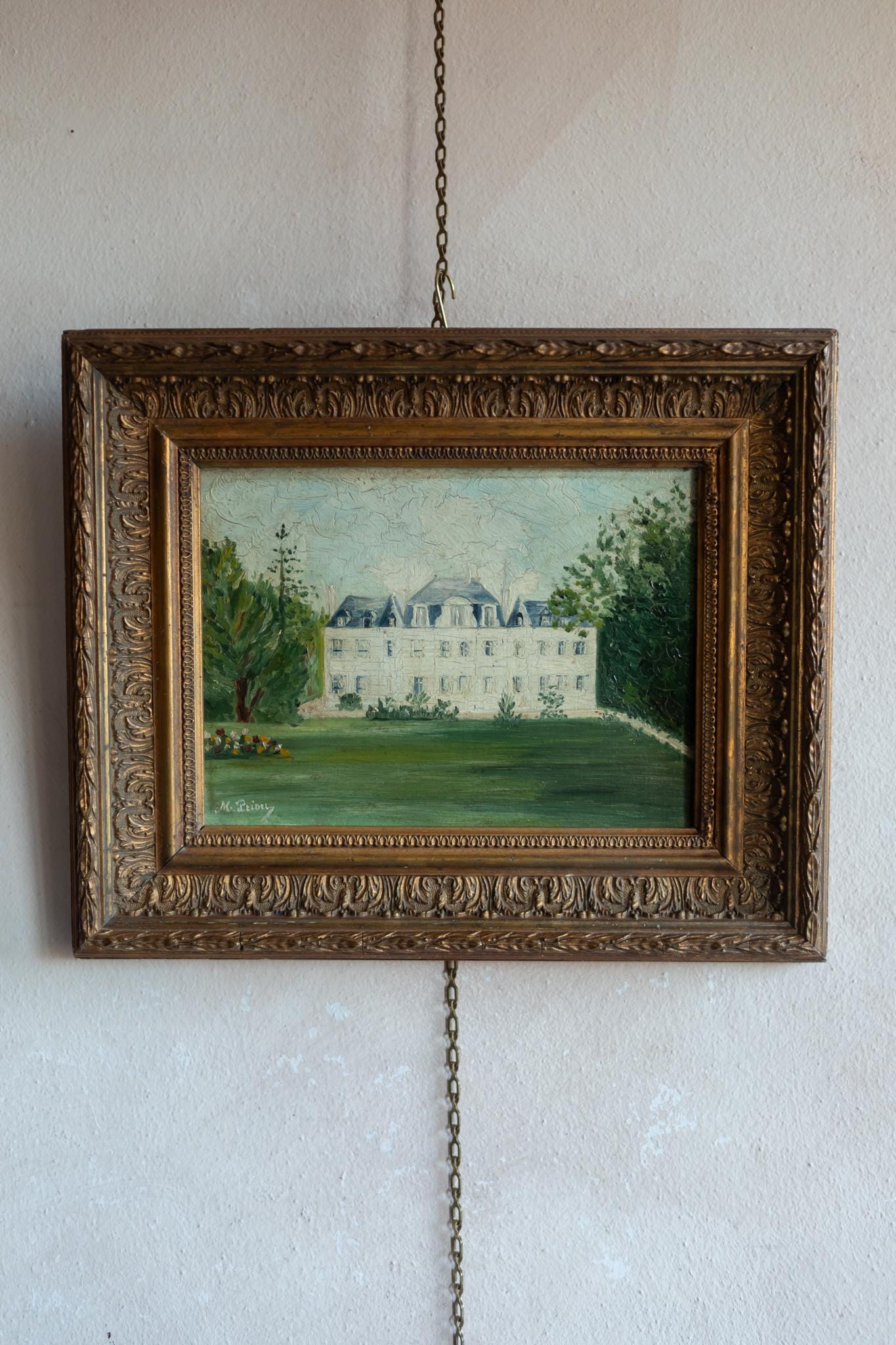 Small Turn of the Century French Château Painting. Impressionist Landscape in Gilt Frame