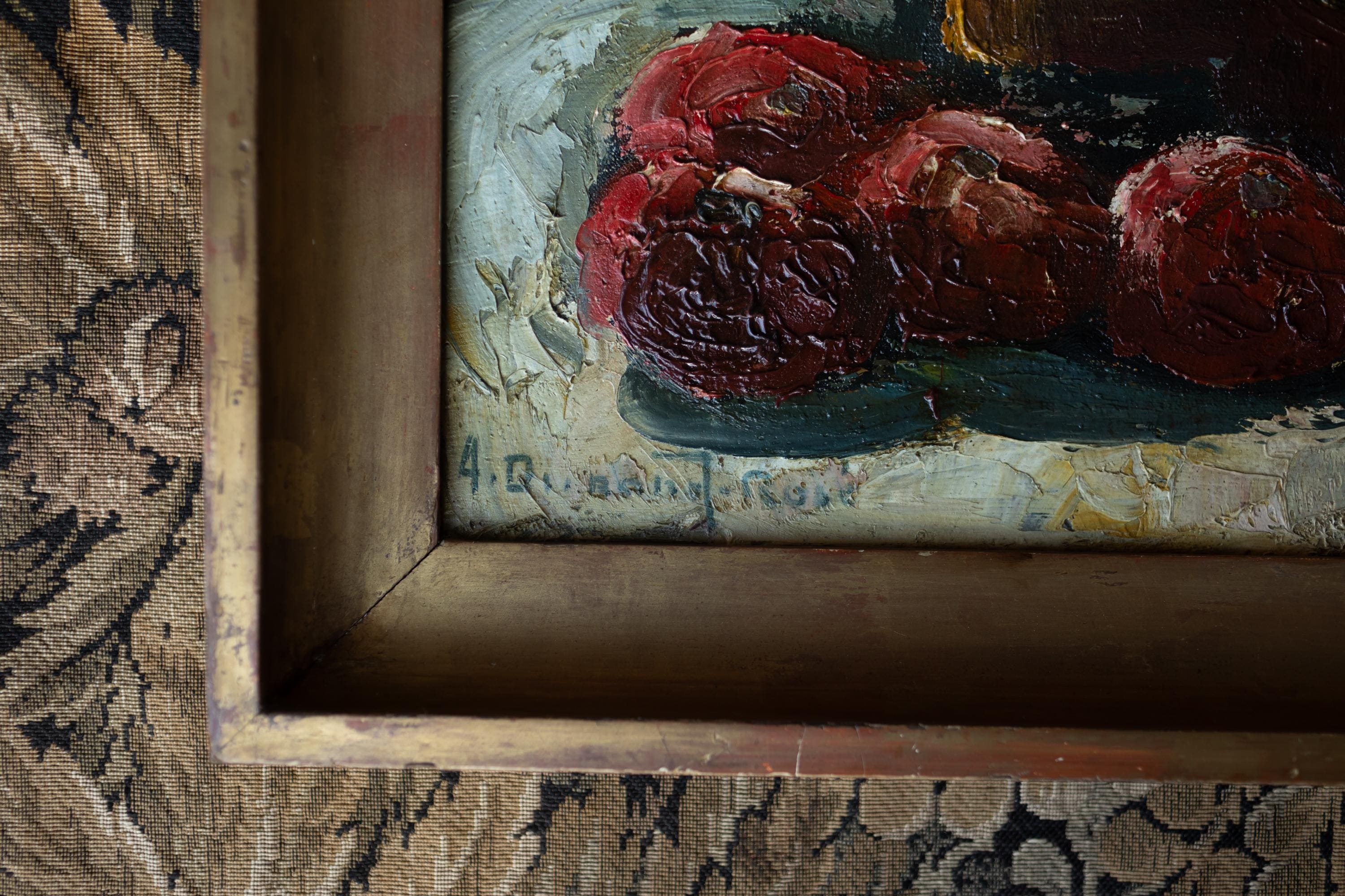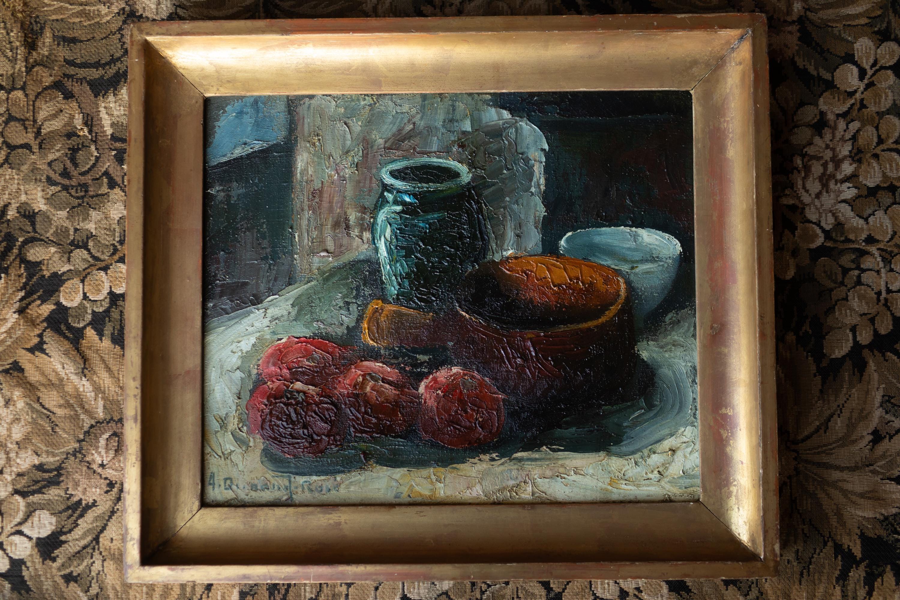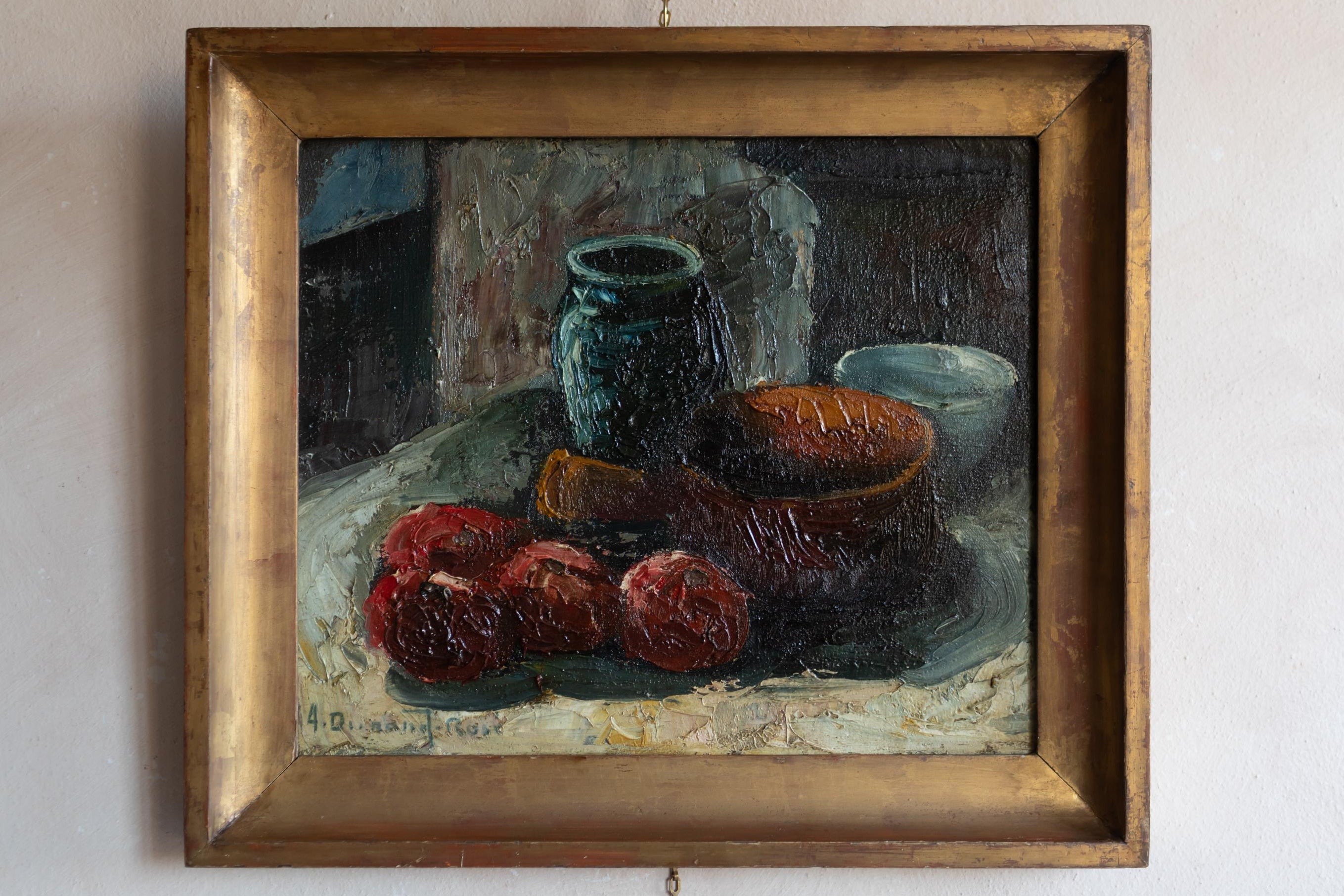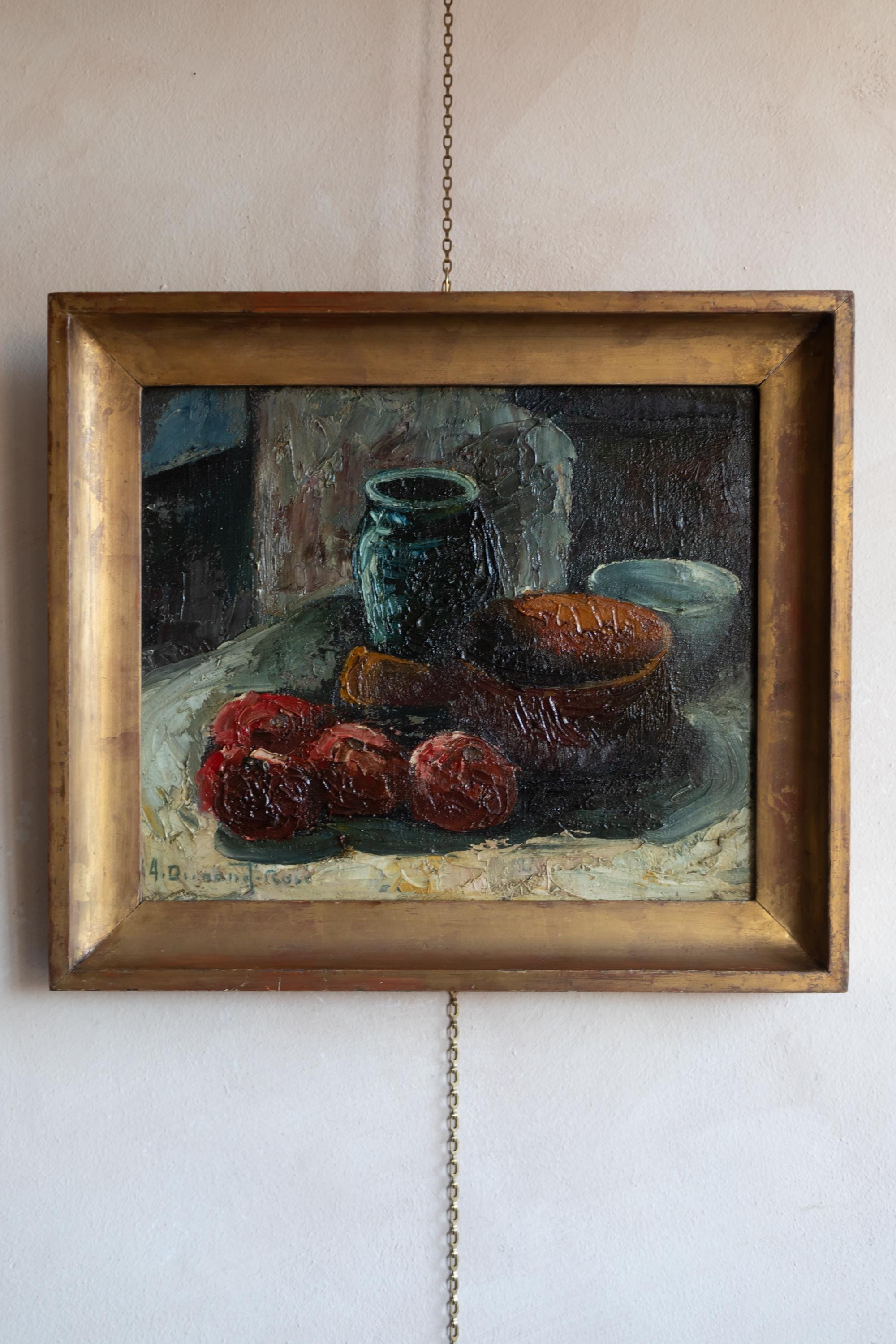 A richly textured French post-Impressionist still life from the 1920s, featuring rustic kitchenware and fruit rendered with bold brushwork and expressive impasto. Full of atmosphere and painterly depth, and presented in a period gilt frame.