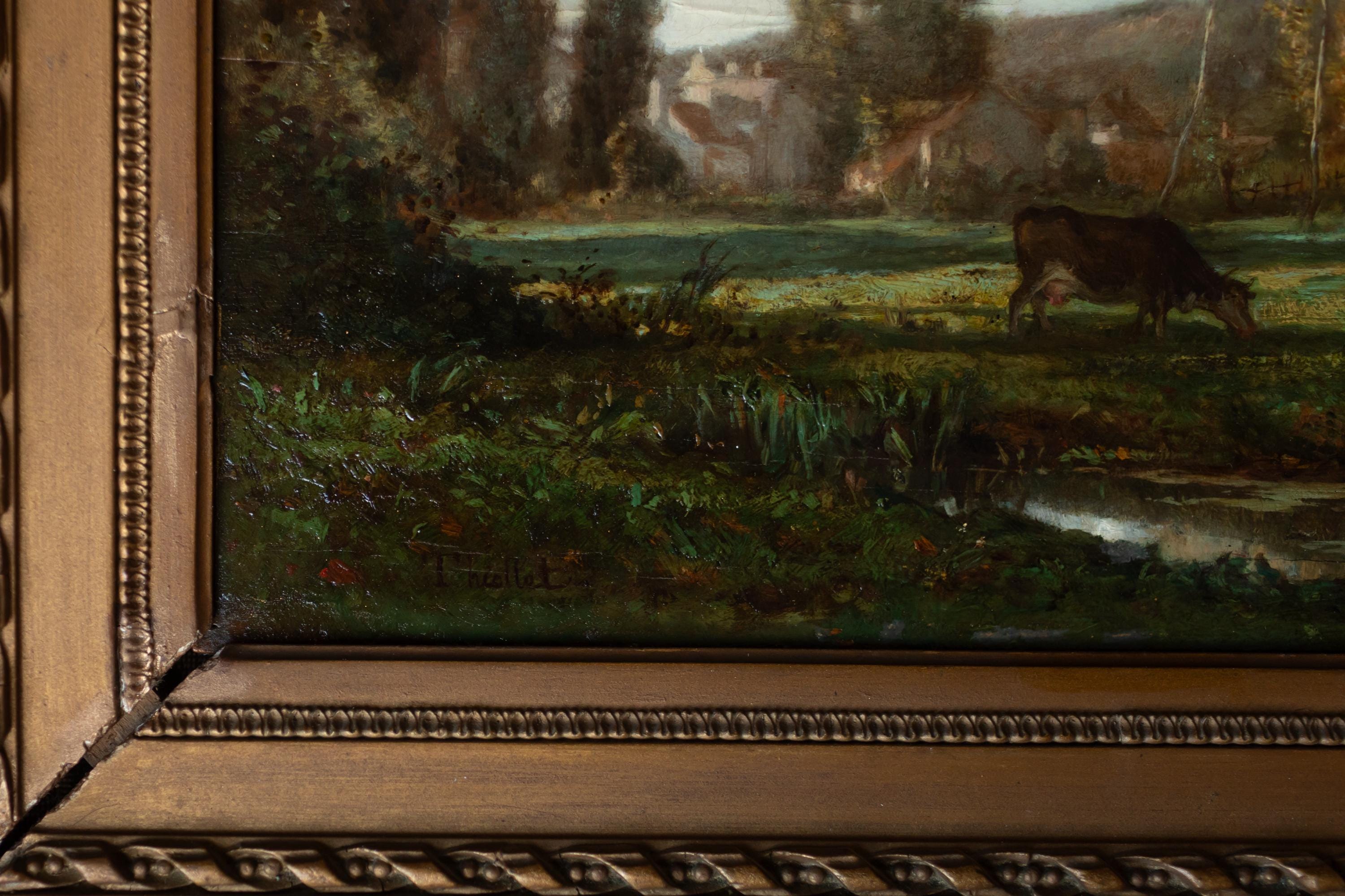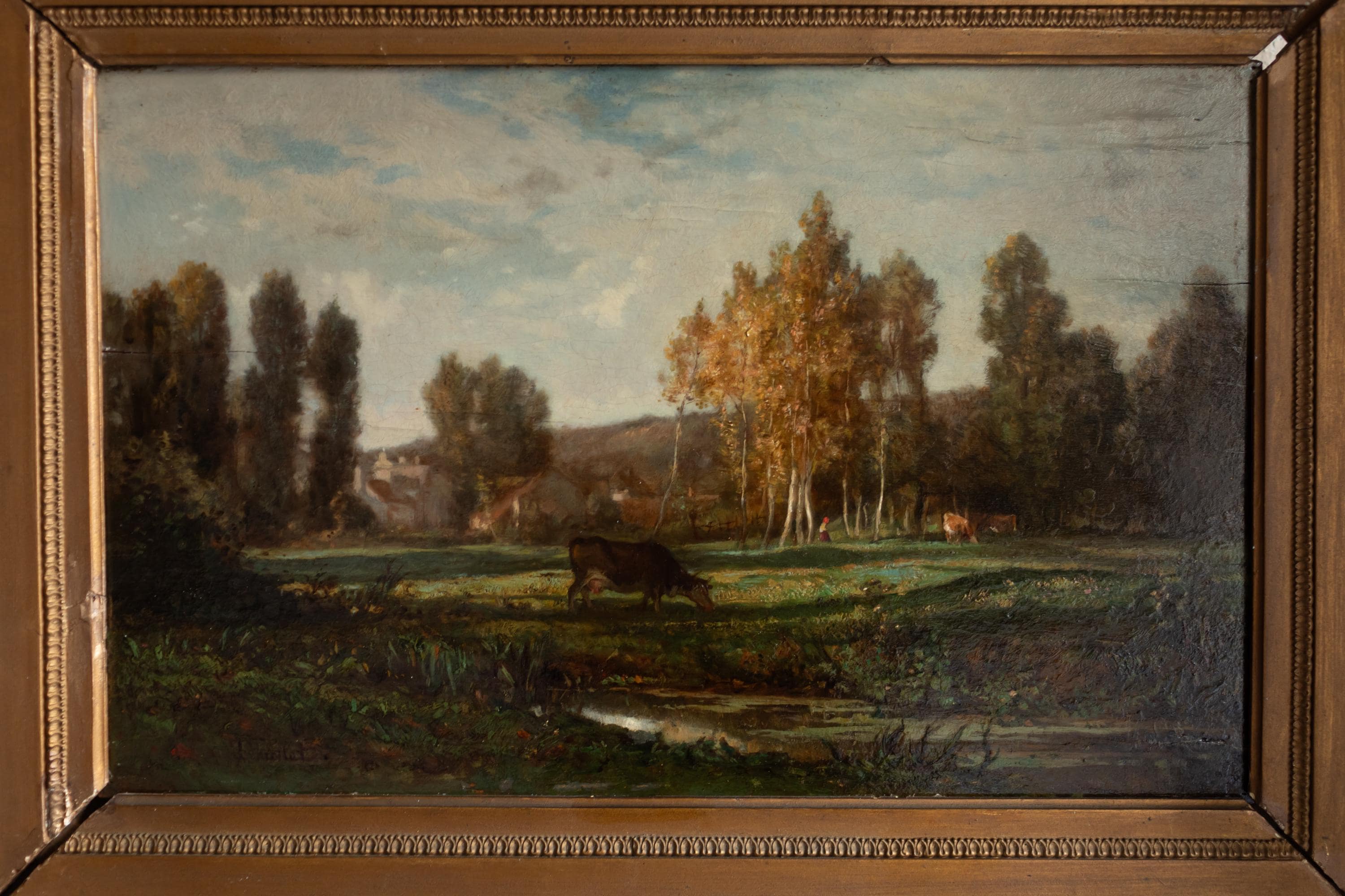 A refined 19th-century French pastoral landscape in the Normandy countryside by Alexandre Thiollet, exhibited Salon artist and student of the Barbizon circle of French painters. A beautifully balanced countryside scene with grazing cattle and luminous autumn trees, presented in a richly moulded gold frame.
