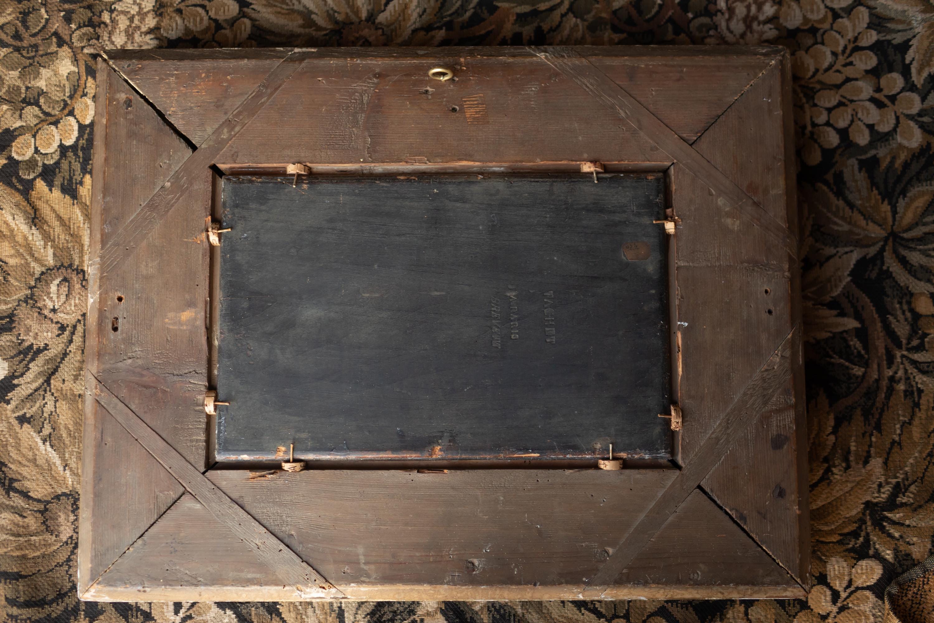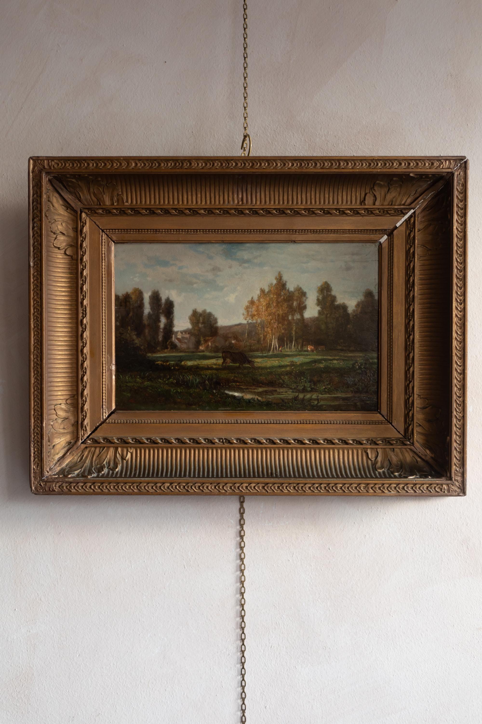 Very good antique condition. Panel is stable. Minor age-related craquelure consistent with 19th-century works. The painting has recently been to a restorer for a professional cleaning and new varnish applied. Frame shows light wear and patina appropriate to age. The painting is housed in an impressive 19th-century gold frame with deep moulding and strong decorative presence, enhancing the richness of the pastoral palette.