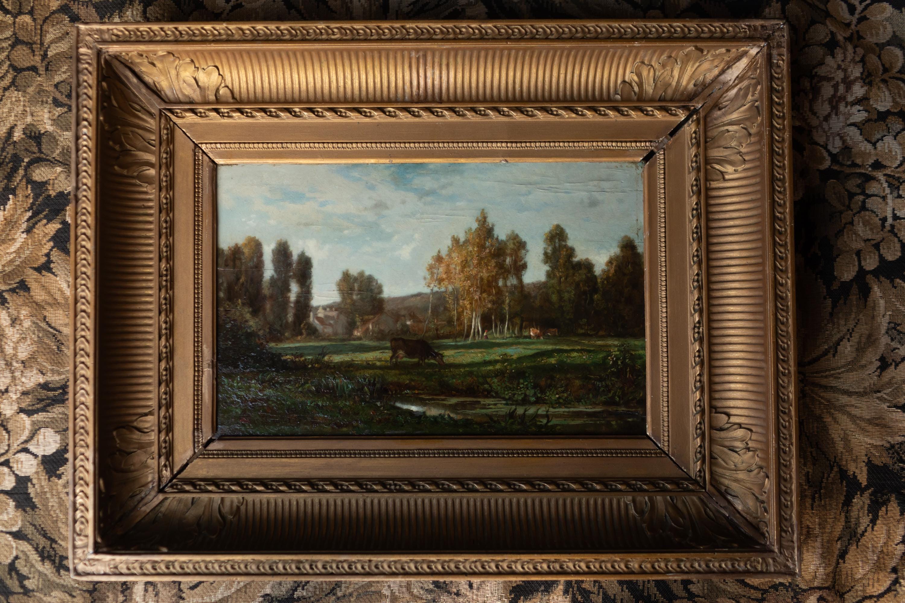 Antique French Barbizon Landscape Oil Painting – Pastoral Meadow with Cows, 19th Century, Gold Framed