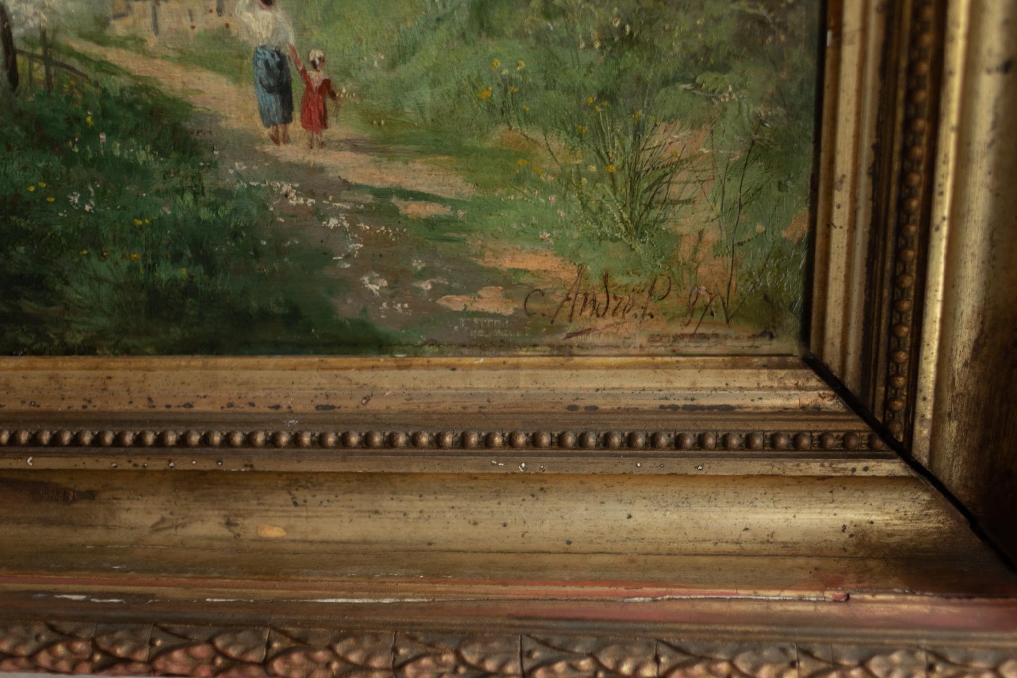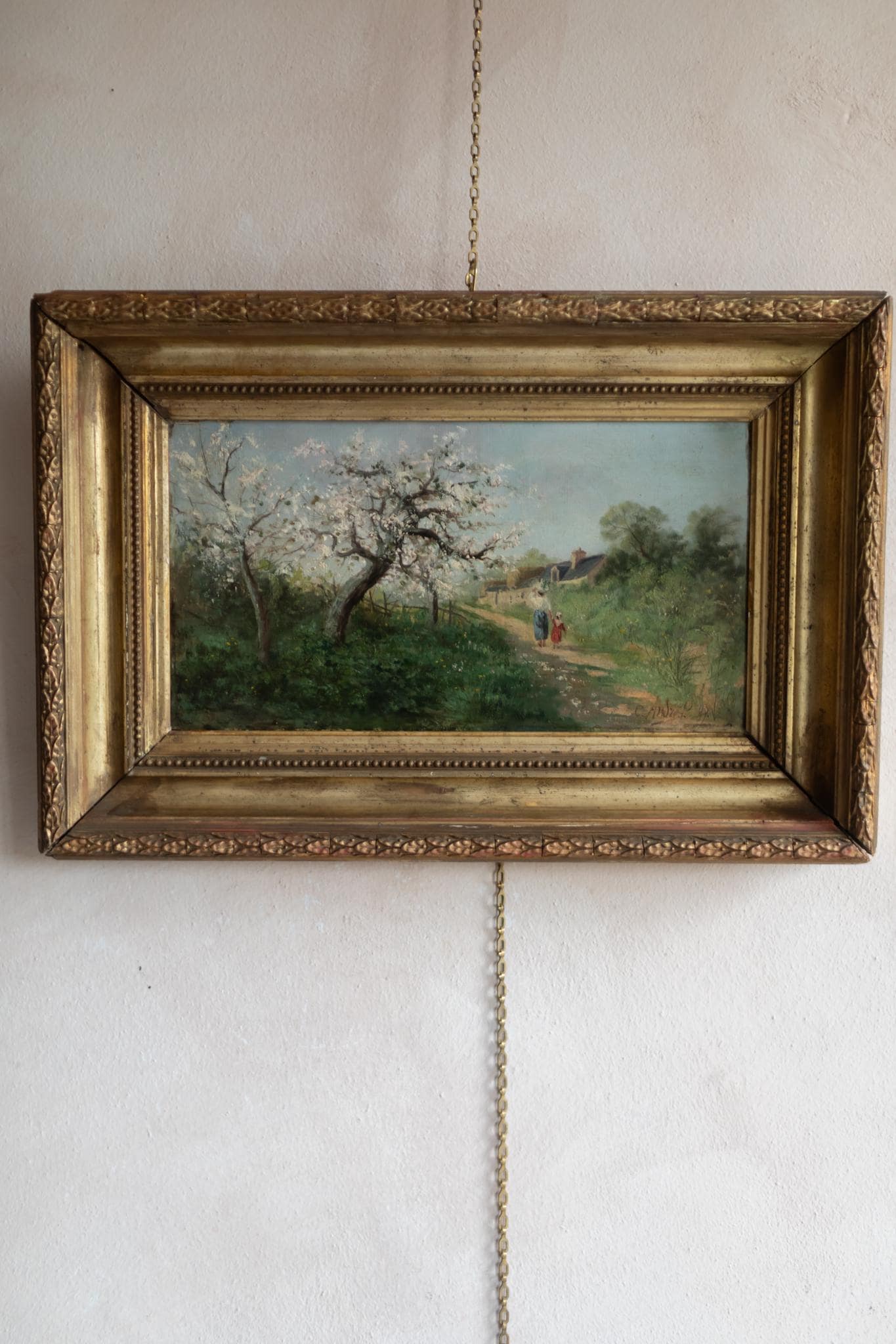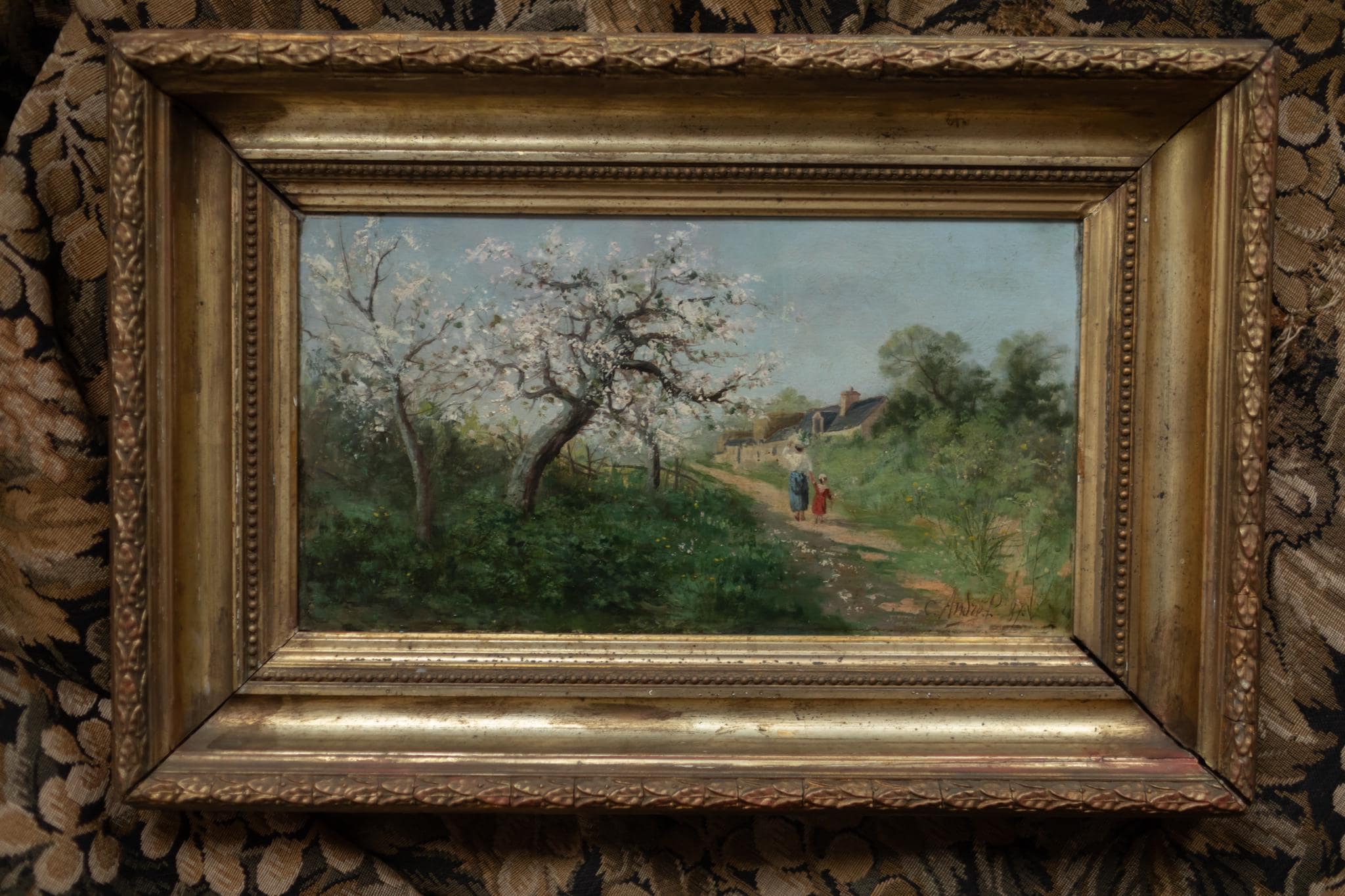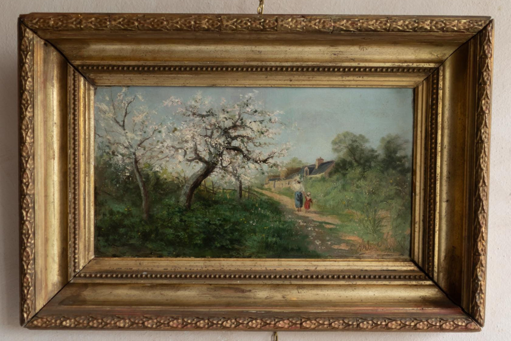 This signed and dated oil painting by C. André (1887) captures the beauty of springtime in the French countryside. The composition features flowering fruit trees in full blossom, with a mother and child walking along a winding path toward a village. Painted in delicate, impressionistic brushstrokes, the scene glows with light and seasonal freshness. The work is presented in its original gilt frame, adding both historic charm and decorative appeal. C. André is recorded as an active French painter of the late 19th century, and this piece represents the popular pastoral tradition of the era. An ideal acquisition for collectors of impressionist-inspired landscapes.
