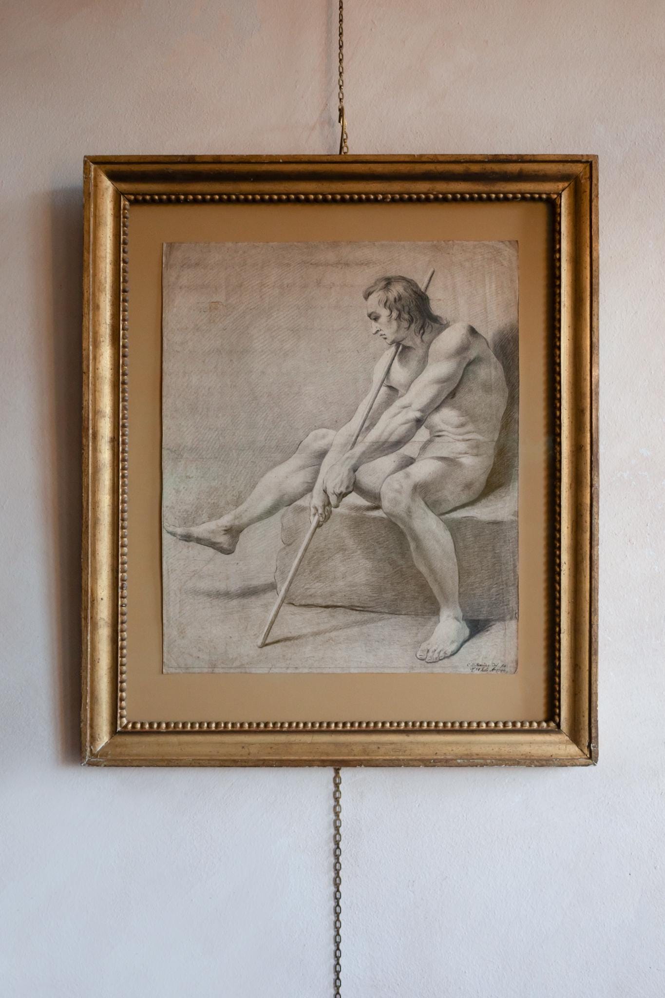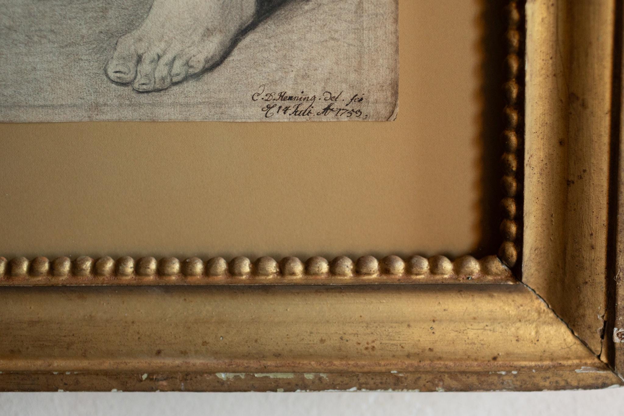 Dated 1753 German Academic Nude Male Figure Drawing. Signed C.D. Henning. Pencil Study in Gilt Frame