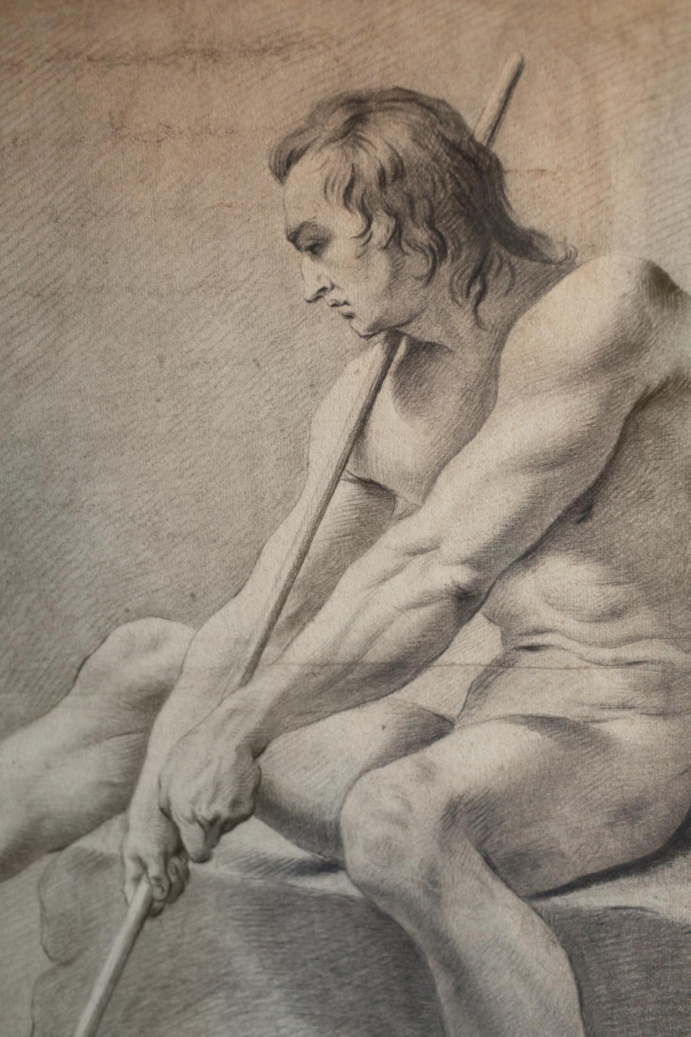 This powerful academic drawing depicts a seated male nude, rendered with outstanding structural clarity and anatomical understanding. The figure is carefully observed from life, with particular attention paid to musculature, weight distribution, and foreshortening, hallmarks of high-level academic instruction in the mid-18th century. The quality of draftsmanship is immediately apparent. The tension in the limbs, the natural turn of the torso, and the relaxed yet deliberate pose all reflect rigorous academic training.