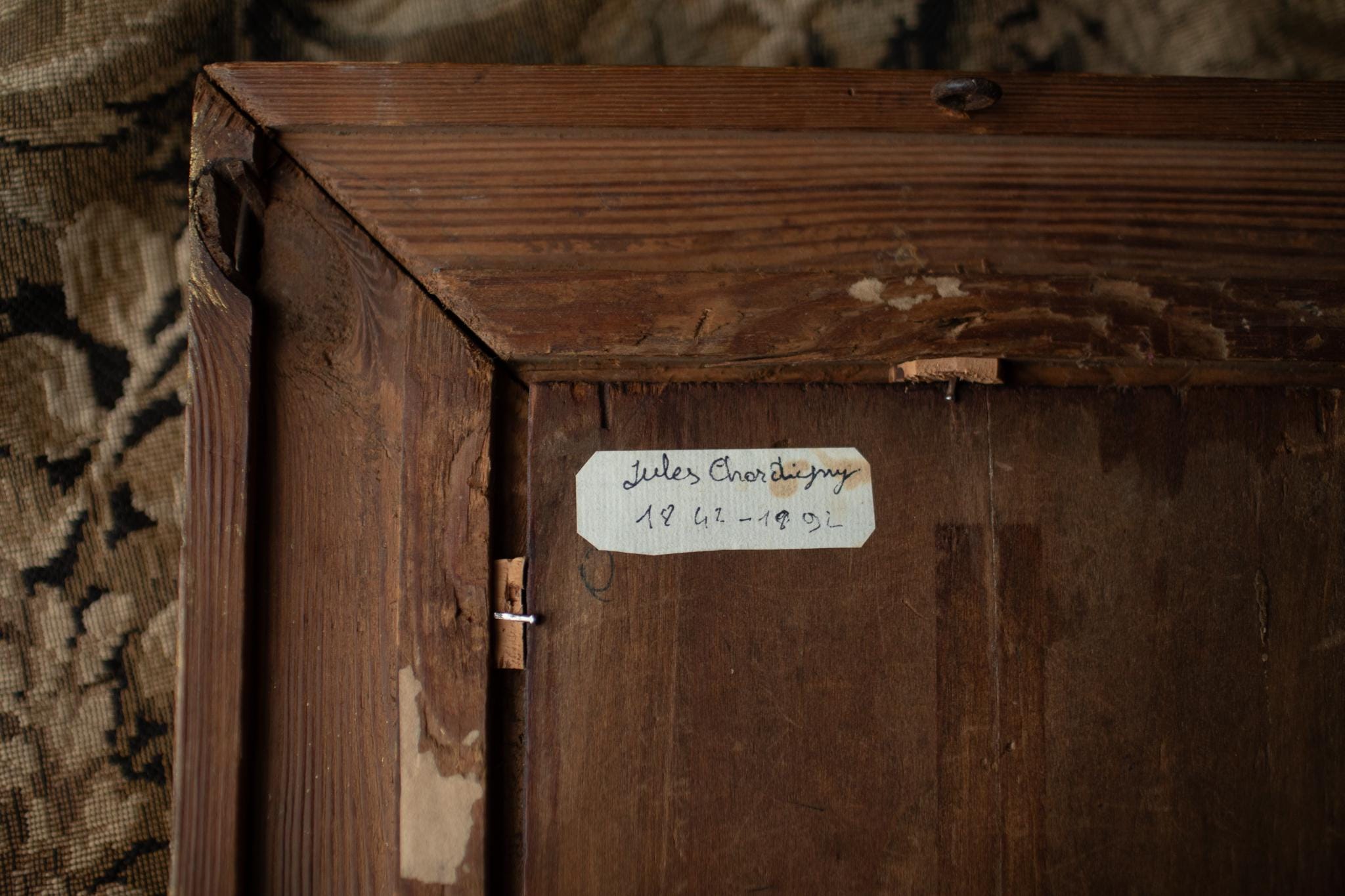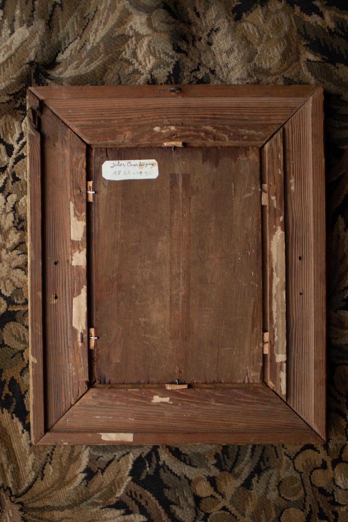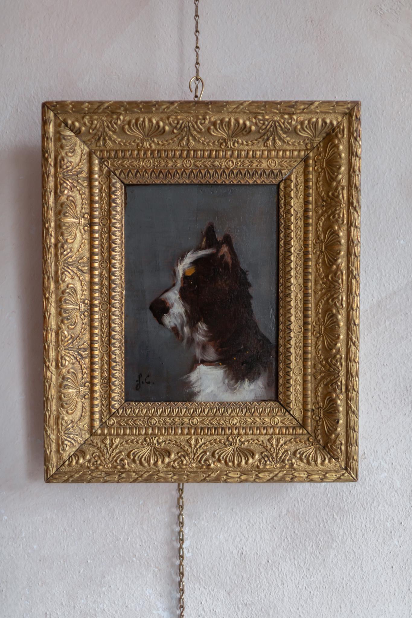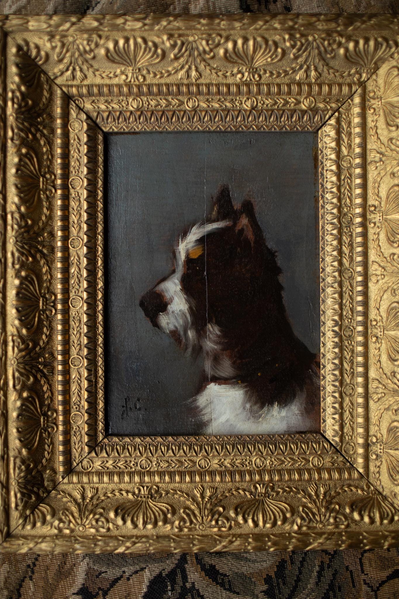 Jules Chardigny initialed the work in the lower left corner with his distinctive J.C. monogram. The portrait demonstrates his talent for capturing individuality and subtle emotion in animal subjects, a specialty for which he became known. The painting sits in an exceptional period gilt frame, decorated with palmettes, foliage, and beading. In good antique condition. The wood panel has been split and repaired at sometime in the past. Frame shows warm patina and minor losses typical of 19th-century. The painting was recently at our restorer for a professional cleaning and new varnish applied.