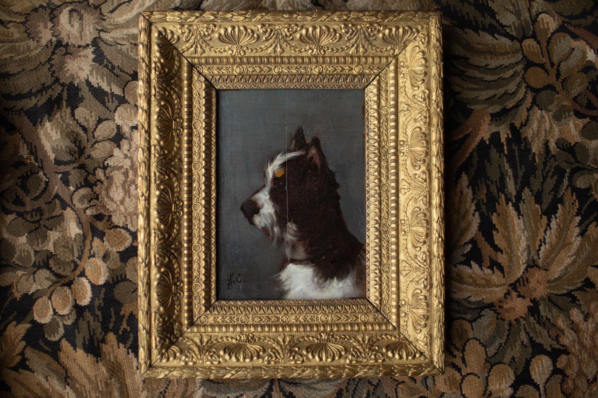 A delightful 19th-century dog portrait by French artist Jules Chardigny (1842–1892), finely painted and presented in a richly carved frame. The sitter appears to be a French terrier captured in crisp profile with expressive realism.