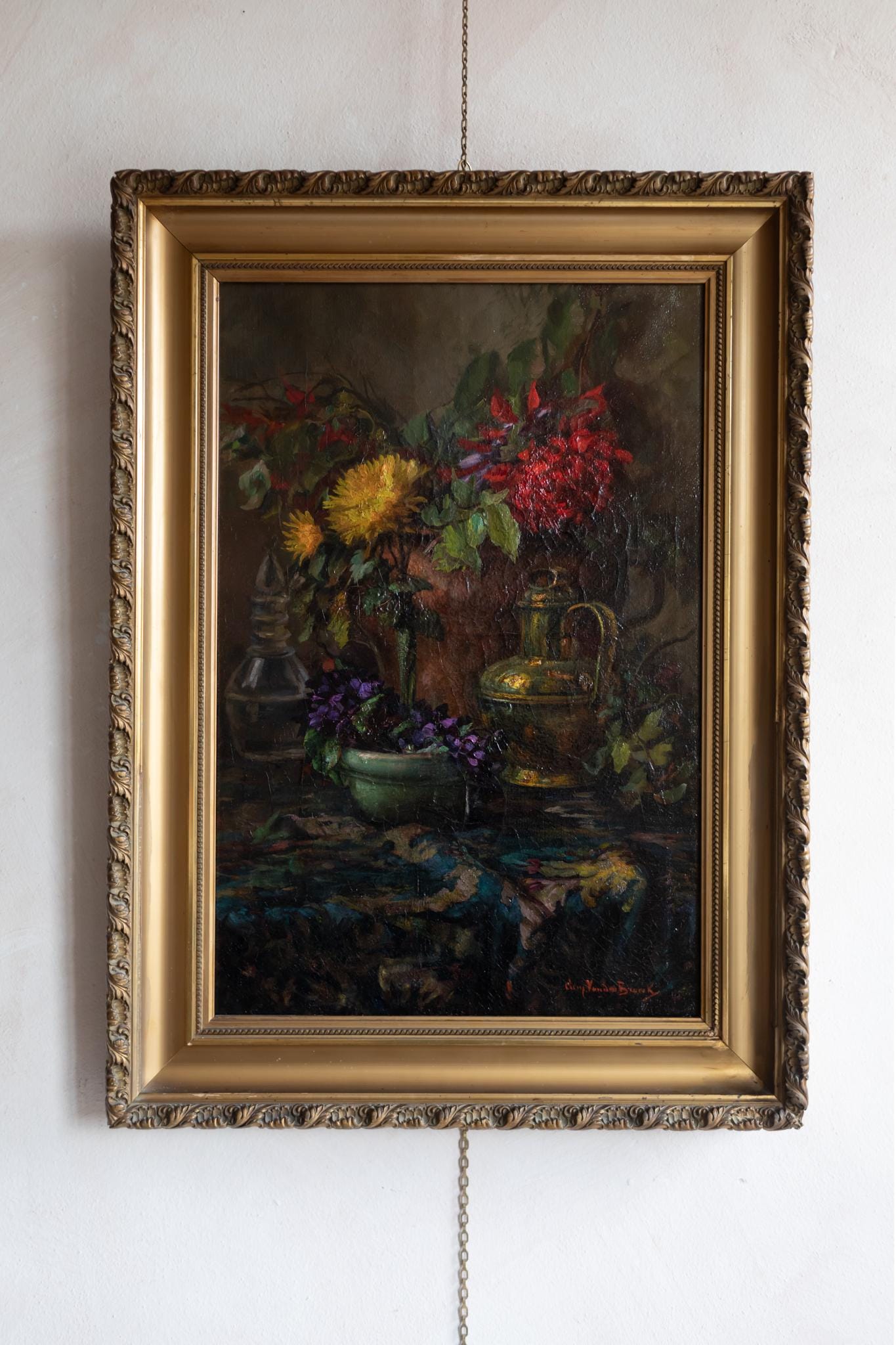 This striking antique Belgian still life presents a lush array of flowers arranged with theatrical depth and atmosphere. Golden chrysanthemums, red dahlias and clusters of purple violets glow against a dark, velvety background, while brass vessels and glassware catch traces of light. The painting’s dramatic palette and layered composition showcase the artist’s superb control of tone, texture and reflection.