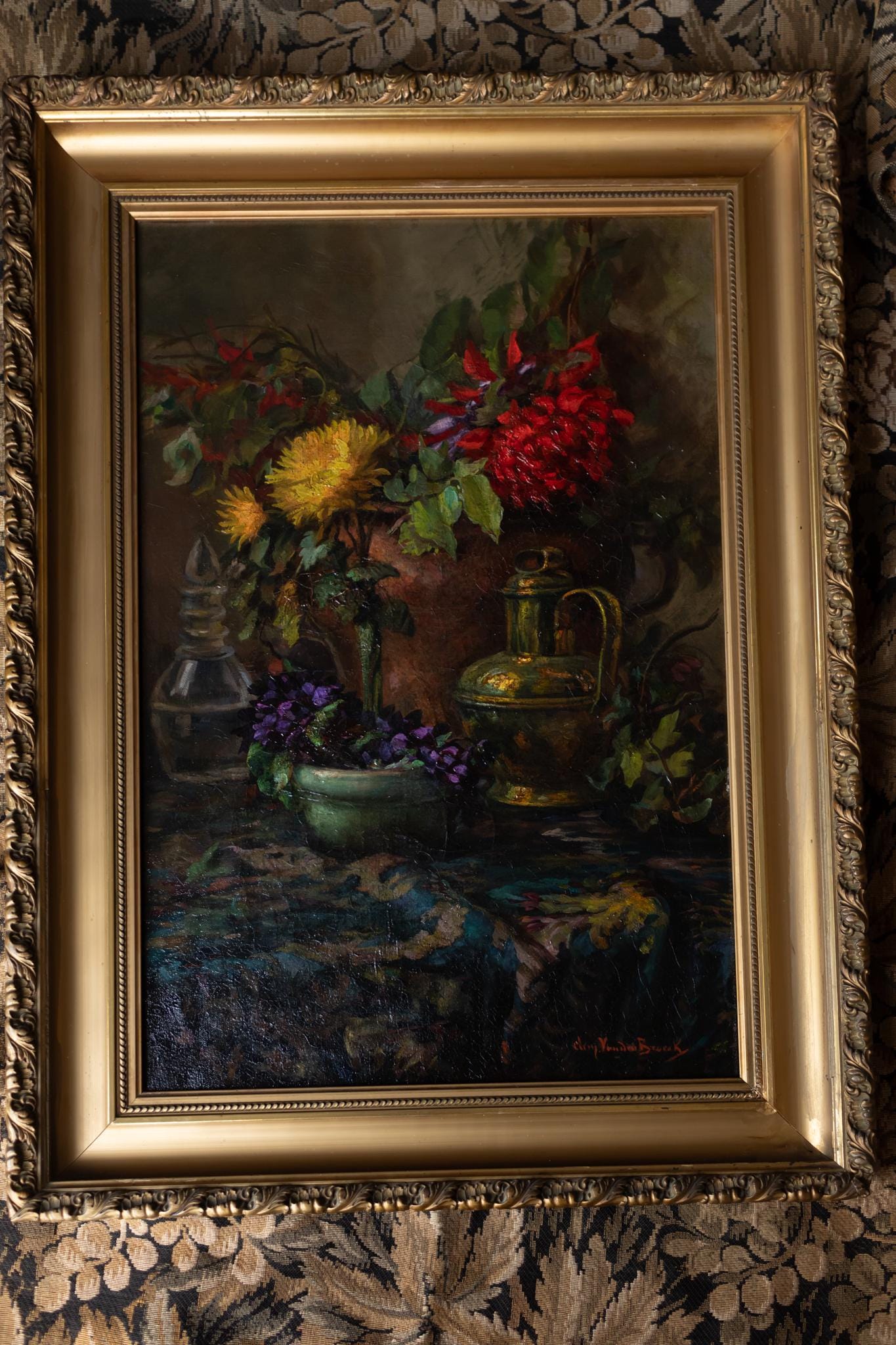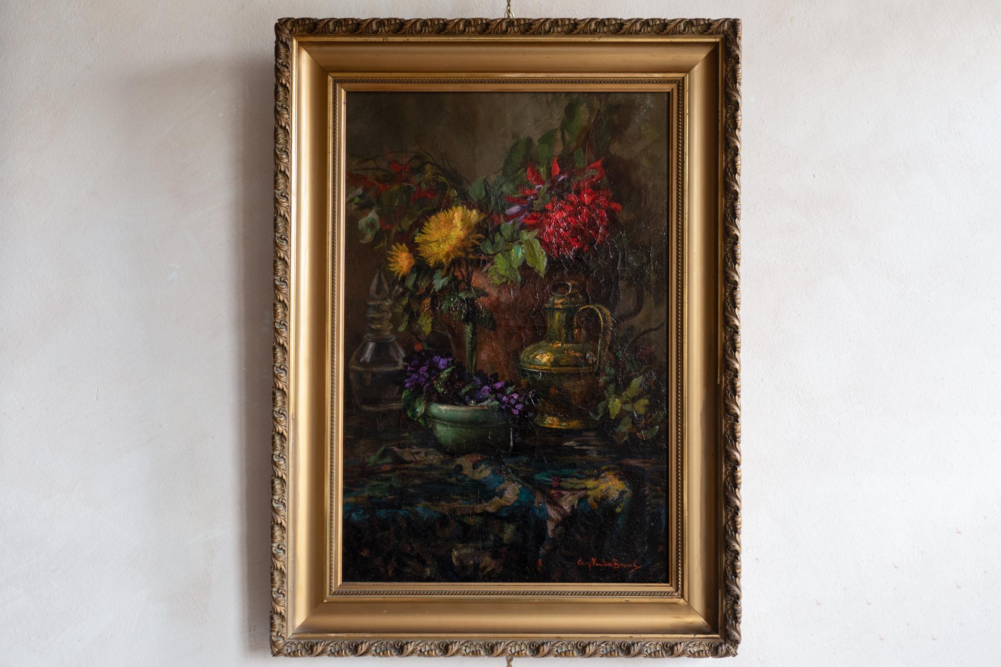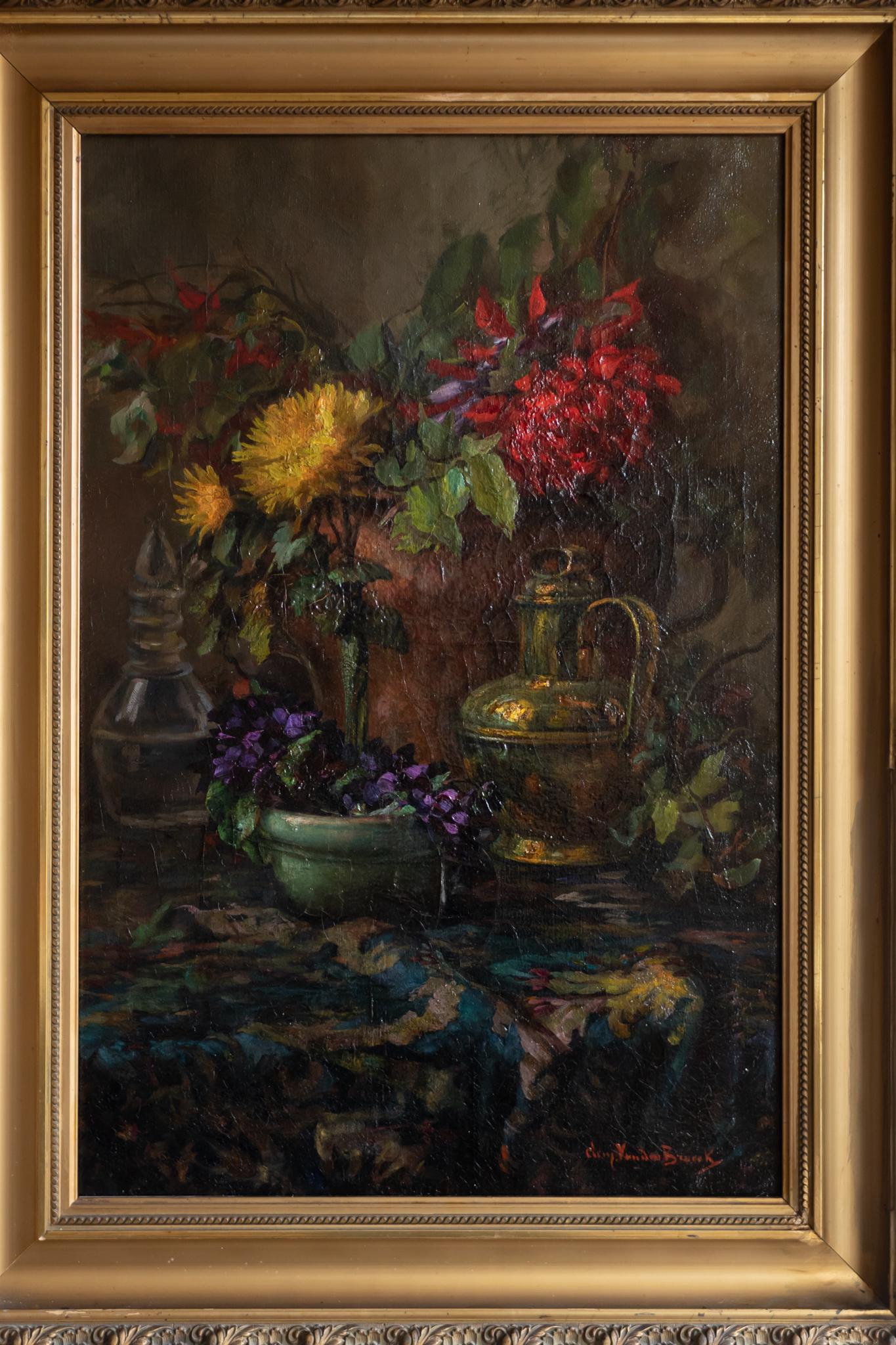 Signed in the lower right by Clémence Van den Broeck, a noted Belgian woman artist active during the late 19th and early 20th century, this work reflects her refined academic training and affinity for classical still-life structure. Van den Broeck was among the women painters of her era who pursued professional art careers at a time when the field was overwhelmingly male, and she developed a reputation for richly coloured compositions inspired by the Flemish realist tradition.
