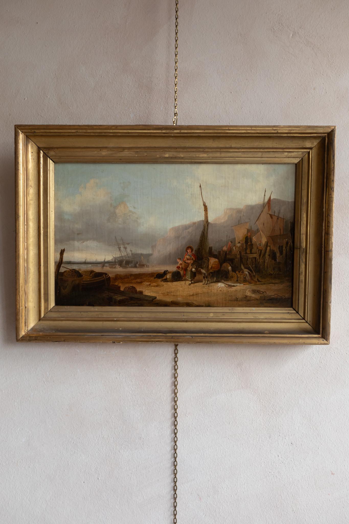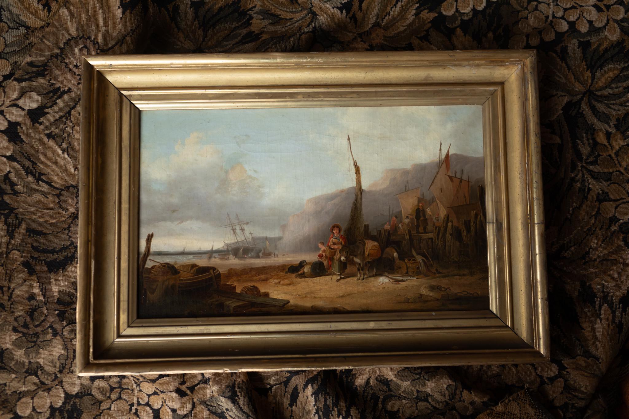 A wonderful late-19th-century French coastal landscape depicting a lively beach scene with fishing boats, figures, and a laden donkey. Looks like the northwestern coast of Britany or Normandy. Full of movement, atmosphere, and narrative detail, the painting captures the working life of a rural shoreline and is presented in its antique gilt-and-cream frame.