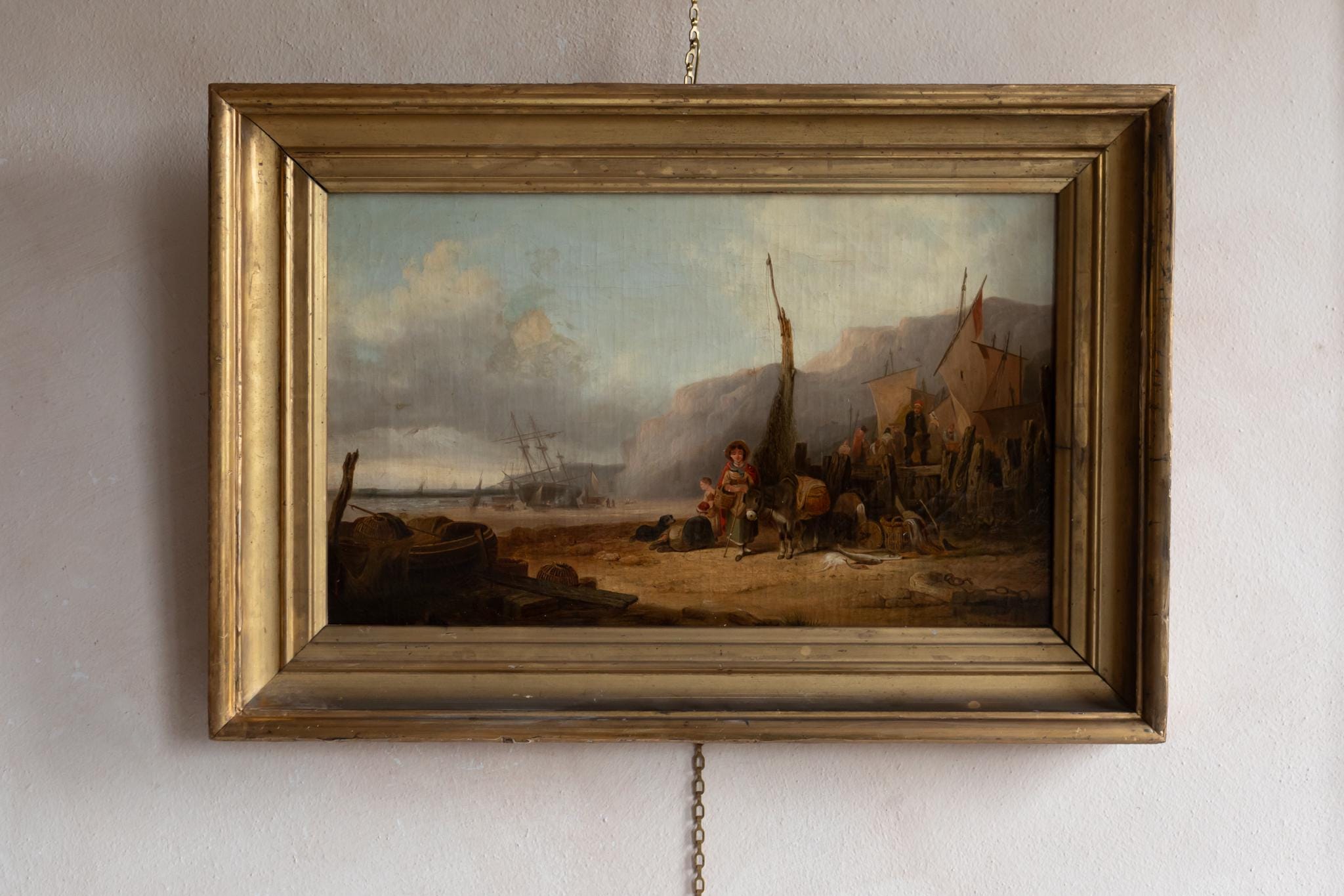The painting is housed in its original 19th-century frame, a warm gilt-and-cream moulding that complements the sandy hues of the beach and the softness of the sky. Together the frame and the painting create a striking decorative statement.