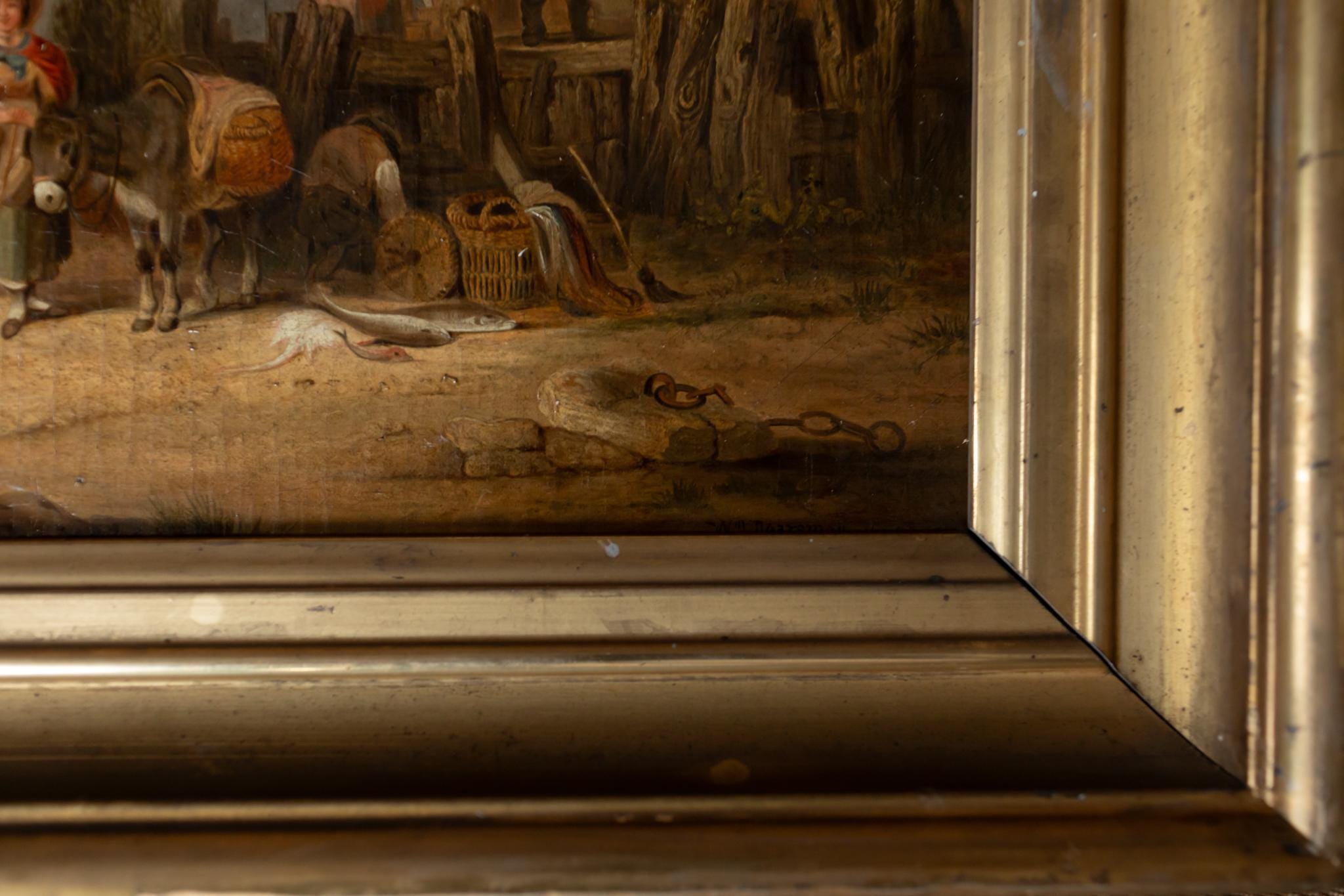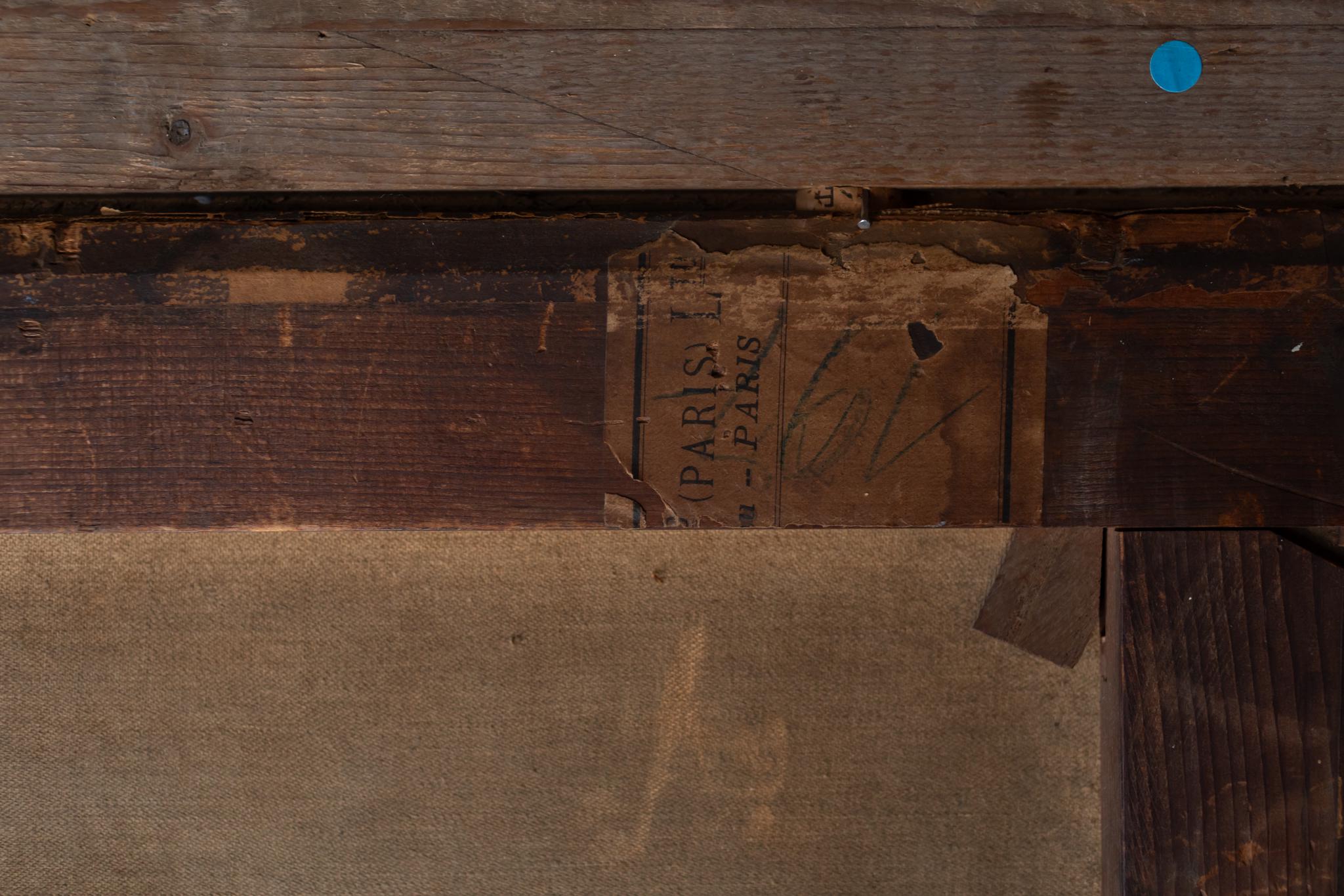 Good antique condition with expected craquelure and gentle patina consistent with age. Canvas is stable. Frame shows age-appropriate wear and light rubbing along edges, adding to its authentic charm.