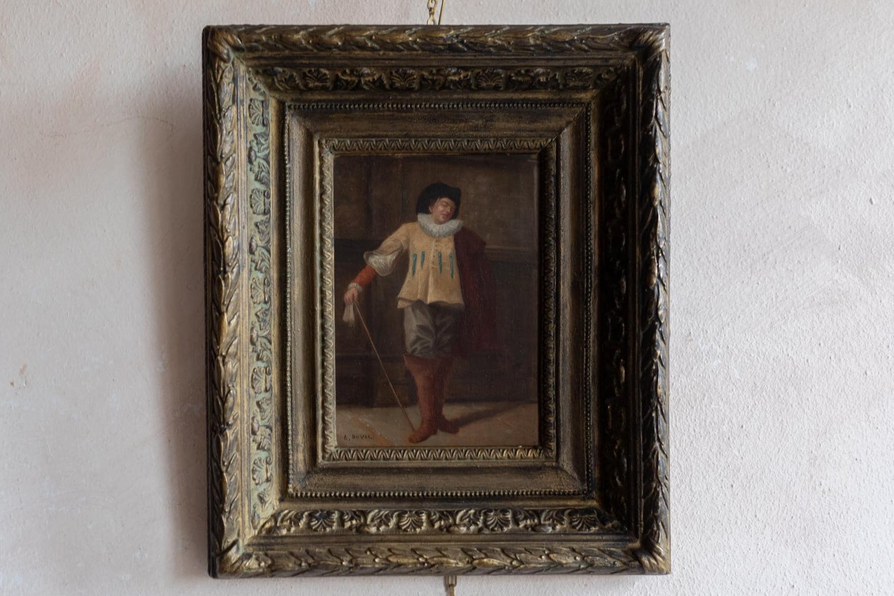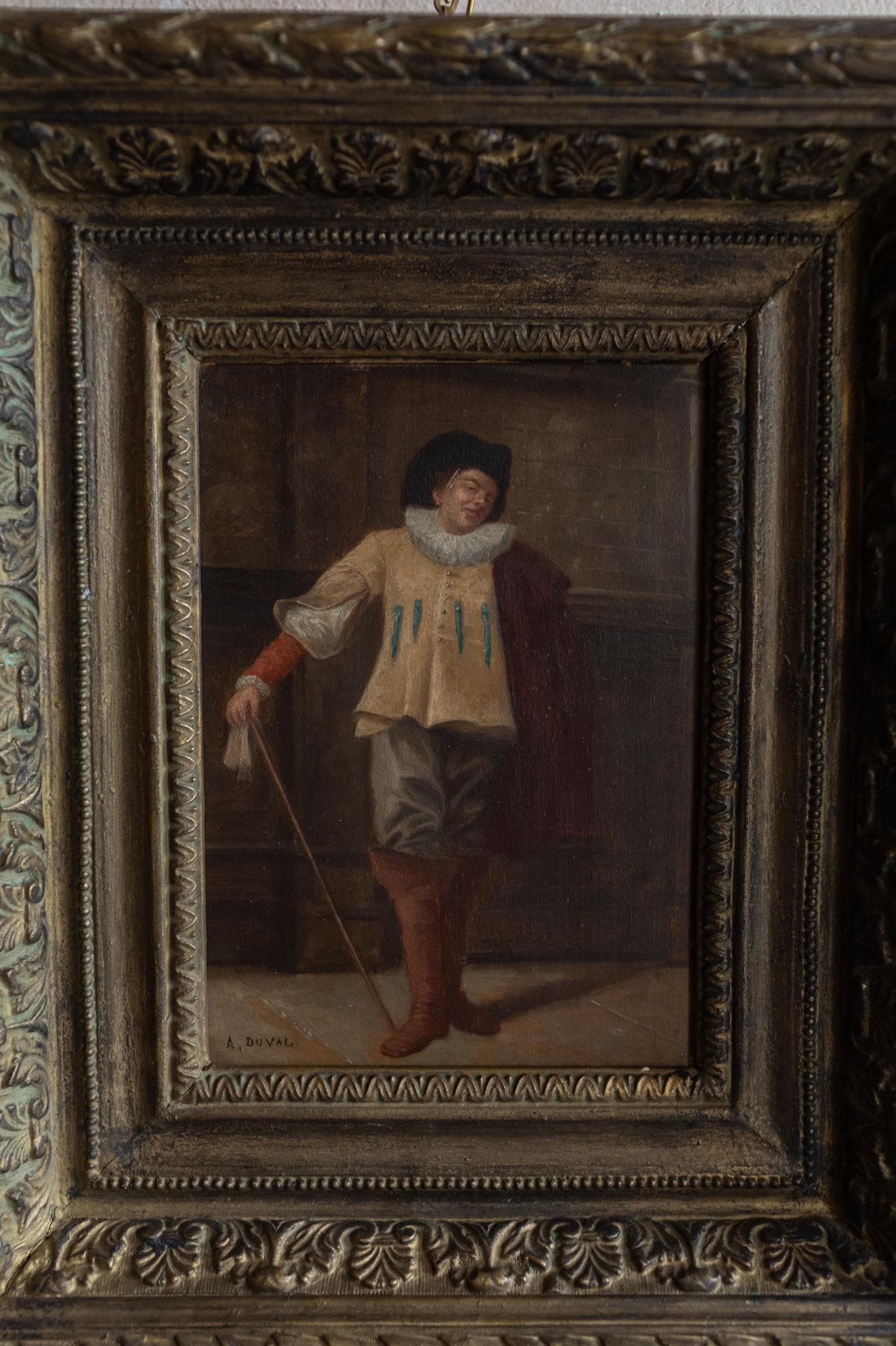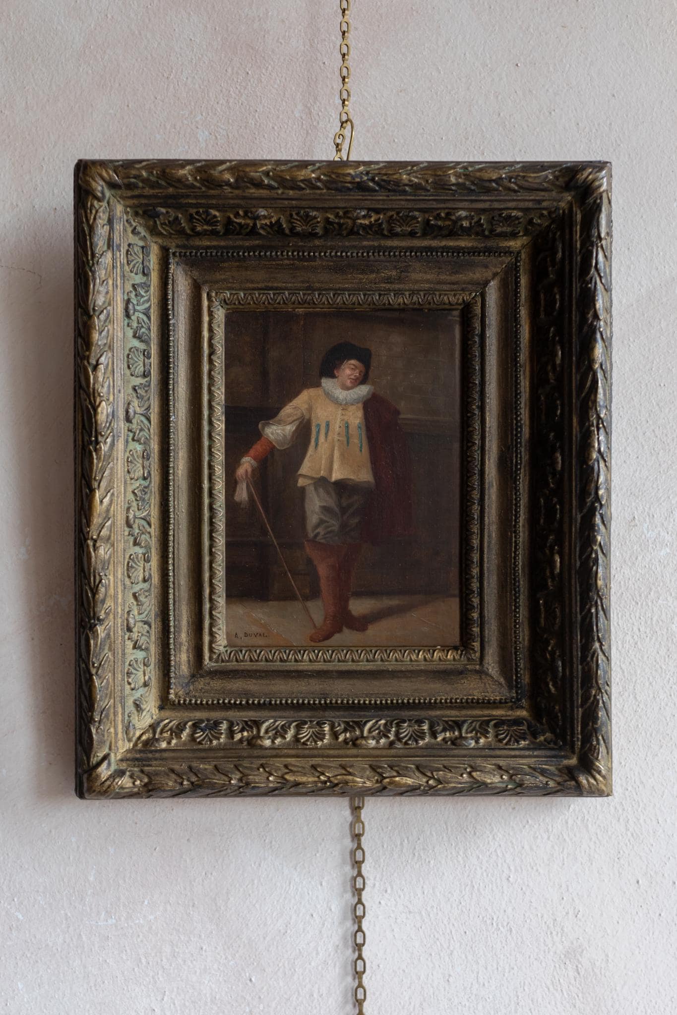 A charming late-19th-century French figure study painted on wood panel, Signed by the French artist "A Duval". Depicting a gentleman in period costume holding a walking cane. Full of character and theatrical flair, and presented in a richly carved antique gilt frame.