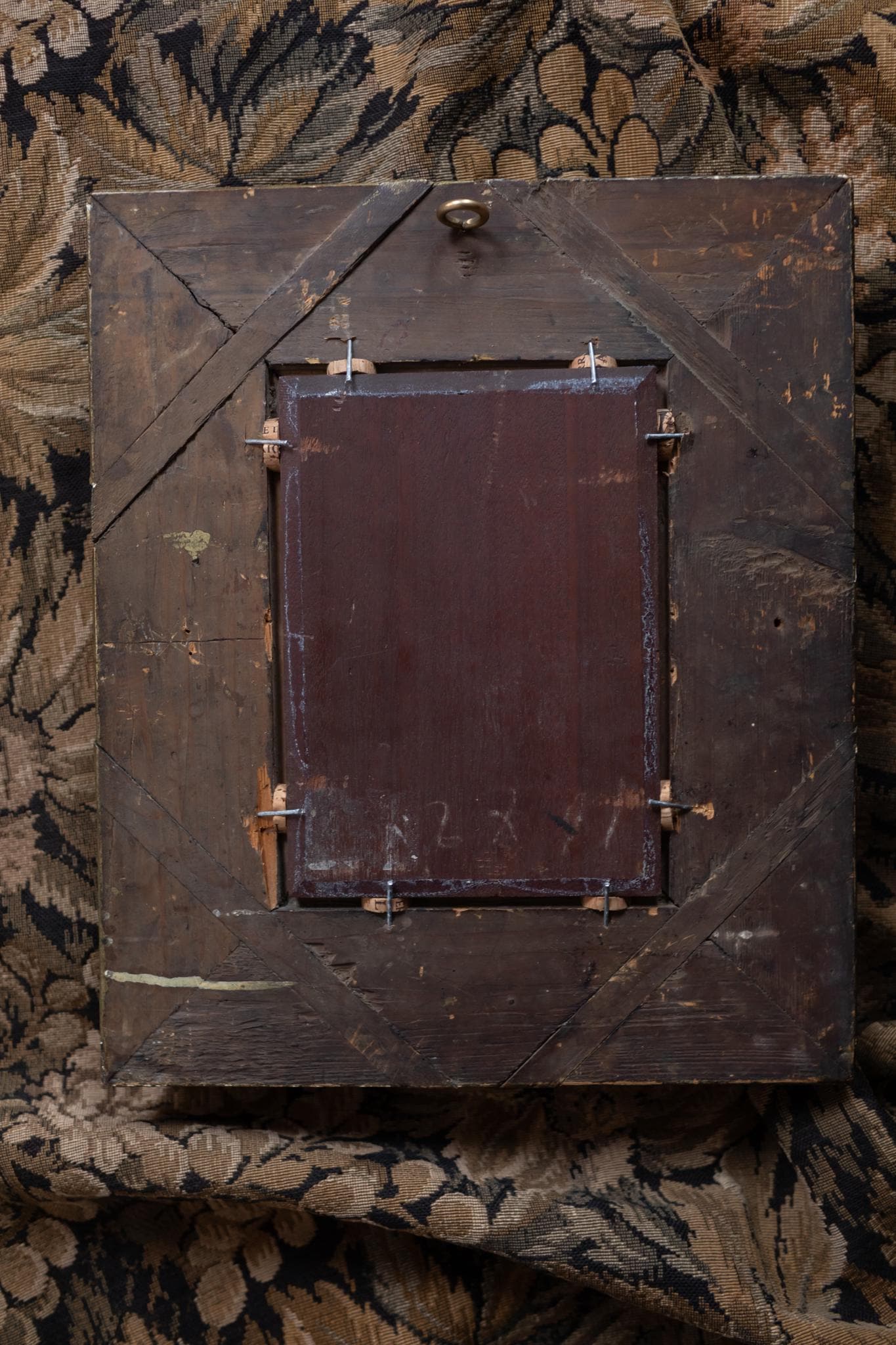 Good antique condition with small areas of expected wear. Panel is strong and stable. Frame shows age-appropriate patina and gentle rubbing that enhances its antique character. The painting is housed in its original ornate gilt frame, featuring layered mouldings, deep carving, and a rich patinated surface. The frame elevates the piece and adds strong decorative presence.
