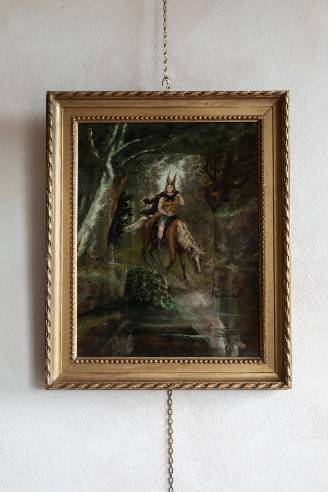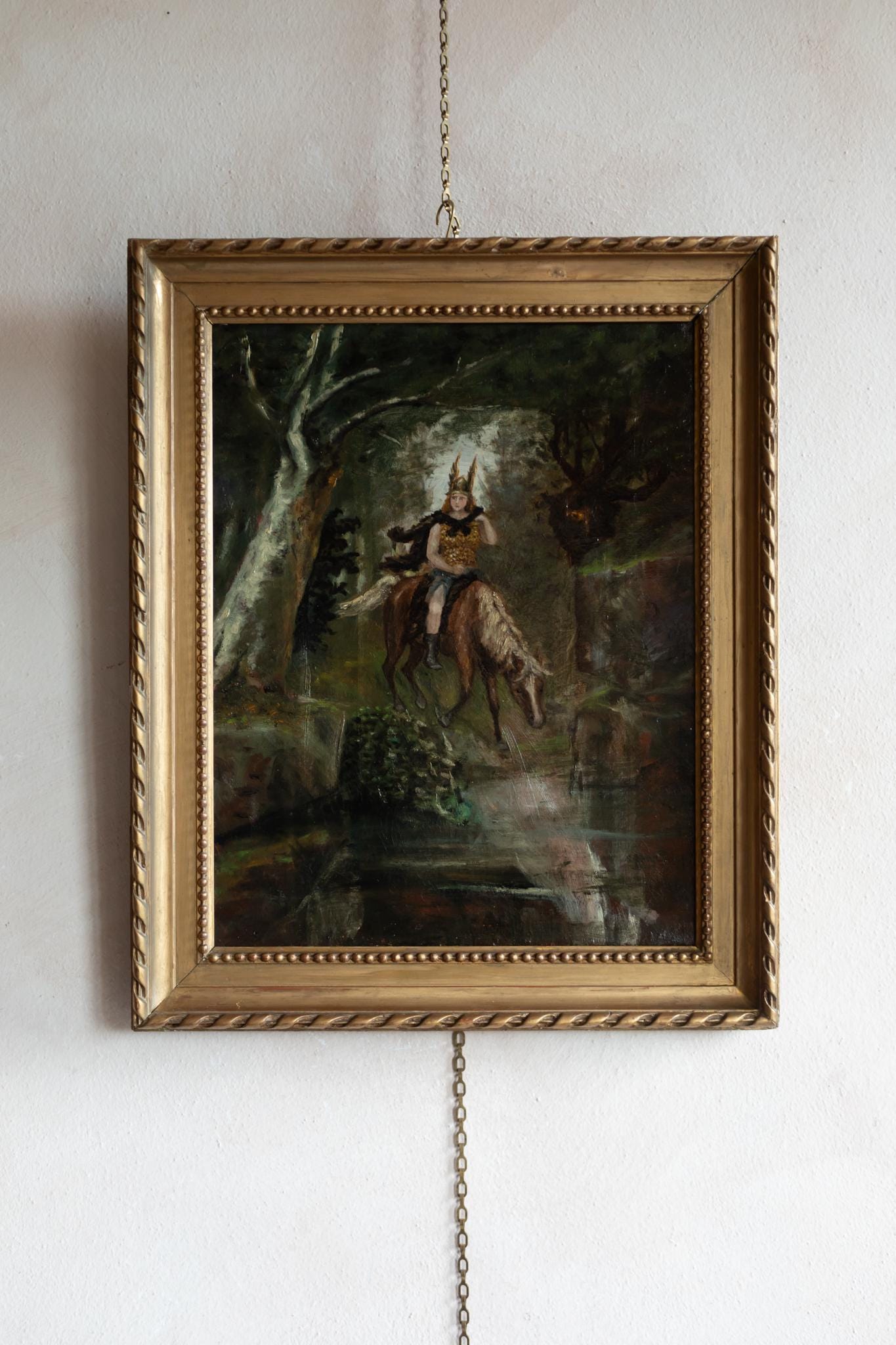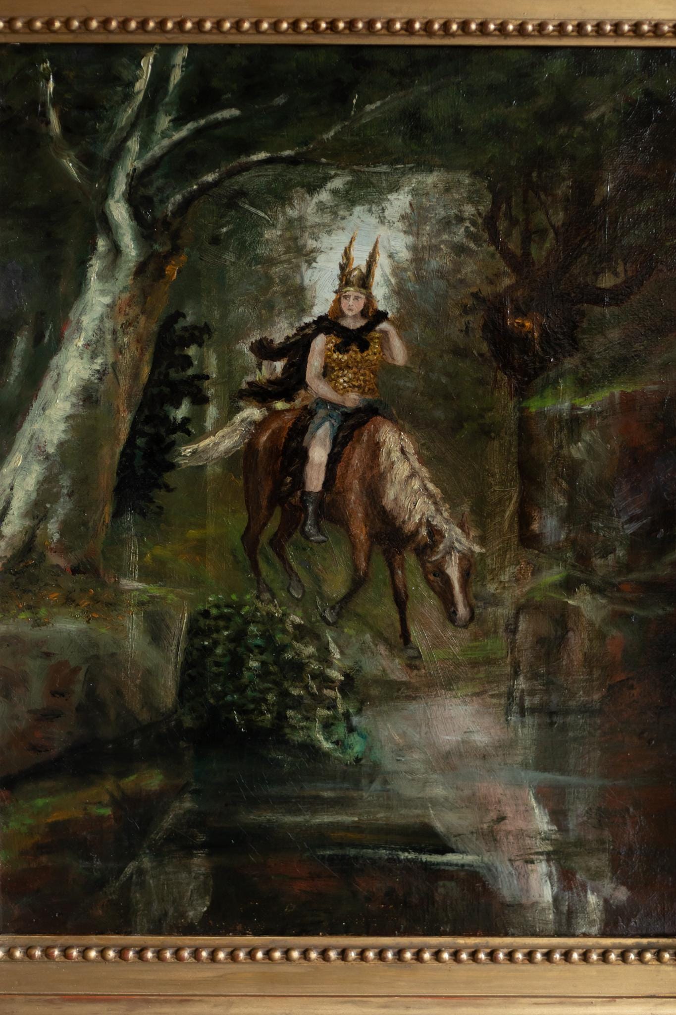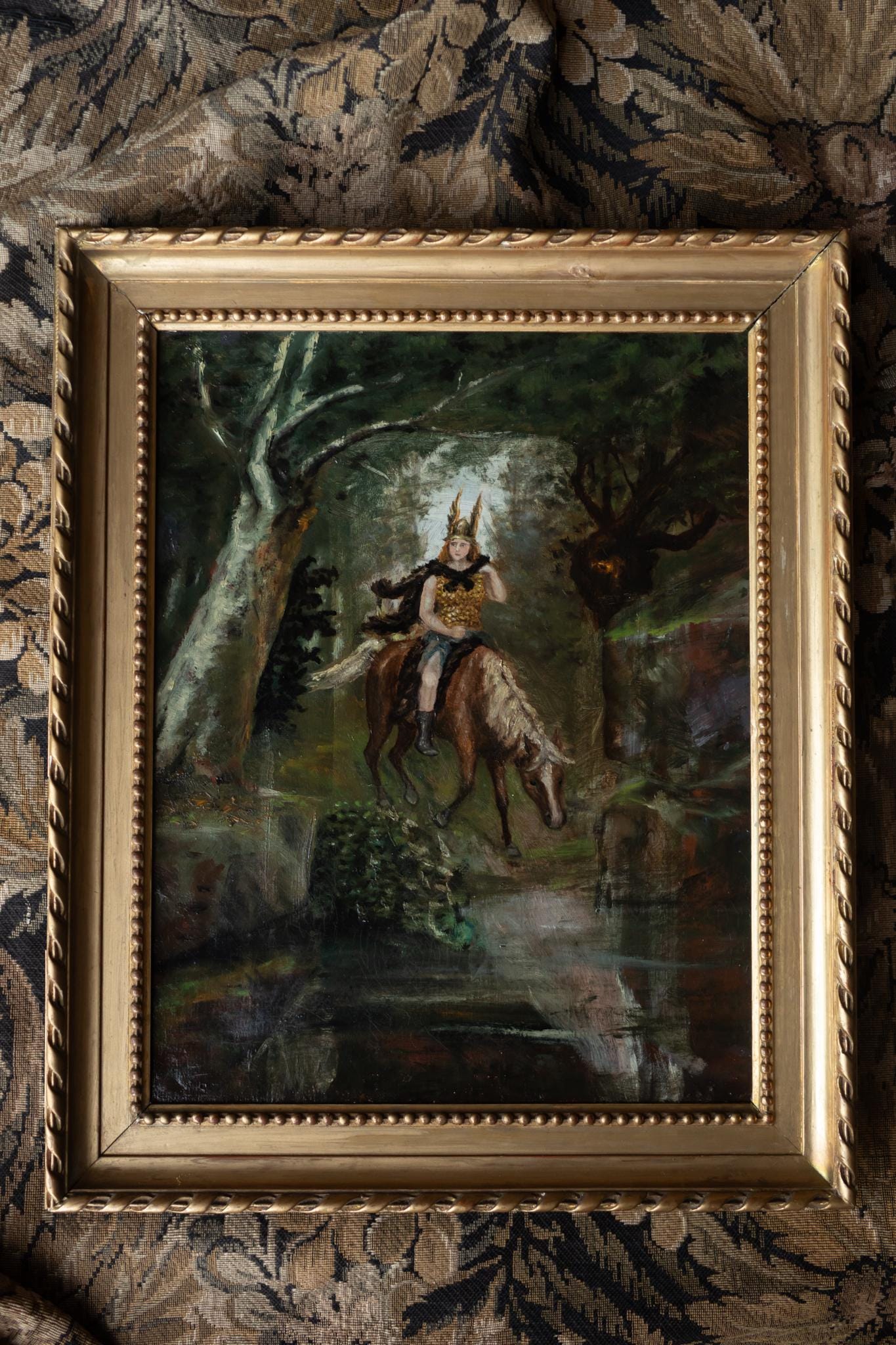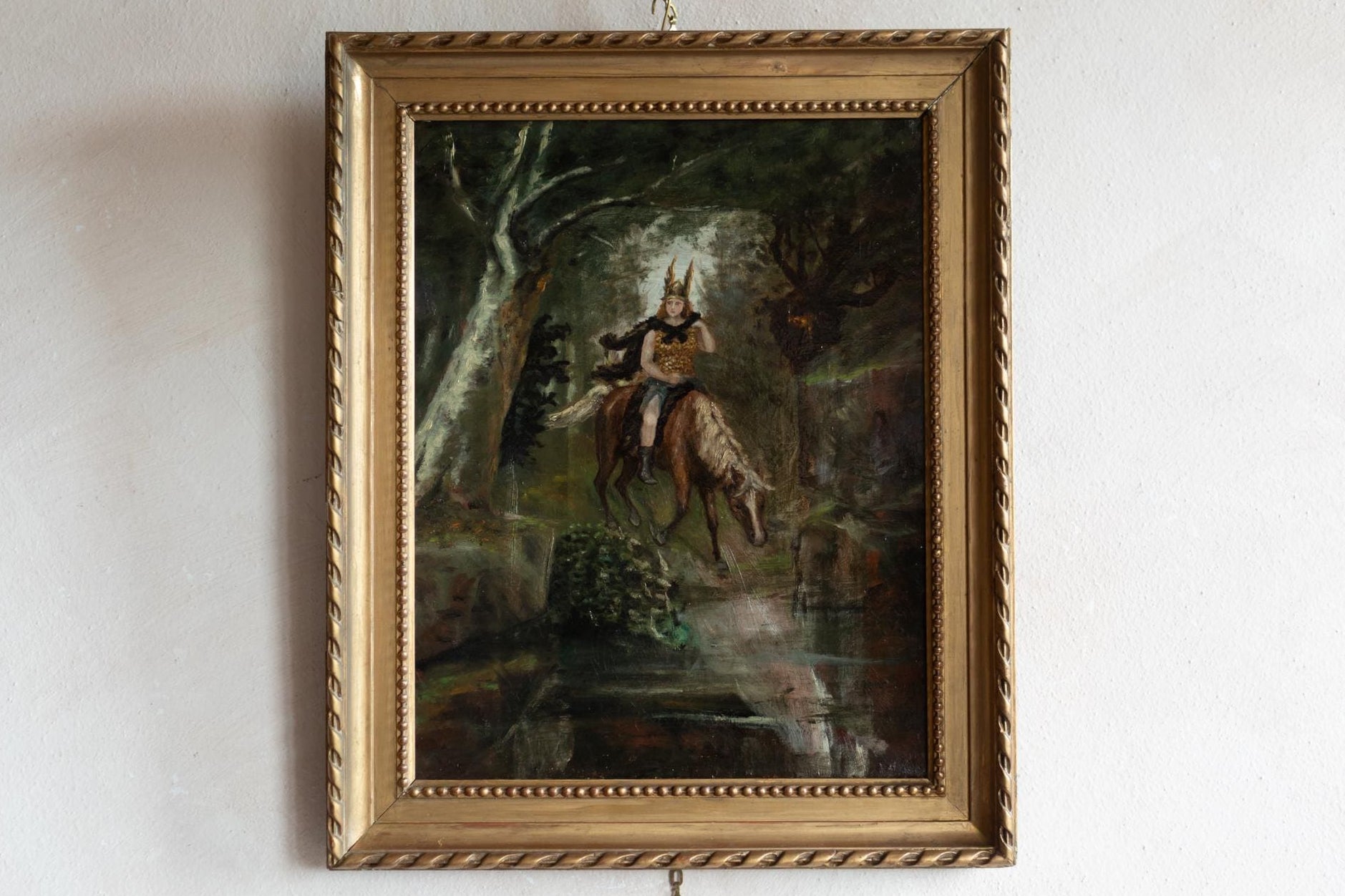 This evocative Paris School painting presents a powerful and atmospheric vision of Freya, the Norse goddess associated with love, fertility, battle, and fate. Shown riding through a dark forest landscape, the figure is both regal and dynamic, blending mythological symbolism with a distinctly late-19th-century painterly approach.