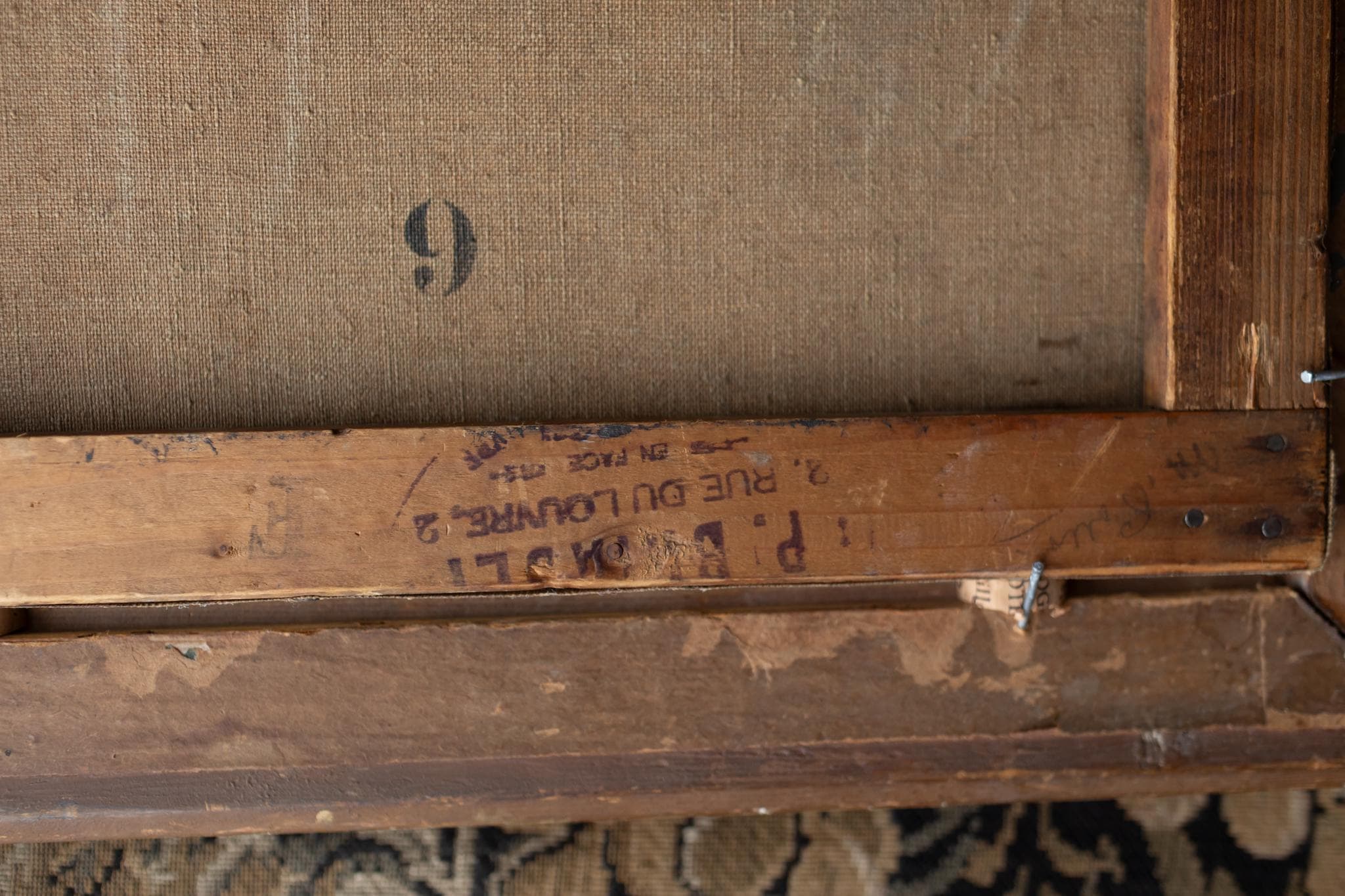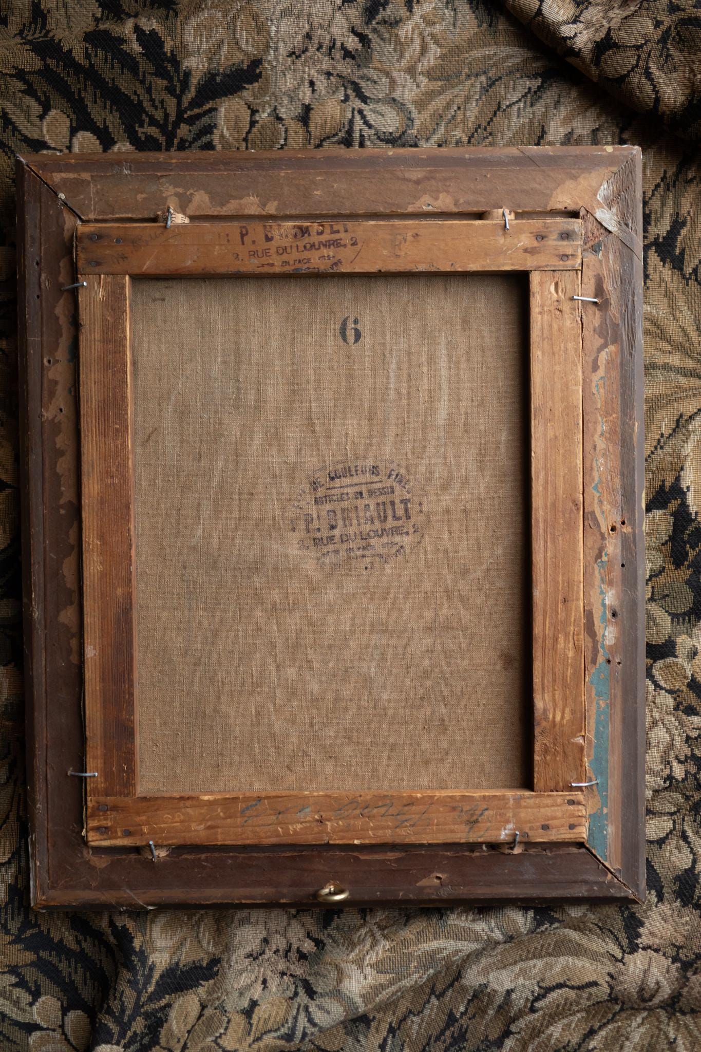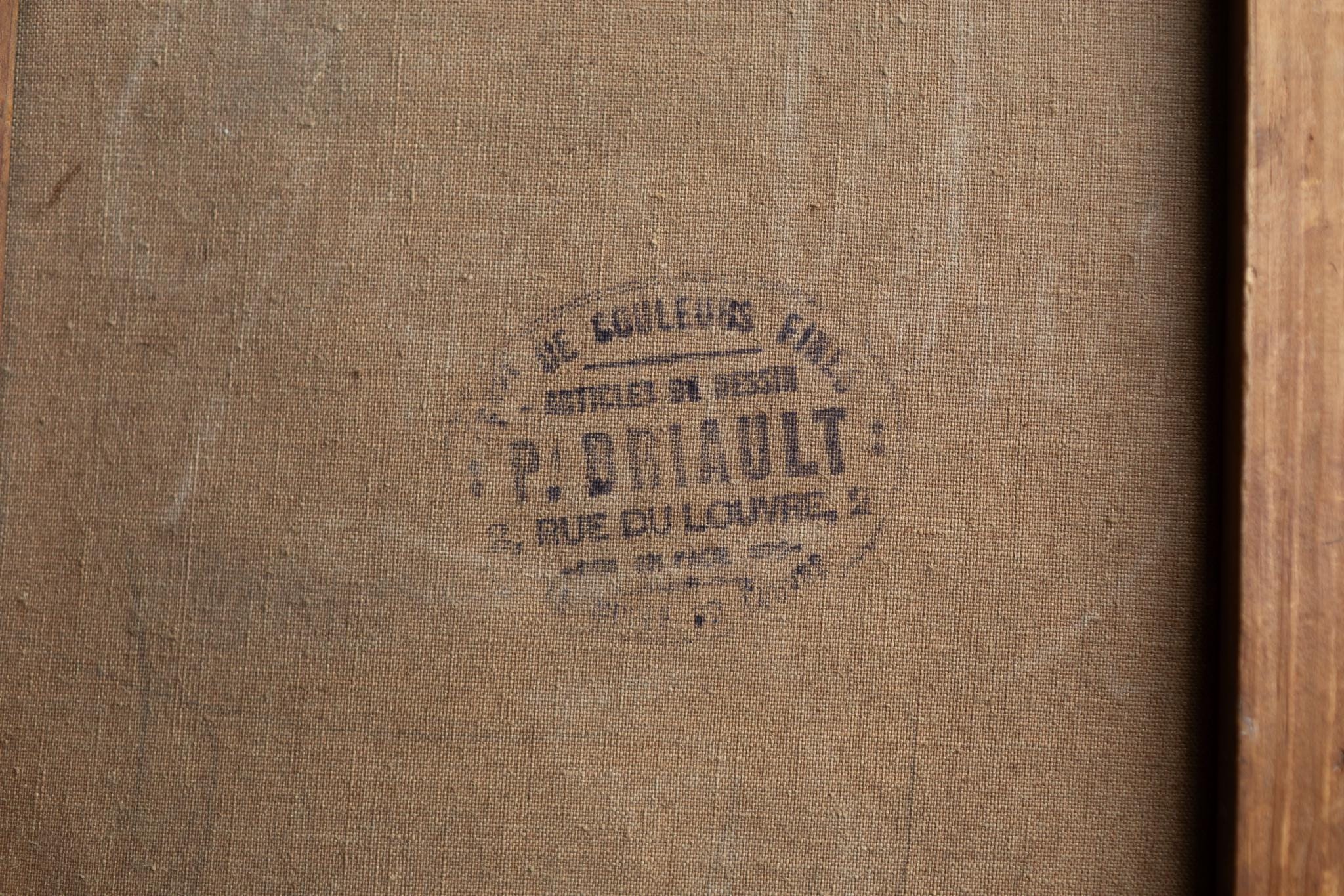 On the reverse, the canvas bears the stamp of a Paris art supplier located at 2 rue du Louvre, an address at the heart of the Parisian art trade. Such suppliers provided canvases and materials to professional artists and ateliers, further confirming the painting’s origin within the Paris School milieu.