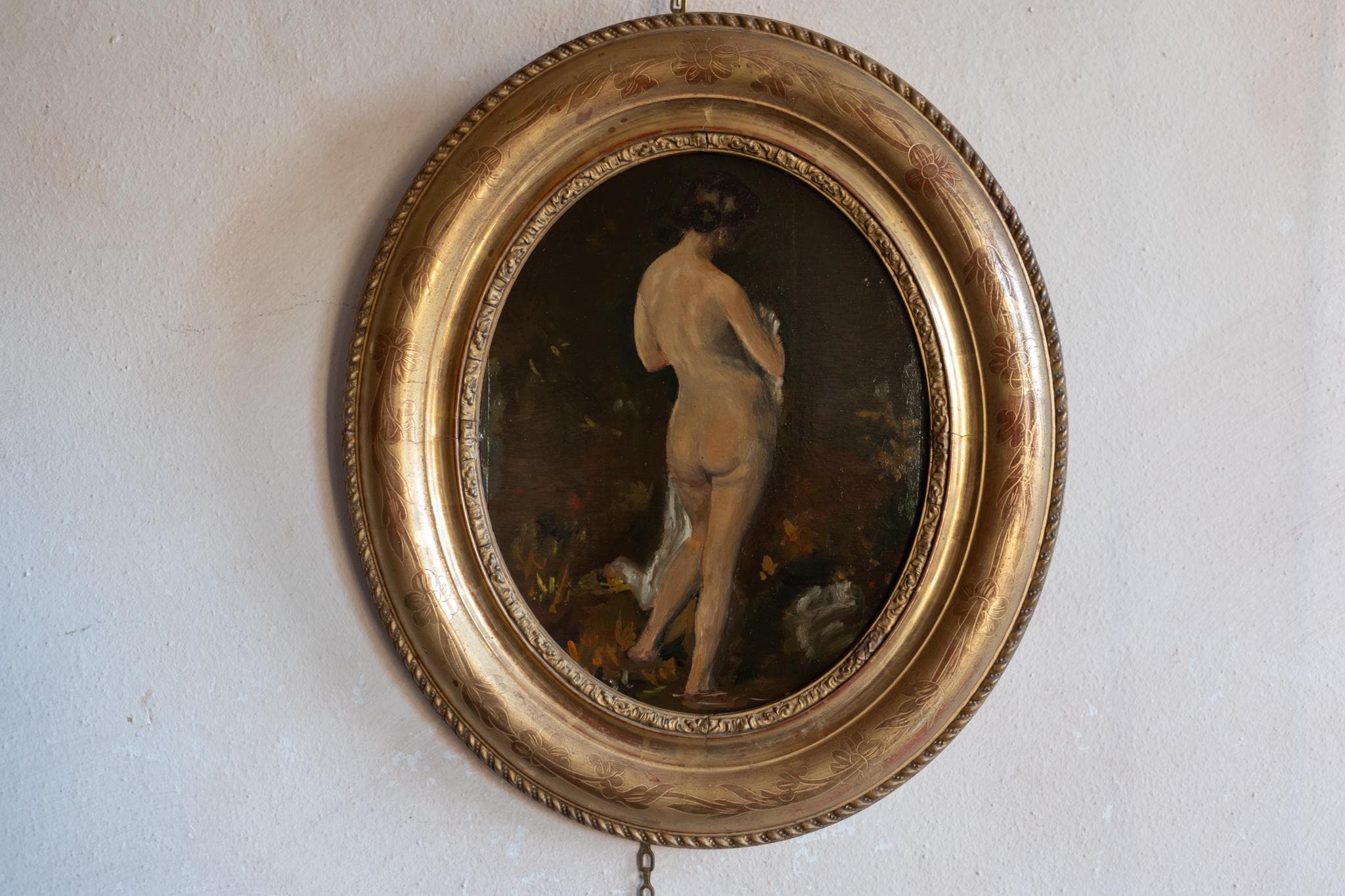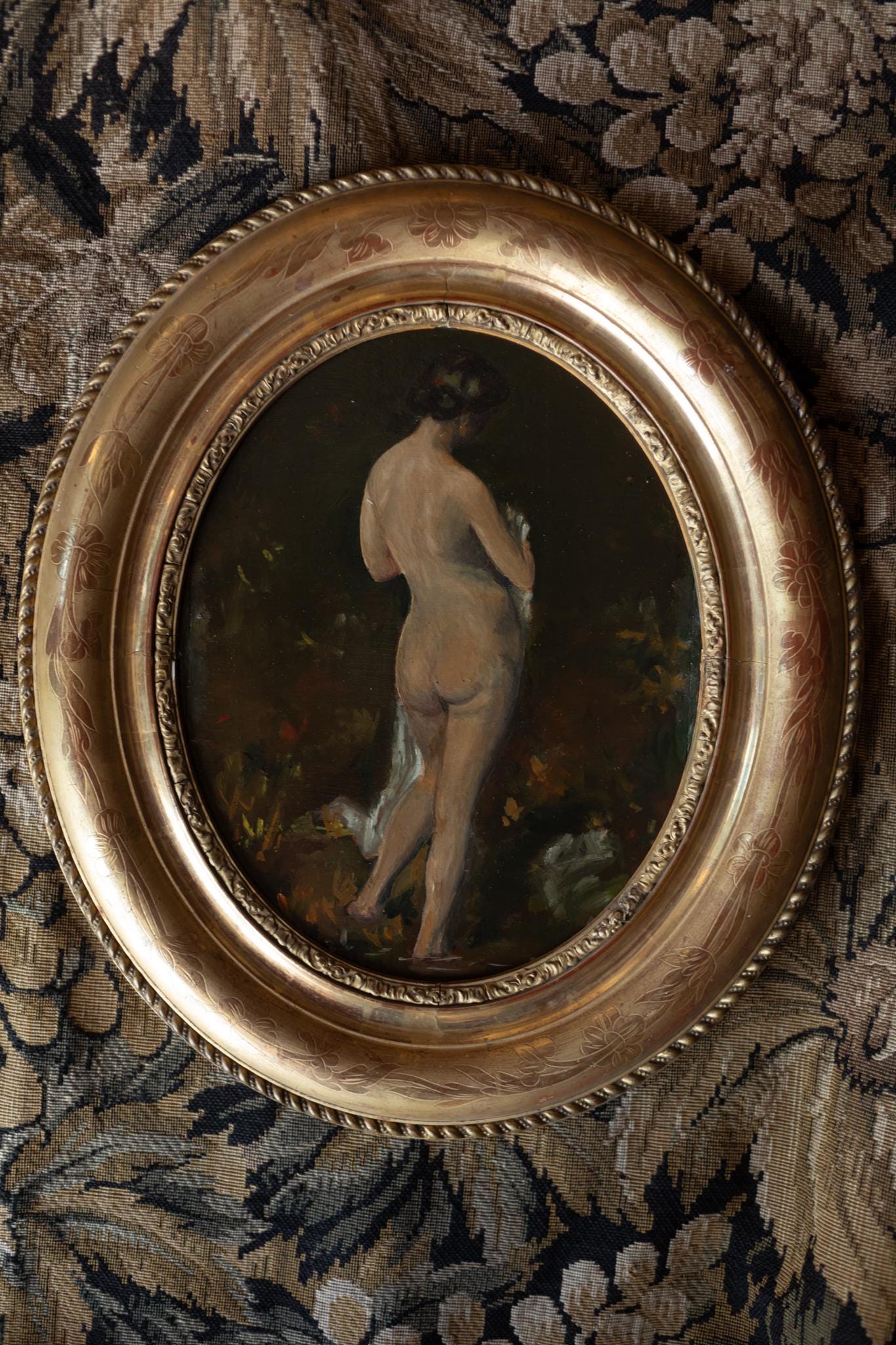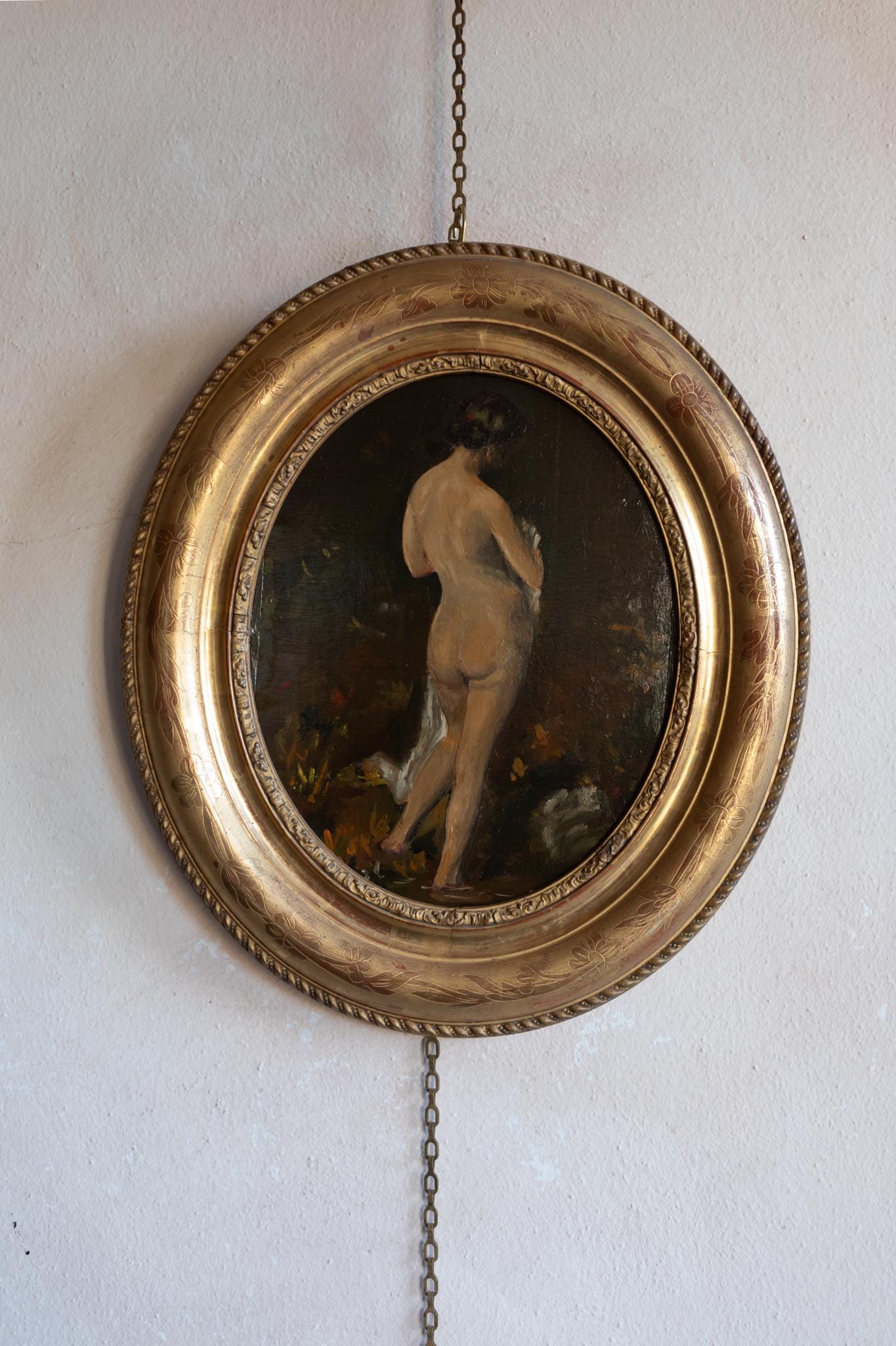 This atmospheric French painting depicts a standing nude seen from behind, her form softly illuminated against a deep, warm background. The artist’s brushwork and subtle tonal transitions reflect the influence of Academic Parisian atelier training (École de Paris) from the early 20th century. Works like this were often painted in the studios of Montparnasse or Montmartre, where artists explored the human figure with both realism and modern looseness. The use of earthy tones and lively impasto gives the piece a spontaneous and tactile charm. The round gilt frame, engraved with floral motifs, complements the composition beautifully — its shape enhancing the intimacy of the pose. Together, painting and frame form a striking decorative object and collectible example of early 20th-century Parisian art.
