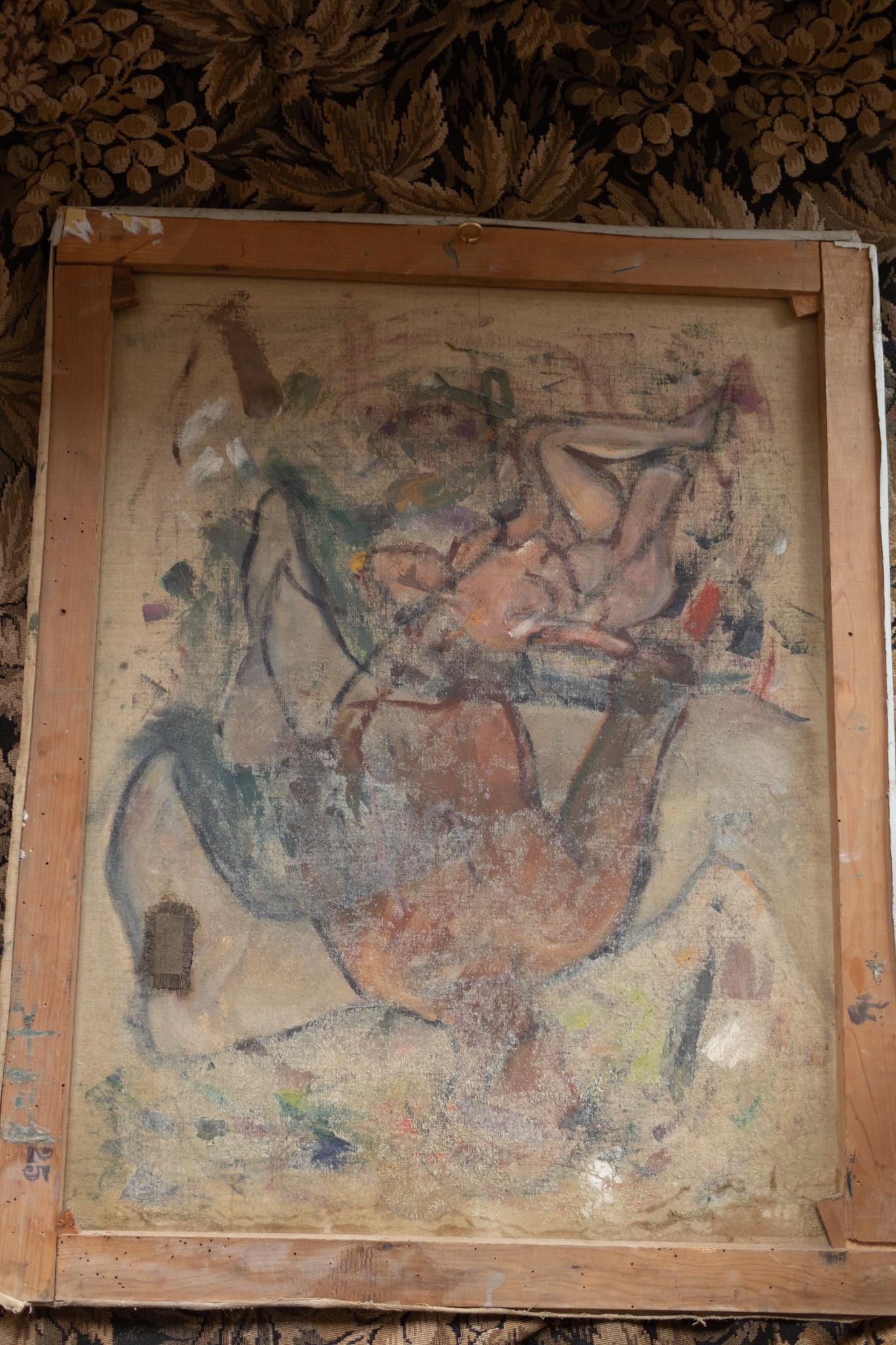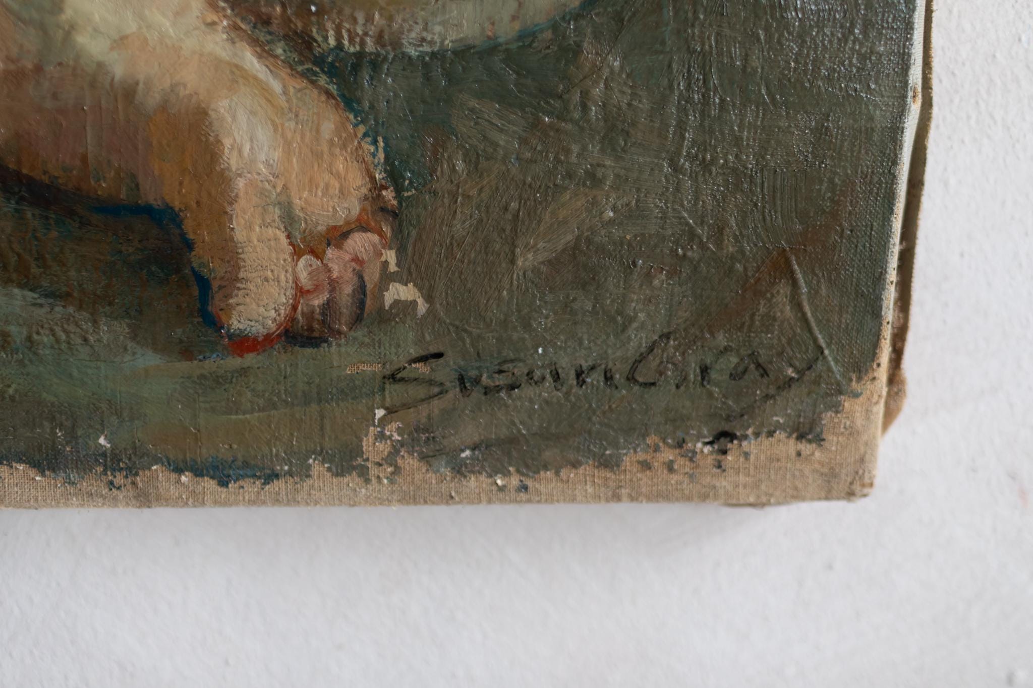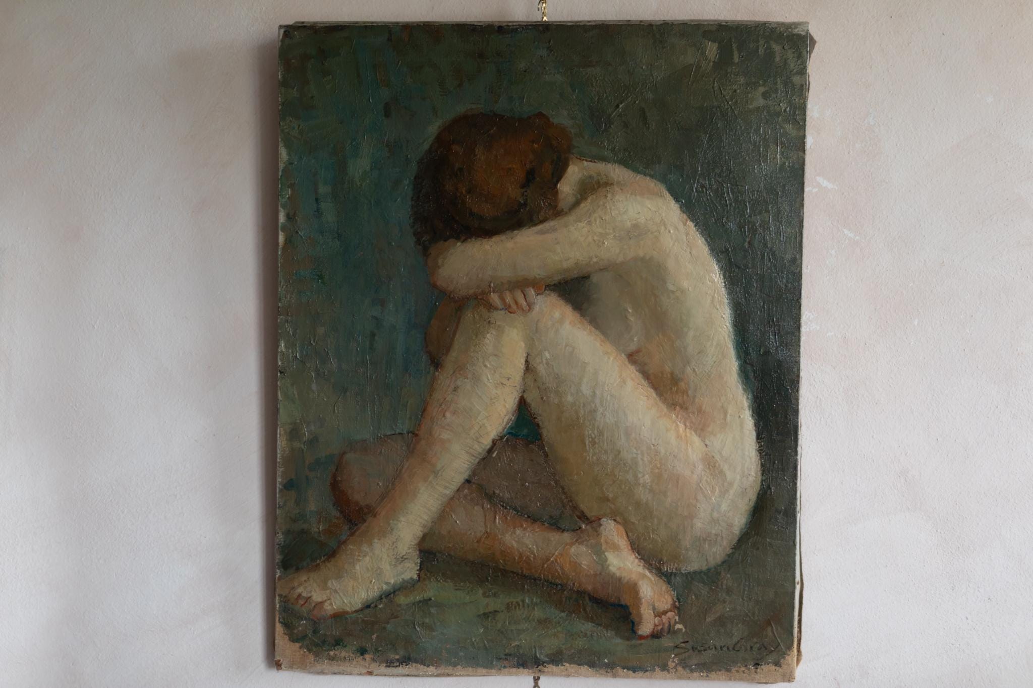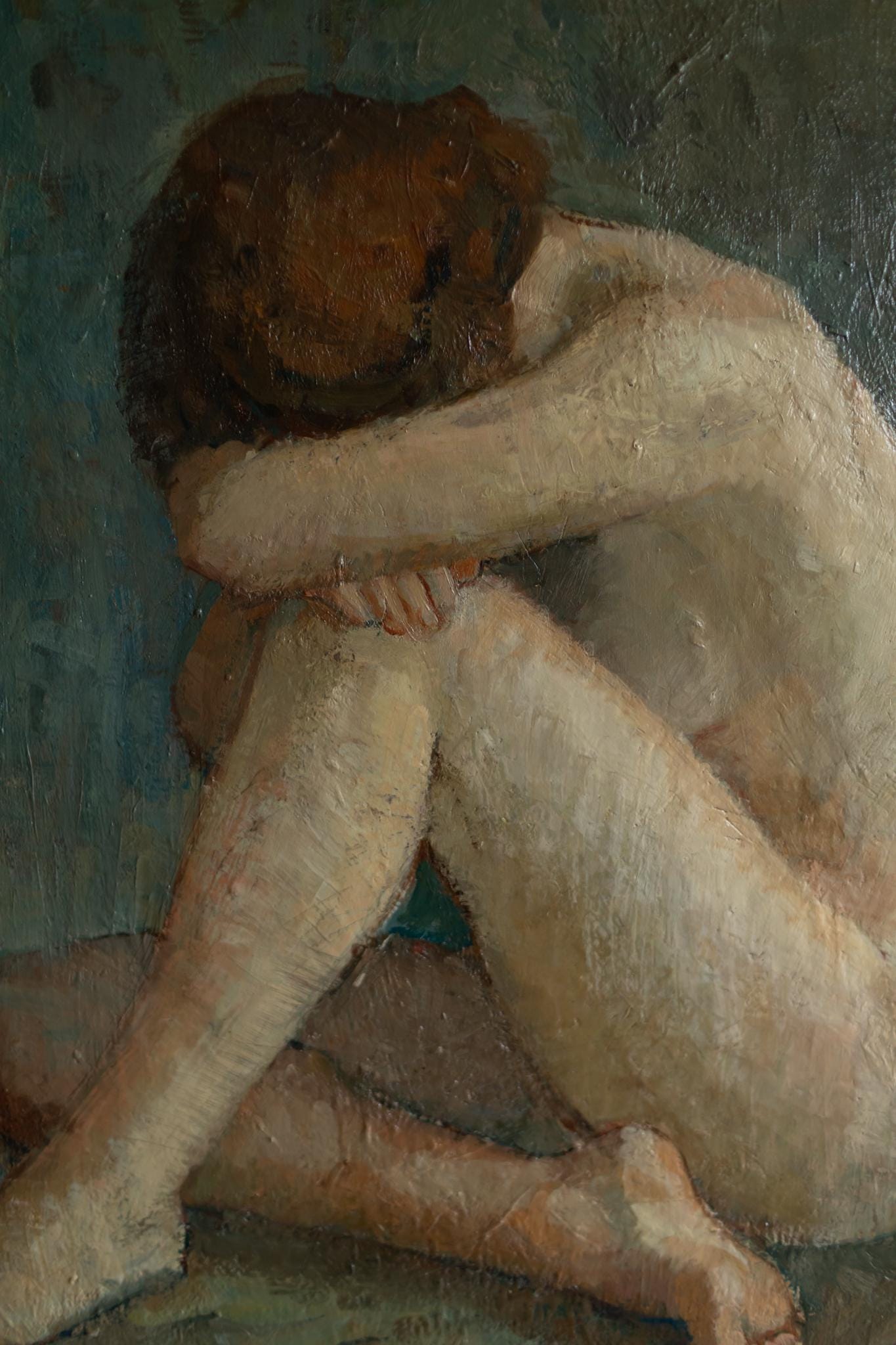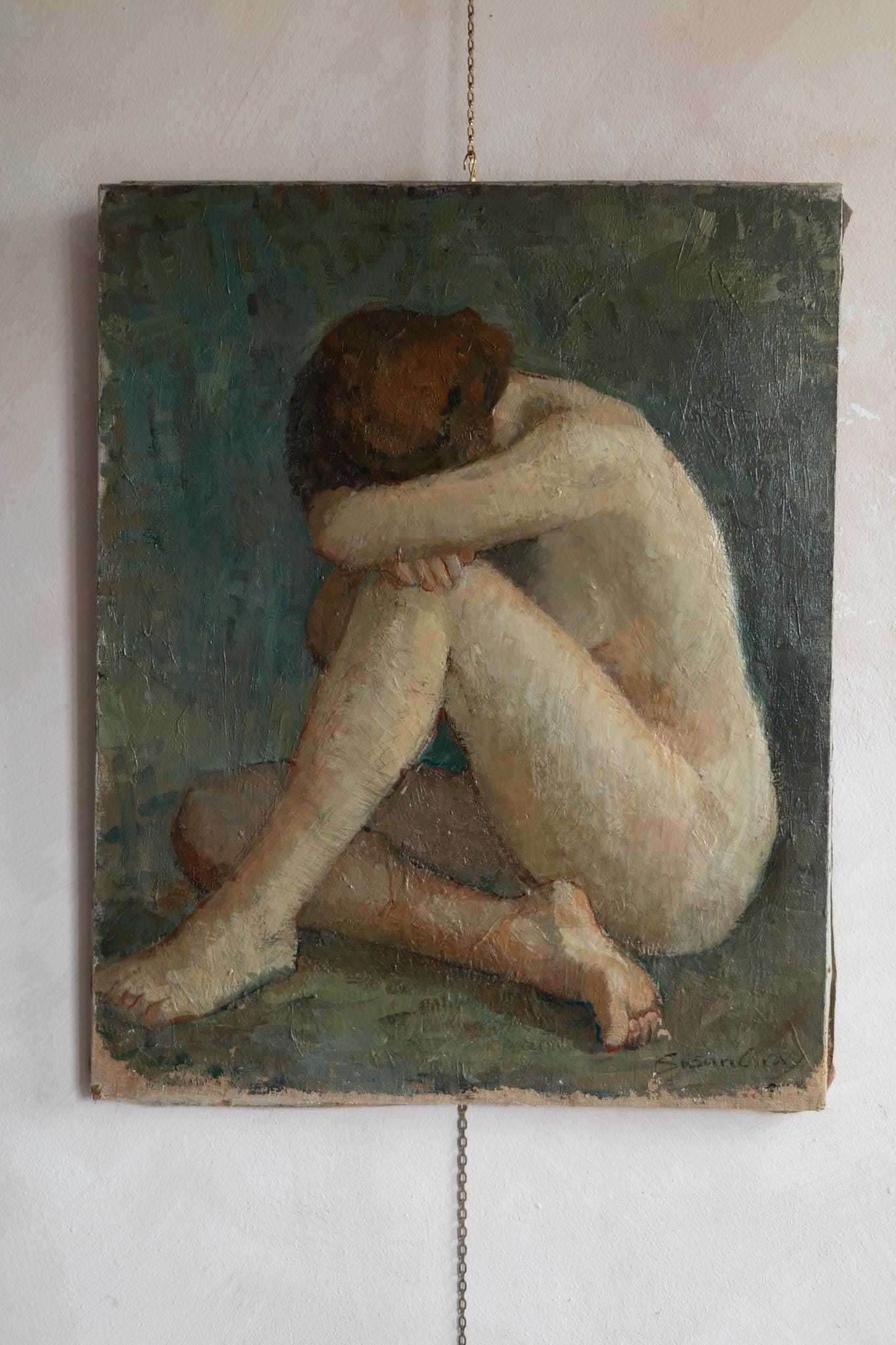 Circa 1930s, A striking early 20th-century nude study signed at lower right. Painted in the impressionist style of the Paris School, the work captures a seated female figure in a contemplative pose, her form defined by bold, textured brushstrokes. The muted palette and raw handling recall Impressionist and post-Impressionist influences, where atmosphere and emotion take precedence over detail. Likely created as a studio piece or academic exercise, it reflects the vitality of Parisian art training in the early modern era. A powerful and intimate composition for collectors of Impressionist and Paris School works. A beautiful large faceless nude antique oil painting of a woman, wonderful layered colours. This painting has a bit of paint loss and the bottom of the work, what adds to it's artistic look. The painting has been the the restorer for a professional cleaning and new varnish applied. The type of varnish that was added was specifically one that would prevent any additional paint loss or flaking in the near term. Signed in the lower right corner.