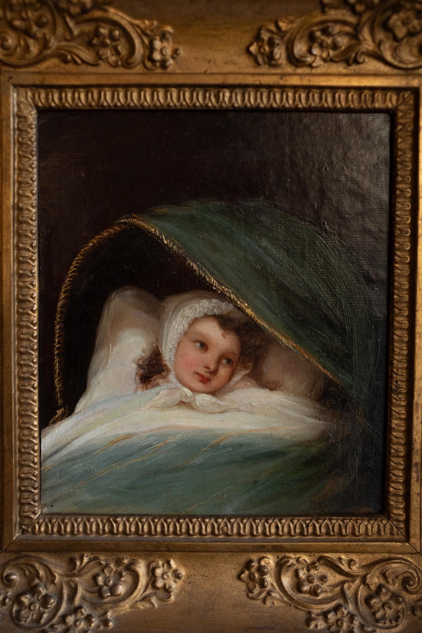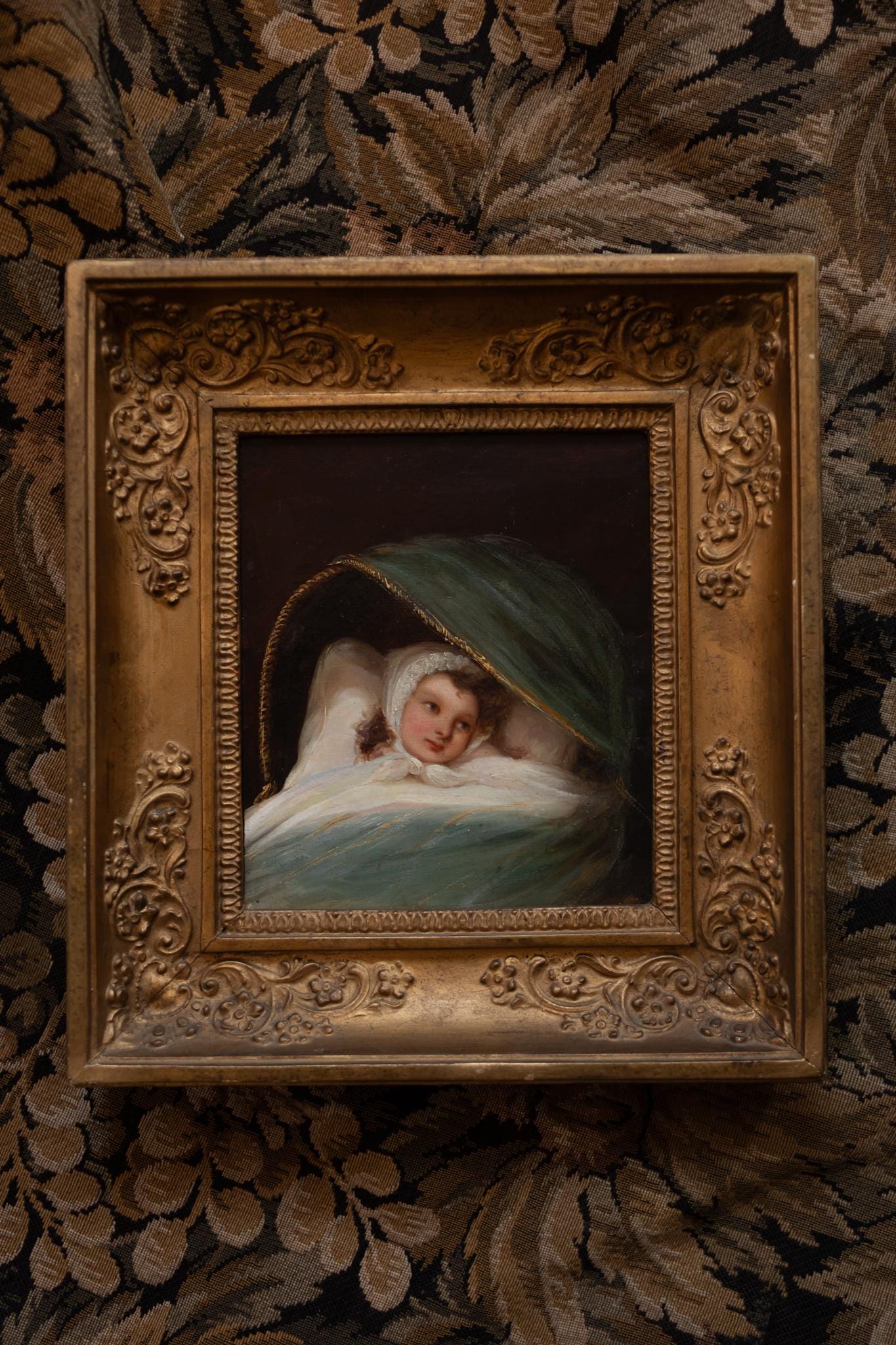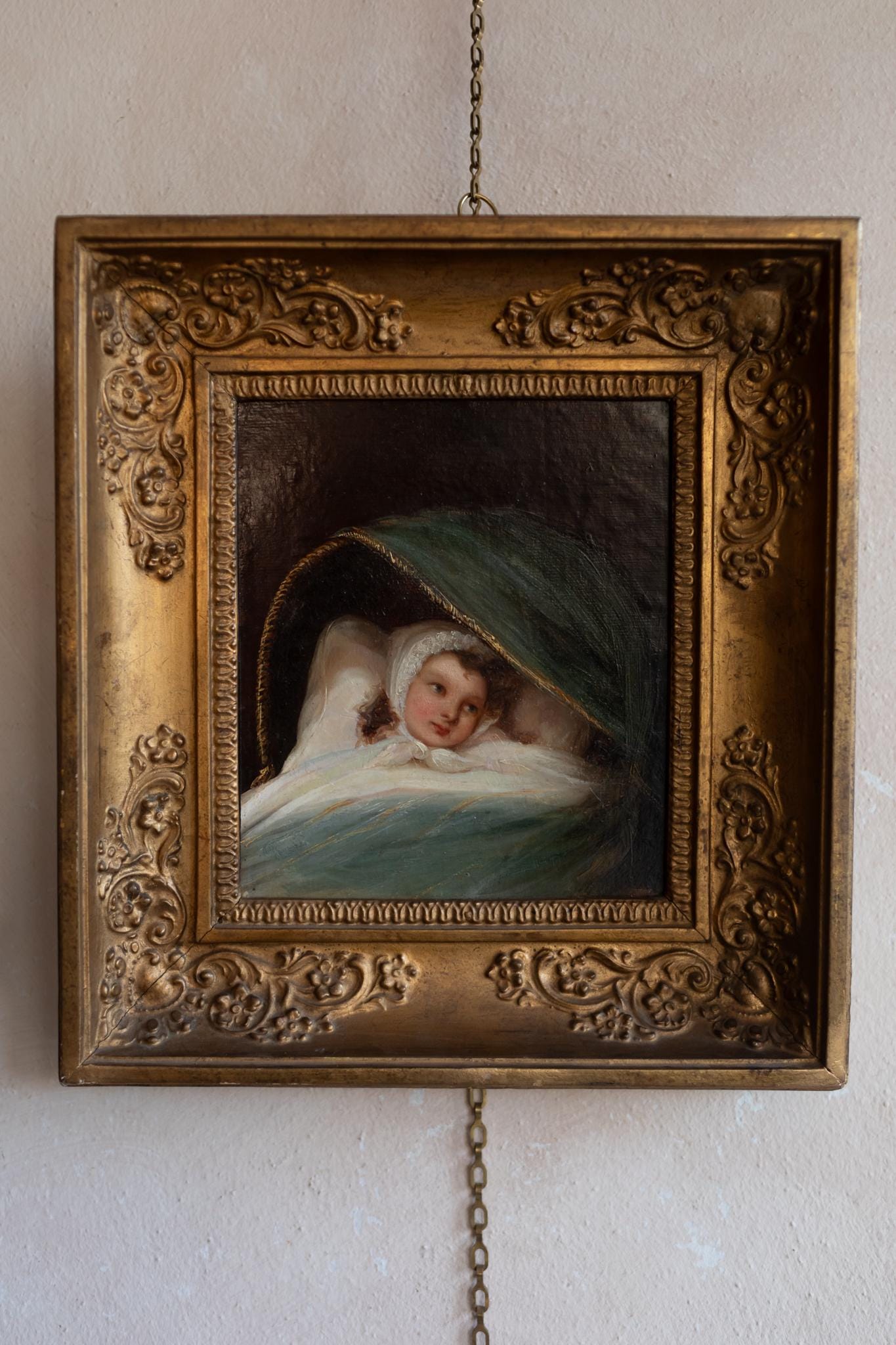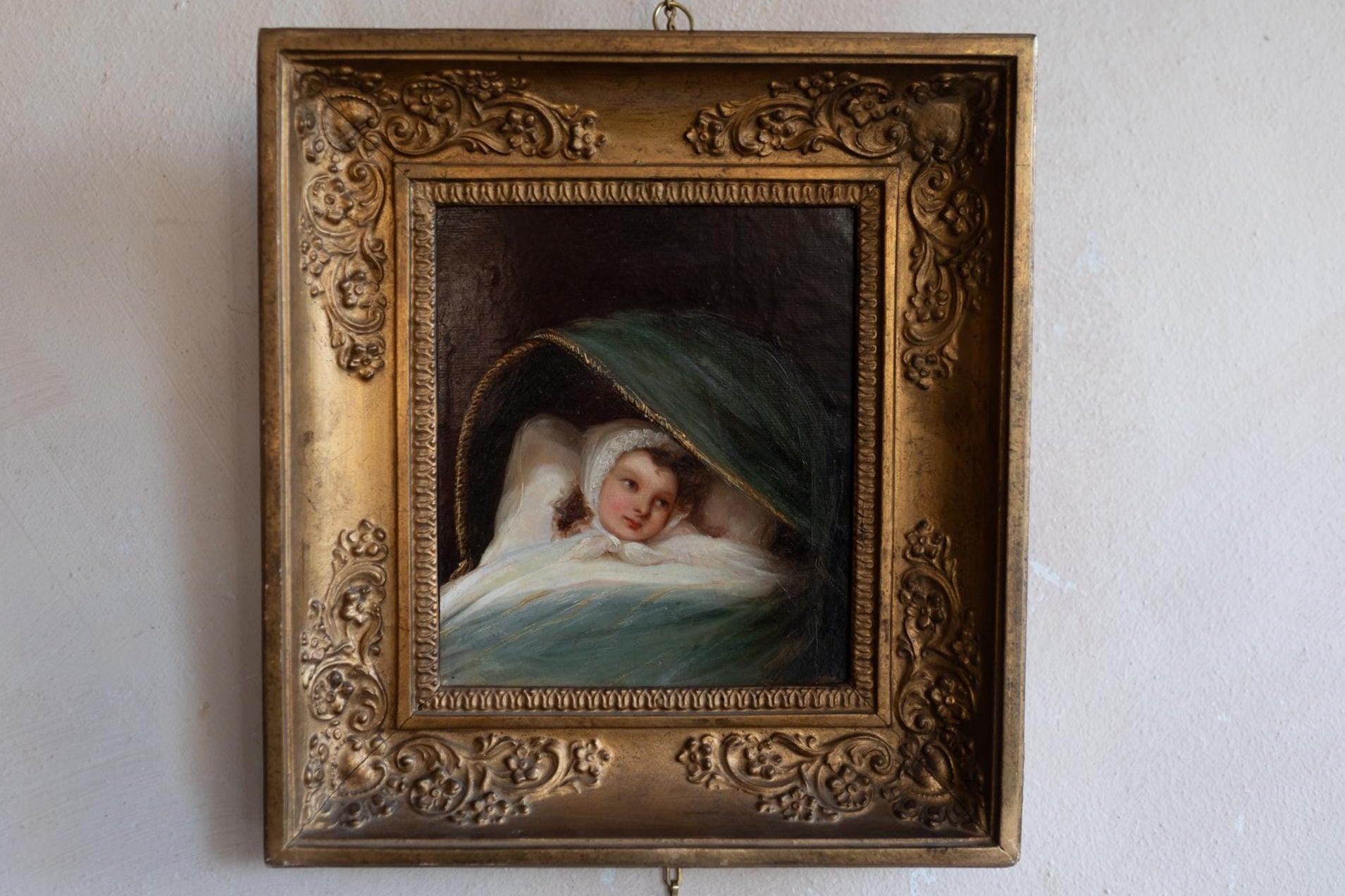 This charming mid 19th-century (Circa 1840) oil painting depicts a young woman resting beneath a sweeping green canopy, her delicate face framed by a white bonnet. Painted with soft, romantic detail, the work captures the era’s fascination with innocence and quiet intimacy. The artist’s refined brushwork brings warmth to the sitter’s expression, balancing sentiment with elegance. Smaller in scale, the painting was likely created for a private interior, offering a glimpse of domestic refinement during the Romantic period. It is presented in its original gilt wood frame with floral and scroll motifs, typical of the Louis-Philippe style, enhancing its decorative and historical appeal. This painting is in good condition for it's age. The frame is very good quality. This painting has recently been to the restorer for a professional cleaning and reset in its frame. Please see all photos.