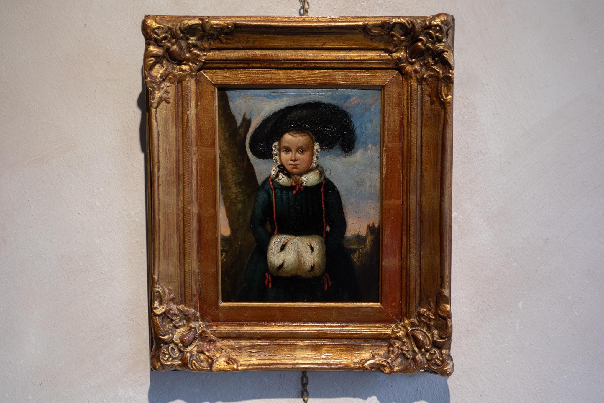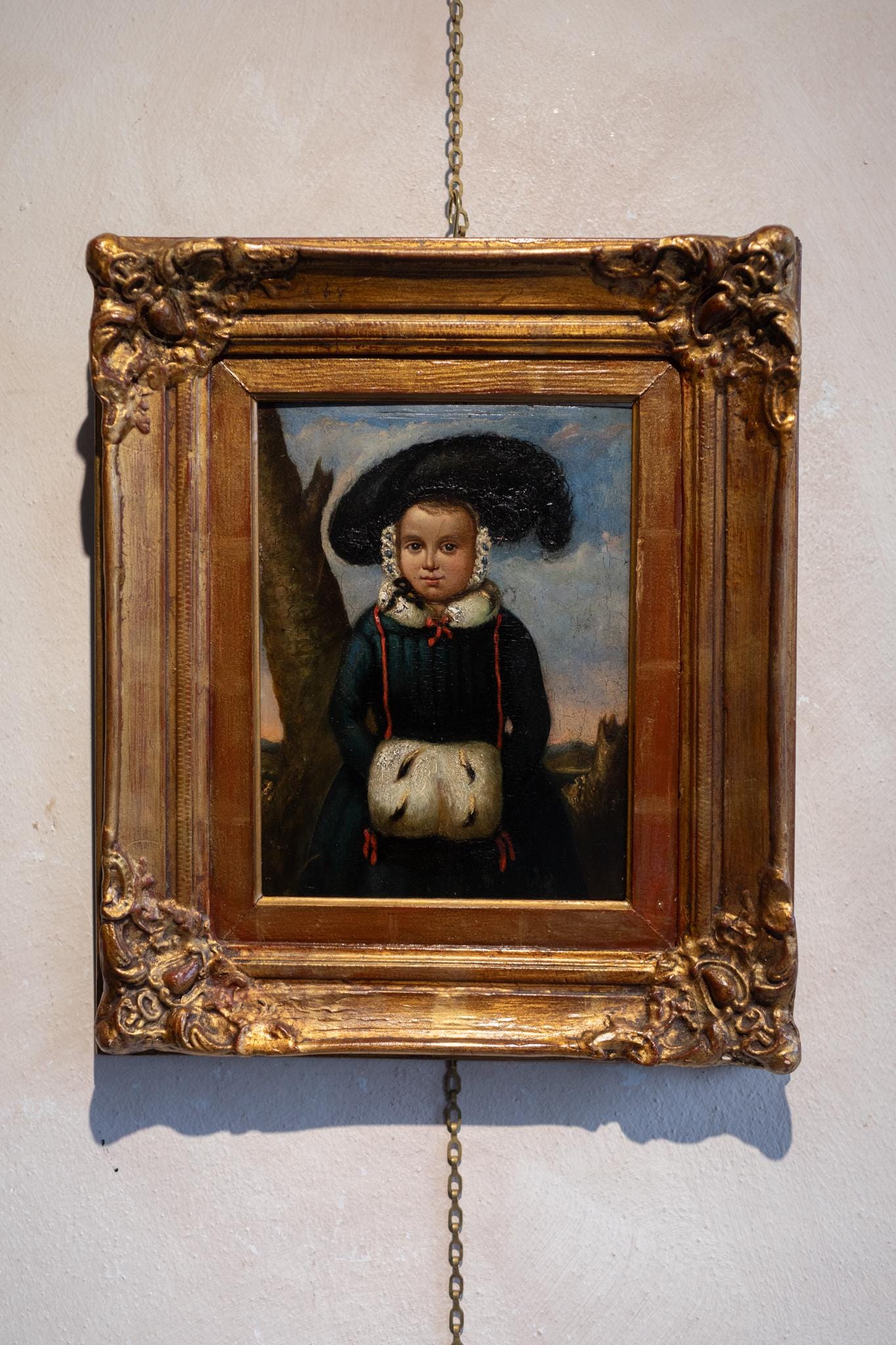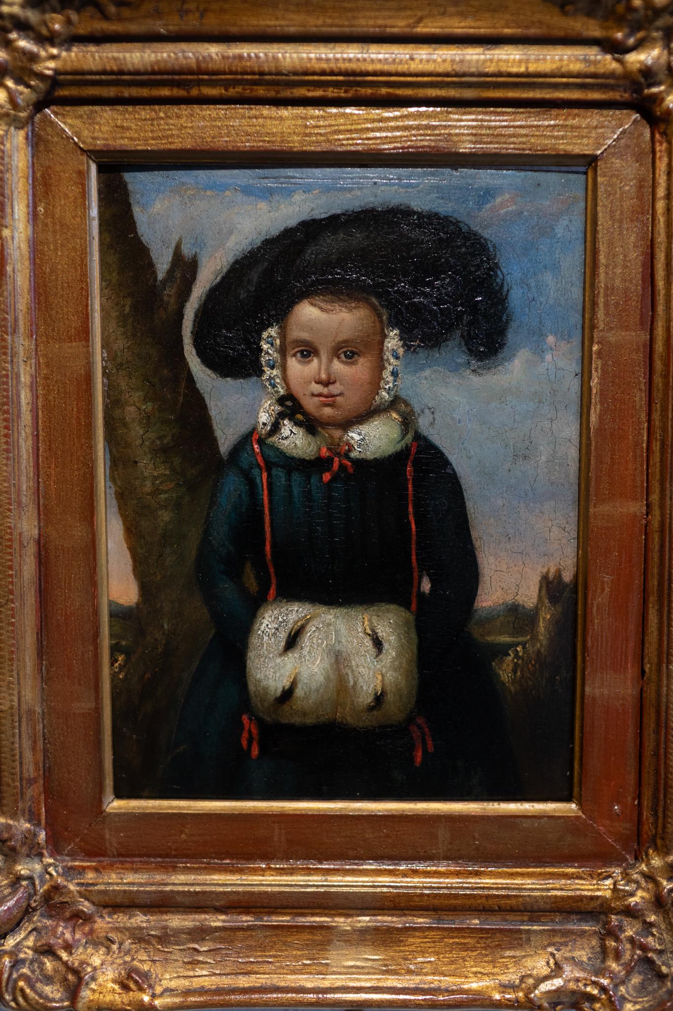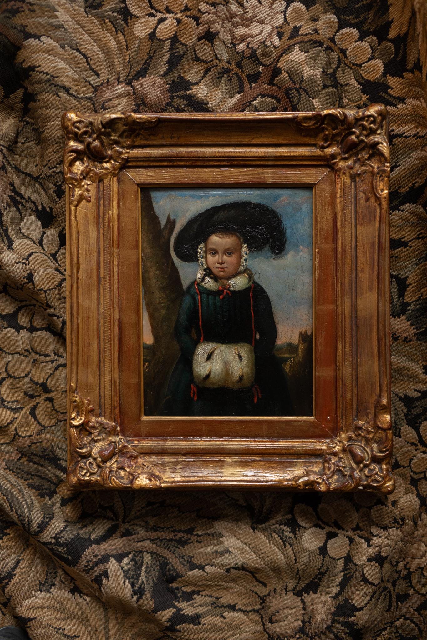 This charming mid-19th-century French portrait depicts a young girl from the Alsace region of France, dressed in traditional regional costume. She wears the distinctive black “grand nœud” bow headdress, accented with lace at the cheeks and vivid red ribbons, paired with a dark dress and wide lace collar. A small fur muff, held delicately in her hands, adds a seasonal touch of warmth and refinement. Set before a simple landscape, the young girl is portrayed with direct innocence, a hallmark of vernacular portraiture. The ornate Louis-Philippe gilt frame, with its scrolling foliage and rich patina, completes this evocative family heirloom from provincial France. This painting is in good condition for it's age. Comes in it's original antique gold frame. Please see all photos.