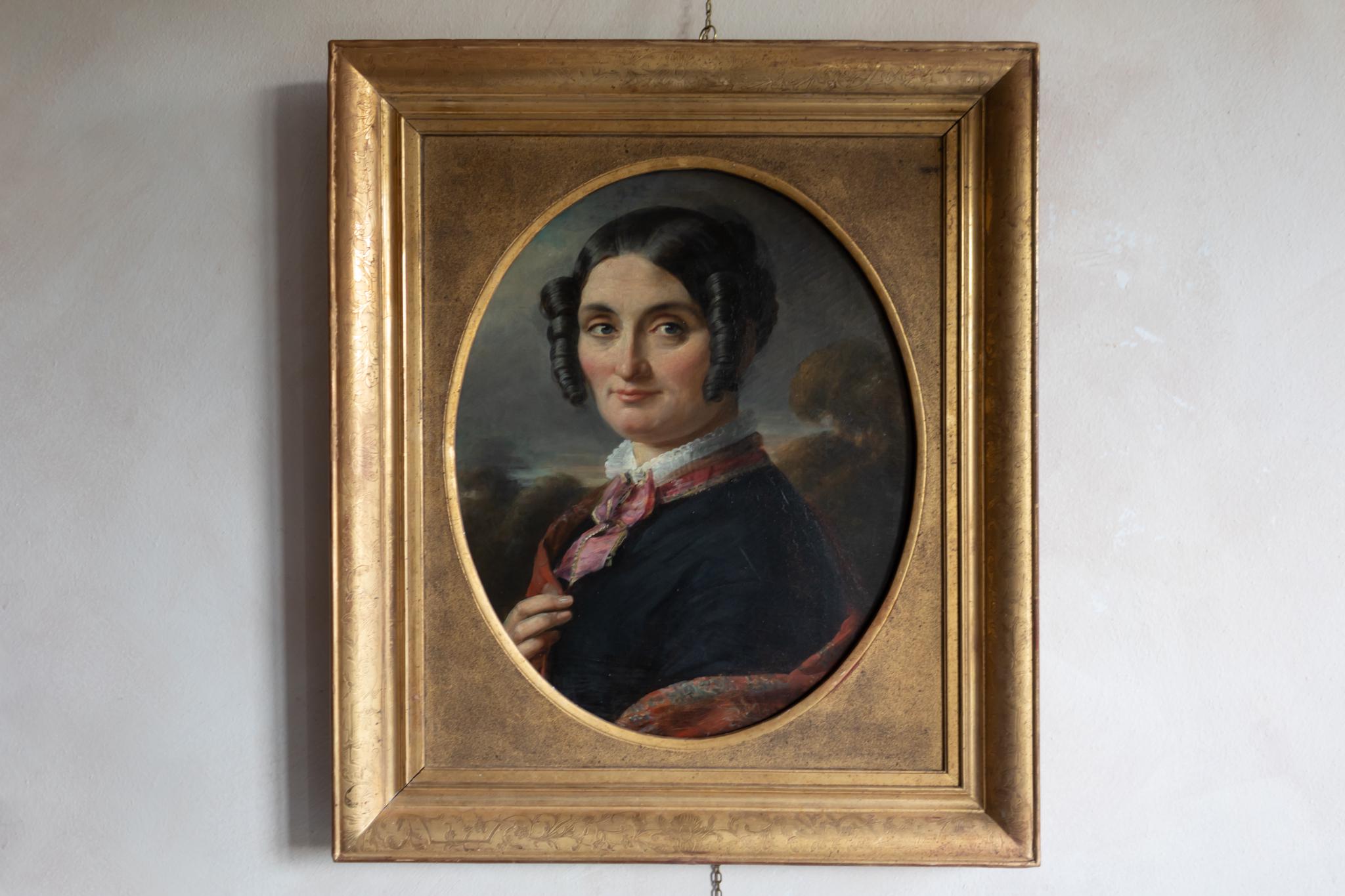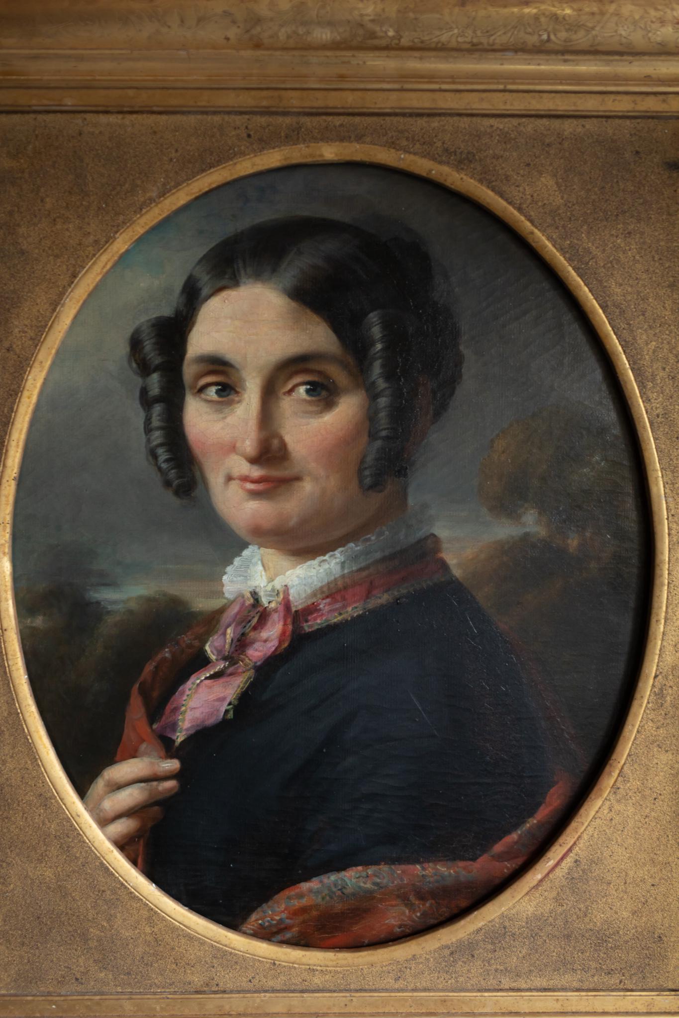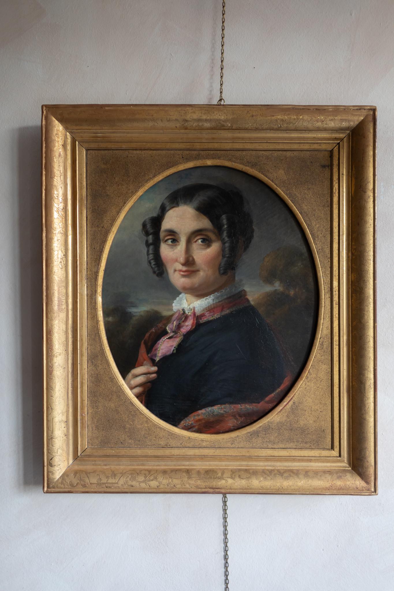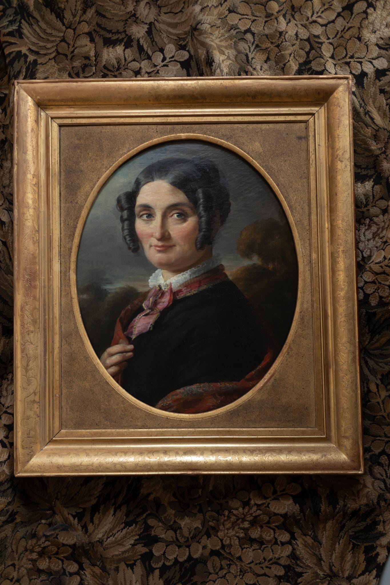 This elegant 1853 portrait by Alexandre-Marie Colin (1798–1875) captures a refined woman in mid-19th-century Parisian fashion. The sitter, presented in an oval format within a richly gilded frame, gazes directly at the viewer with a composed yet approachable expression. Her carefully styled curls, lace collar, and pink ribbon bow emphasise both grace and social standing, while the soft landscape background situates her within the Romantic tradition. A close friend of Delacroix and Géricault, Colin was a respected figure of French Romanticism. Signed and dated, this portrait reflects his mature style—sensitive, polished, and imbued with quiet dignity during the early Second Empire.. This painting has been to the restorer for a professional cleaning and new varnish. It does have some small repairs, not very noticeable on the front of the work. The high quality frame also has some signs of it's age, Please see all photos.