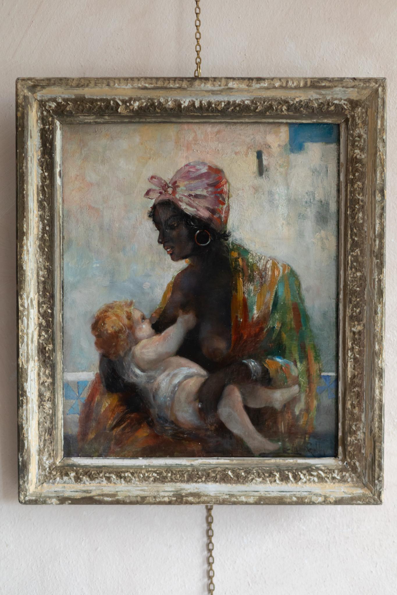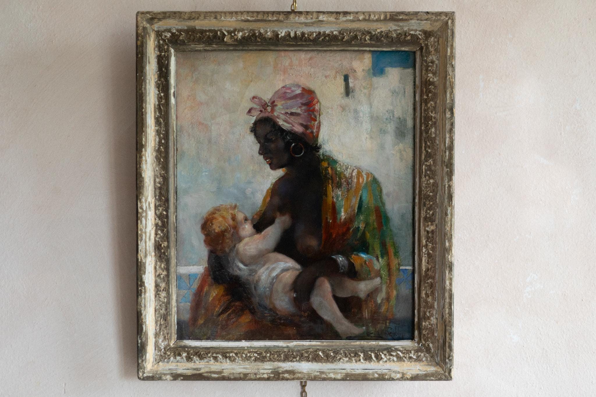Dating from the early 1900s, Antique French oil painting depicting a woman nursing a baby. This Antique oil painting is painted on Canvas. From Paris in Origin. The antique frame has small imperfections due to it's age but this adds to it's look. This painting has recently been to the restorer for a professional cleaning and new varnish applied. Please see all photos.