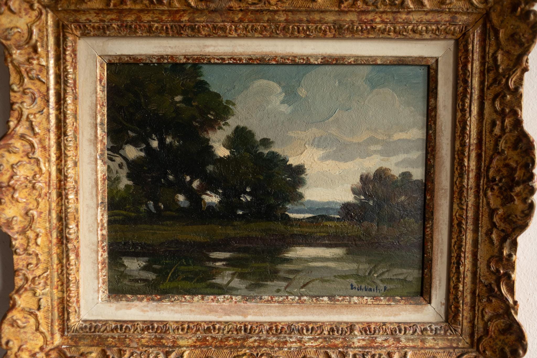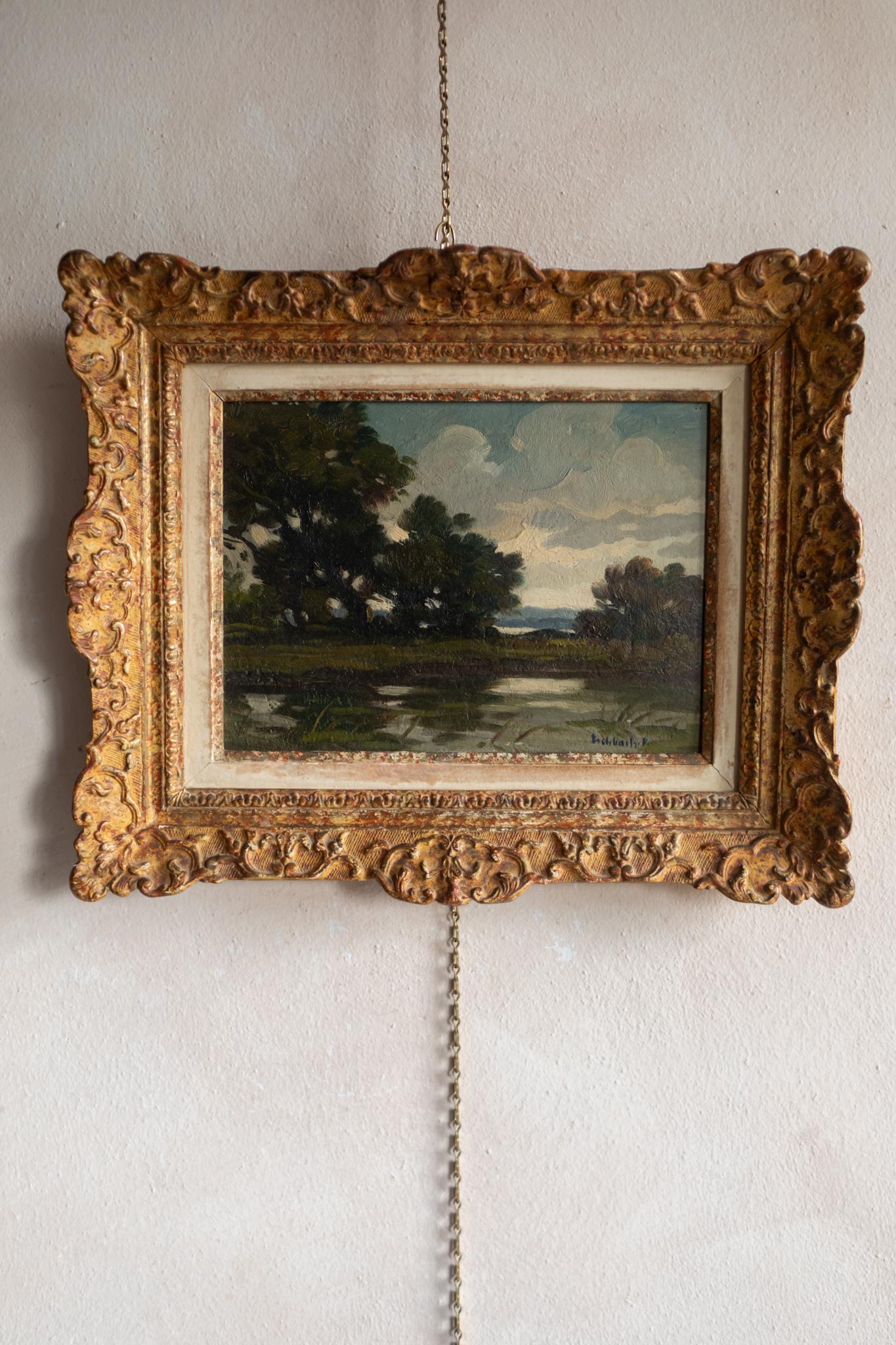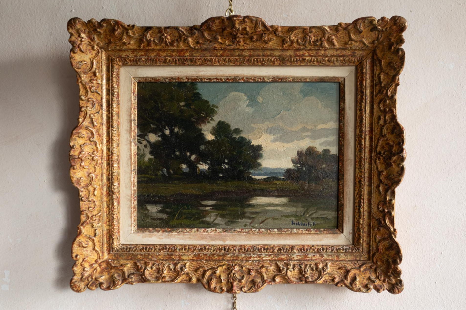 This intimate oil on canvas captures the quiet poetry of a wooded riverbank at dusk. Tall trees rise in silhouette against a sky of drifting clouds, their forms mirrored in the calm water below. Painted with soft, impressionistic brushstrokes, the work reflects the enduring influence of the Barbizon School, where artists sought harmony between land, light, and atmosphere. Signed in the lower right corner, suggesting a French landscape artist from around 1900. The back of the painting is marked for the Parisian art supplier Lefranc & Cie. Presented in its richly carved Montparnasse frame, the painting conveys a timeless sense of stillness, inviting contemplation of nature’s fleeting moods. Ready to be hang, and to be enjoyed for generations. Comes in a wonderful Montparnasse frame. Please see all photos