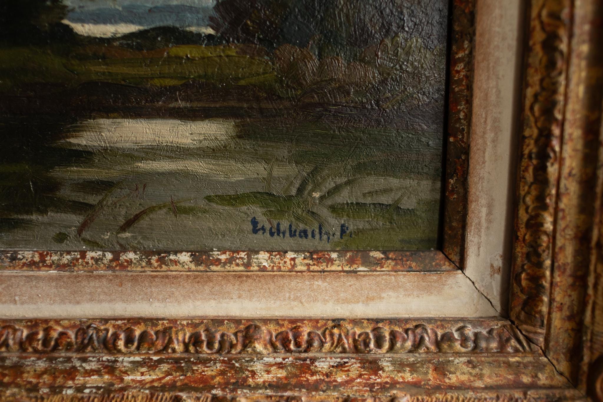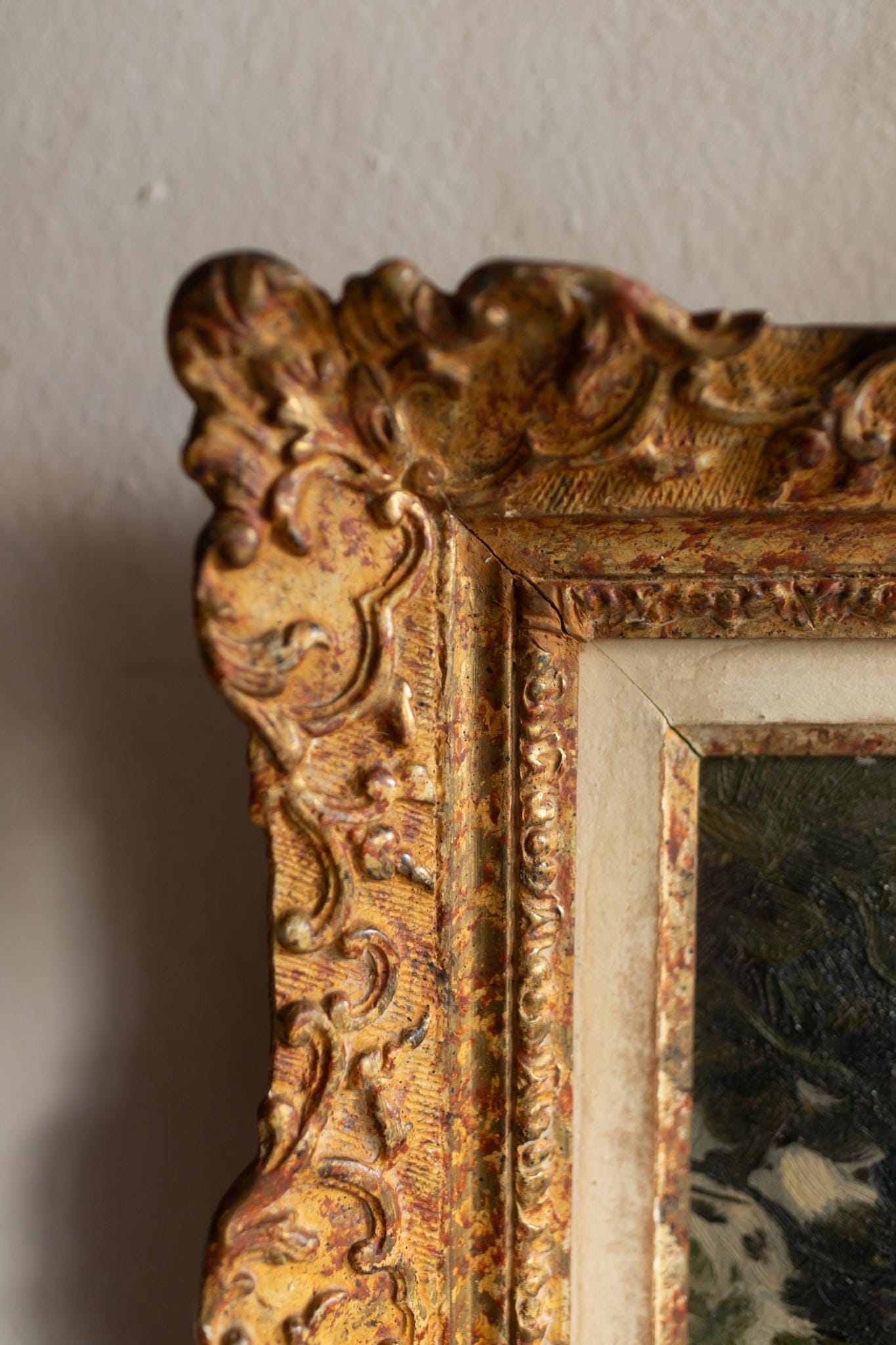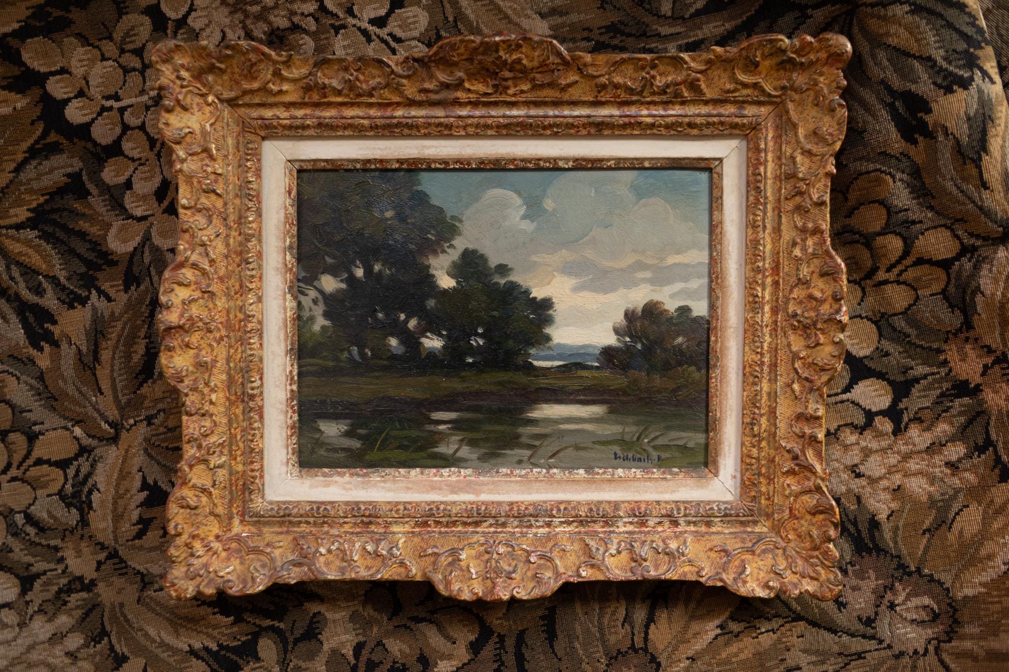 This intimate oil on canvas captures the quiet poetry of a wooded riverbank at dusk. Tall trees rise in silhouette against a sky of drifting clouds, their forms mirrored in the calm water below. Painted with soft, impressionistic brushstrokes, the work reflects the enduring influence of the Barbizon School, where artists sought harmony between land, light, and atmosphere. Signed in the lower right corner, suggesting a French landscape artist from around 1900. The back of the painting is marked for the Parisian art supplier Lefranc & Cie. Presented in its richly carved Montparnasse frame, the painting conveys a timeless sense of stillness, inviting contemplation of nature’s fleeting moods. Ready to be hang, and to be enjoyed for generations. Comes in a wonderful Montparnasse frame. Please see all photos
