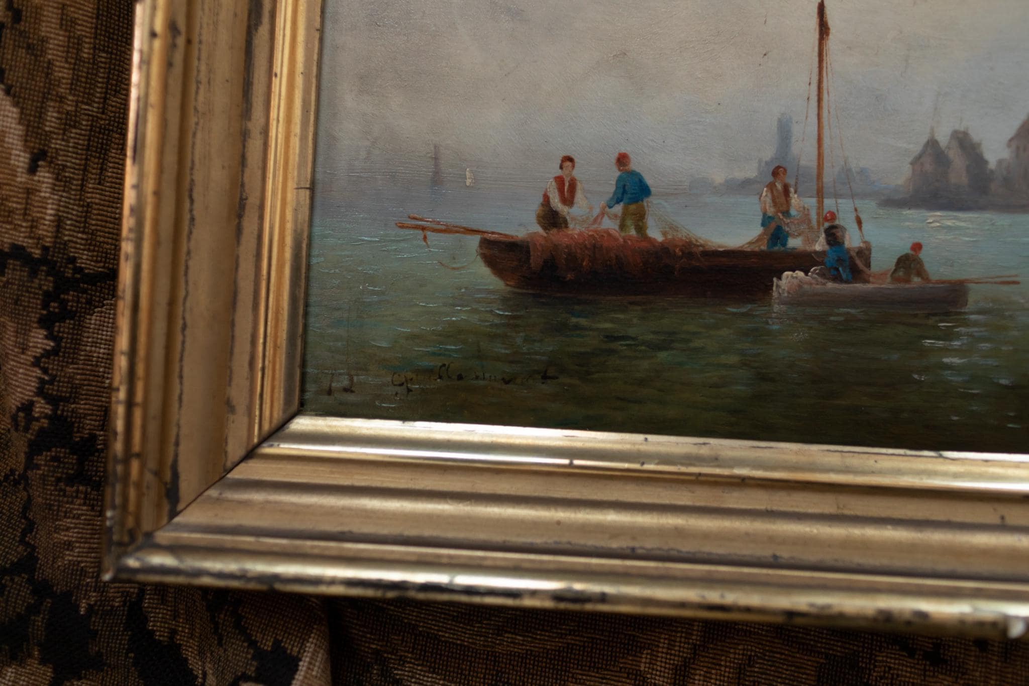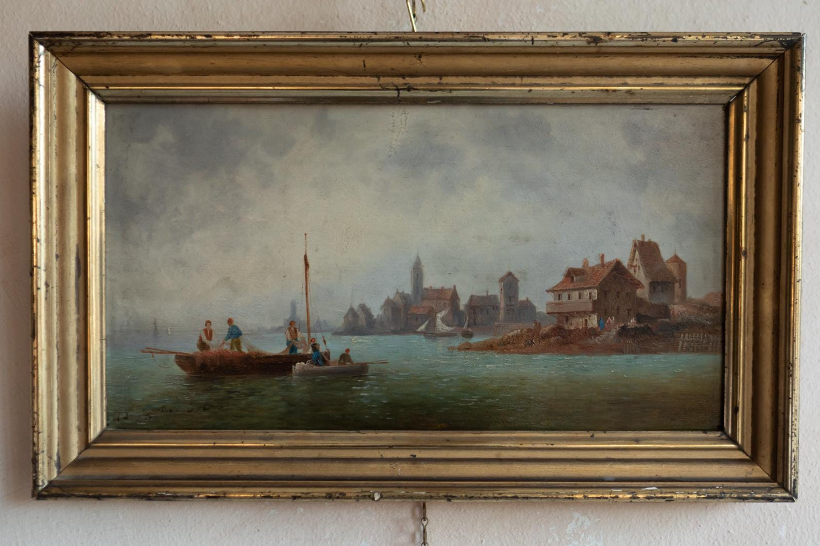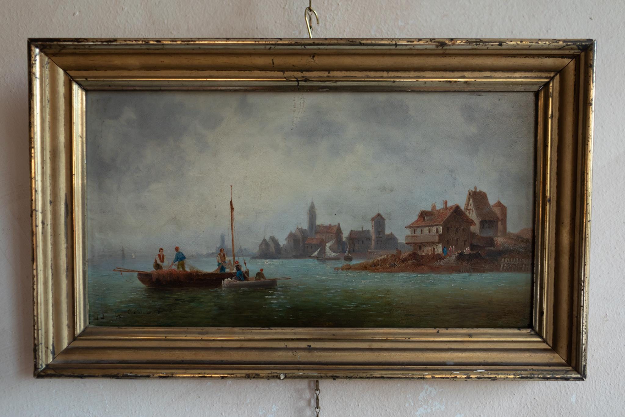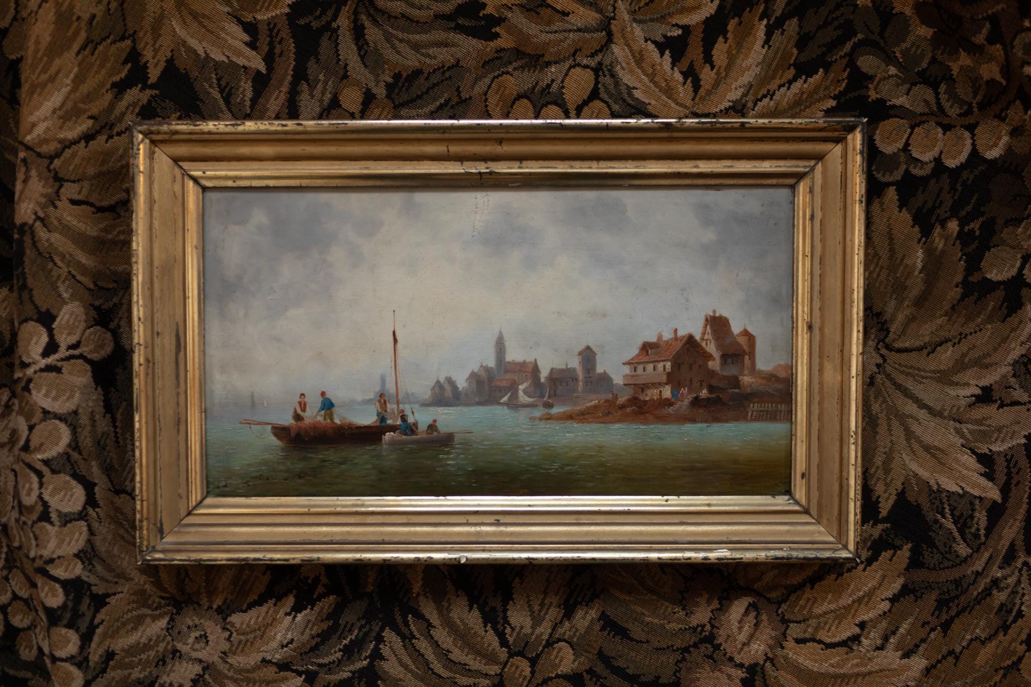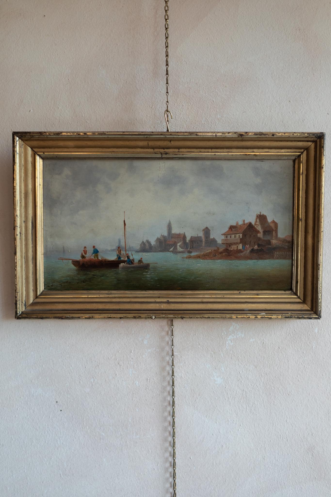 Dated 1872, This French antique oil painting is painted on wood panel and depicts the Brittany coast. This 19th-century marine painting captures the bustling oyster port of Cancale, with Mont-Saint-Michel rising faintly in the distance across the bay. Fishermen guide their small boats across calm green waters, the sails of larger vessels visible beyond. The artist heightens the drama of the bay by elongating the Mont St. Michel abbey’s spire, emphasising its Gothic presence against the misty horizon. Rustic houses line the shore, anchoring the scene in everyday life. Painted in 1872, this work reflects the romantic fascination with Normandy and Brittany’s coasts, where working ports, tidal light inspired both realism and imagination in equal measure. This antique coastal painting has been to the restorer for a professional cleaning and new varnish applied. It is in good vintage condition. Ready to be hang, and to be enjoyed for generations. This original antique oil painting would be great in a living room or as boys room decor. This antique coastal painting is good vintage condition. Ready to be hang, and to be enjoyed for generations. This original antique oil painting would be great in a living room or as boys room decor.
