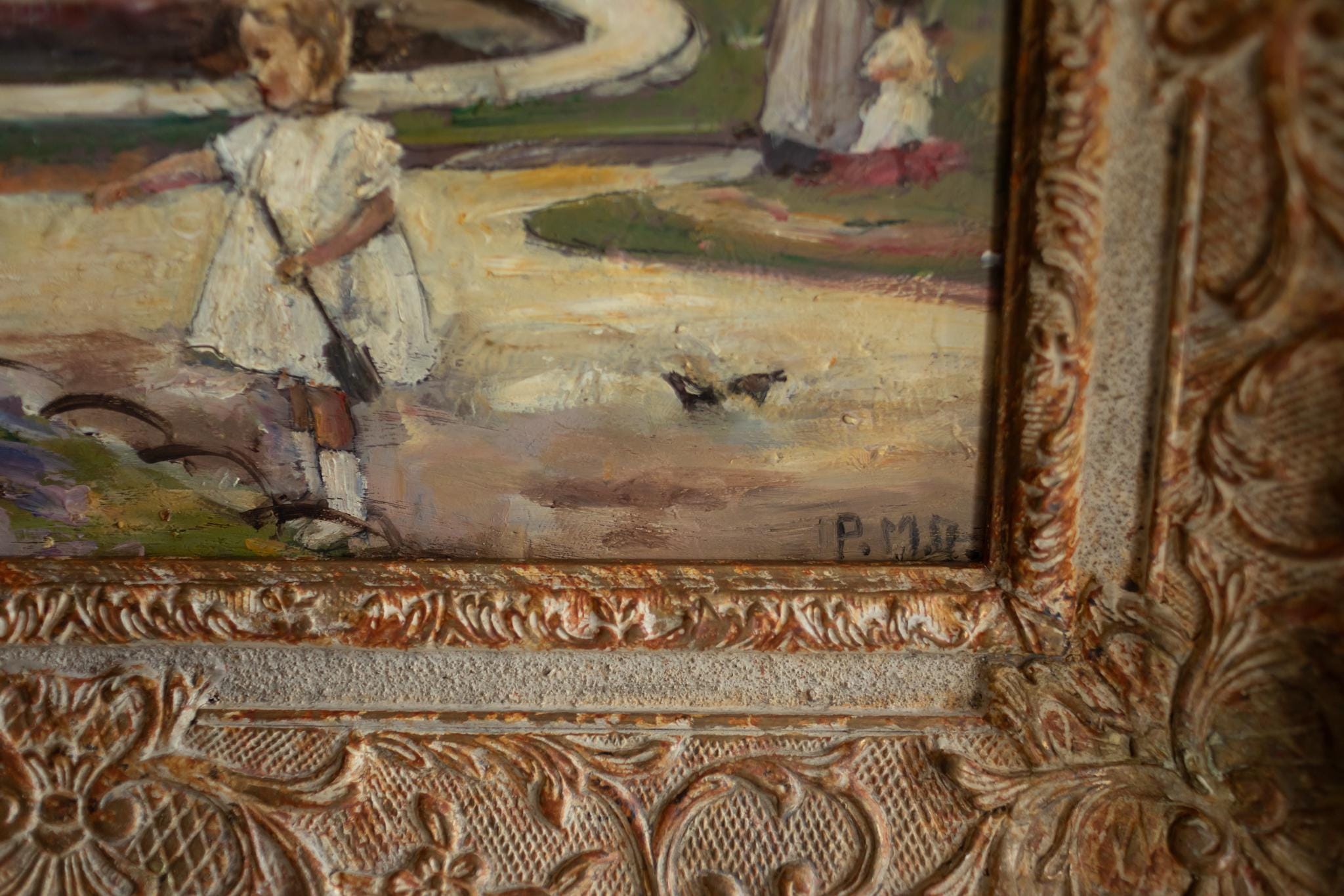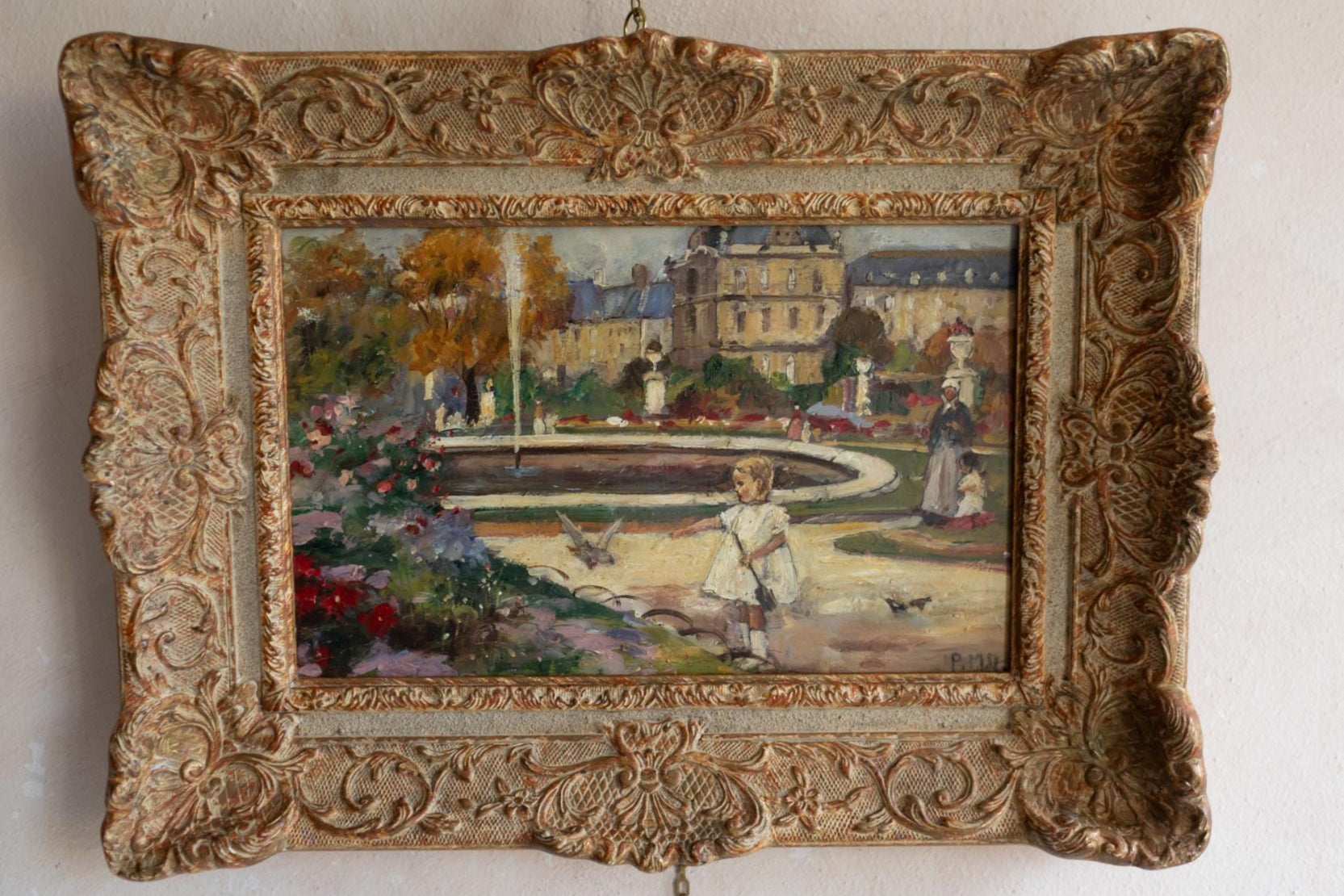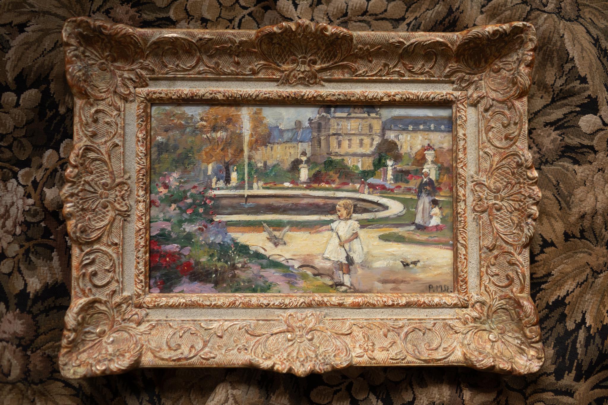 Dating from the early 20th Century, an exquisite oil painting of a Parisian fall scene. This charming oil painting captures a lively afternoon in the Jardin du Luxembourg, one of Paris’s most beloved parks. At the centre, a young child in a crisp white dress stands near the curved fountain, while elegant figures stroll and rest beneath the autumnal trees. Behind them rises the stately Palais du Luxembourg, anchoring the scene with its grandeur. Loose, impressionistic brushstrokes bring movement to the flowers and foliage, while the soft light enhances the park’s romantic atmosphere. Likely painted around 1890–1910, the work reflects the Belle Époque taste for refined leisure and Parisian elegance, blending intimacy with urban sophistication.