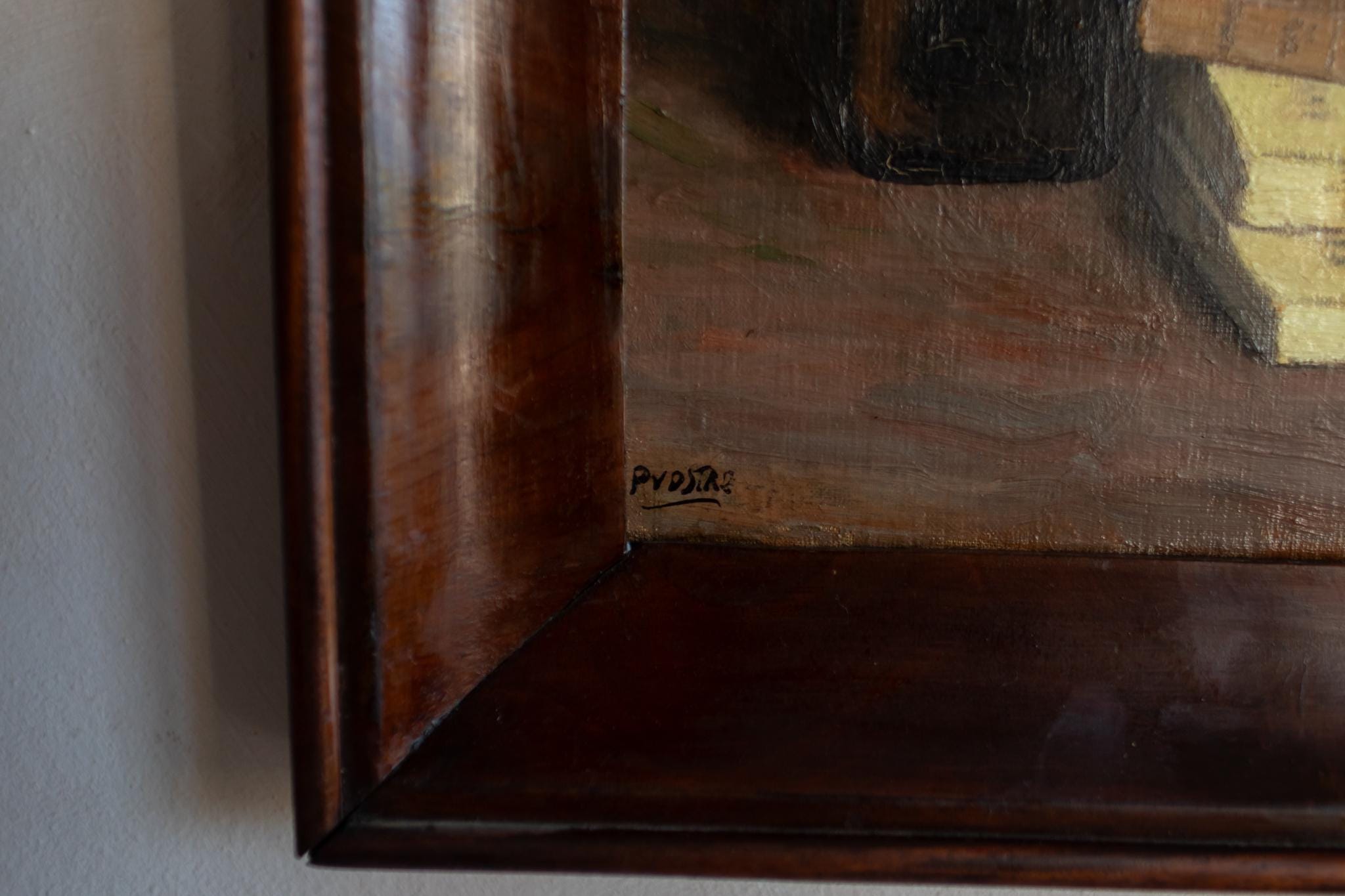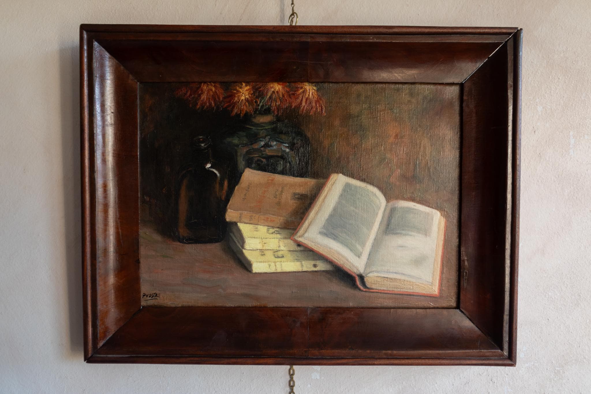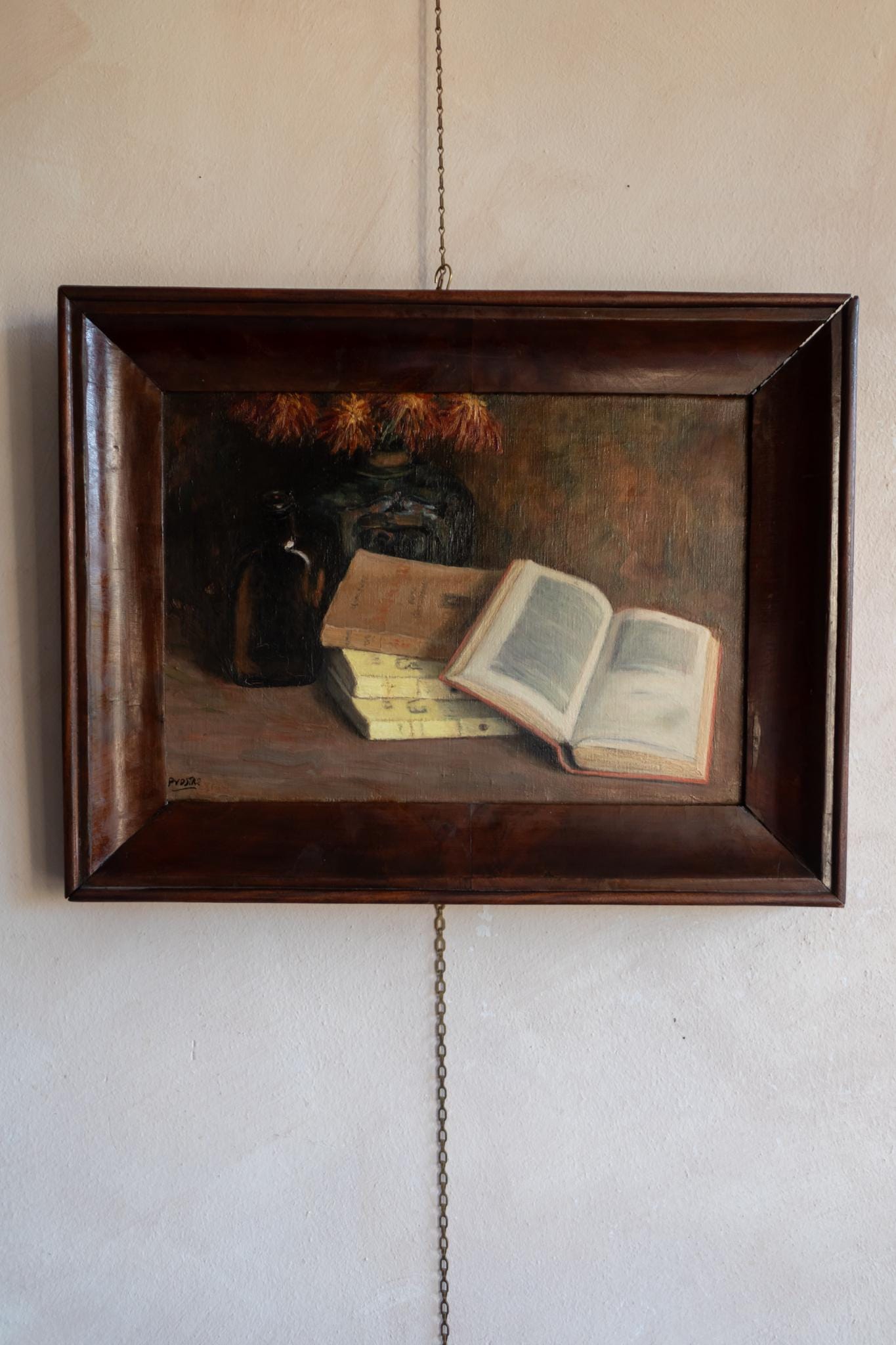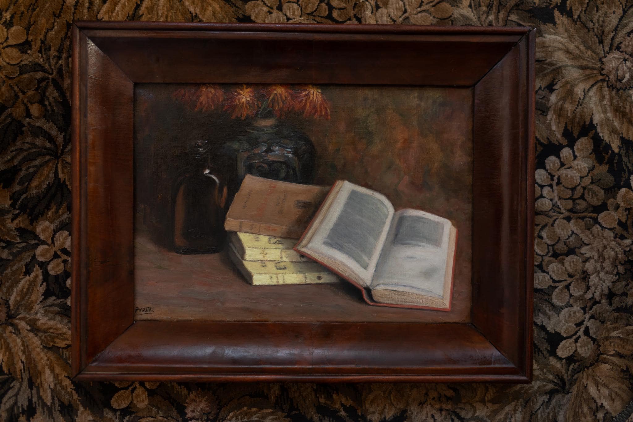 This intimate still life depicts an arrangement of three books, one open as if recently consulted, alongside a dark glass bottle and a vase of warm-toned flowers. Painted in earthy shades of brown, cream, and ochre, the composition exudes a quiet atmosphere of study and reflection. The artist emphasises the textures of paper, wood, and glass, while the play of shadow and light lends depth to the scene. Created in the early 20th century, the work resonates with homely charm and intellectual symbolism, a celebration of literature and learning as timeless subjects for artistic contemplation.
