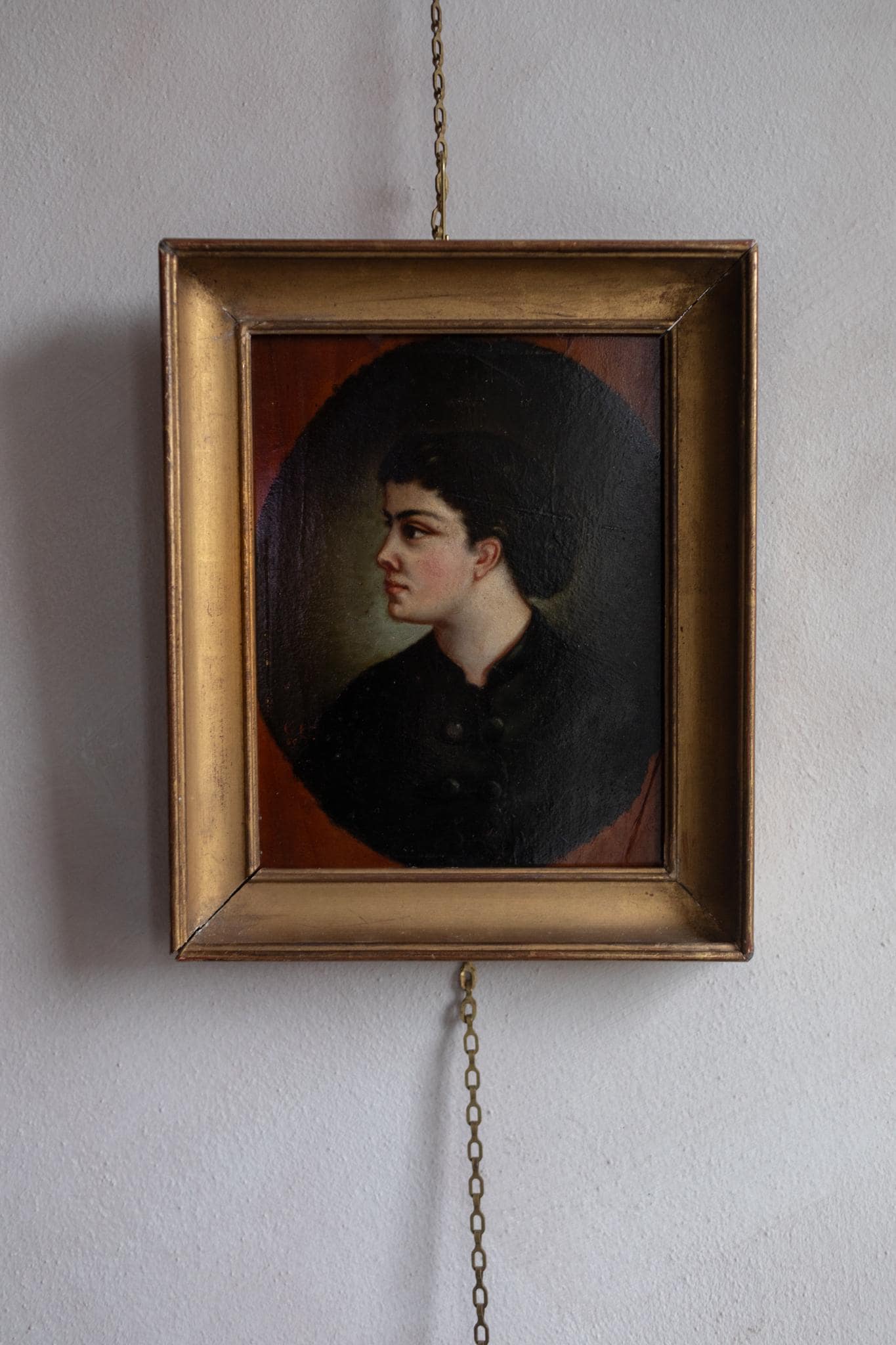The sitter’s hairstyle and simple dark dress are consistent with mid-19th-century provincial fashion, suggesting a portrait commissioned for personal or family use. The oval format was especially popular for such intimate works, often intended for domestic interiors rather than grand salons.