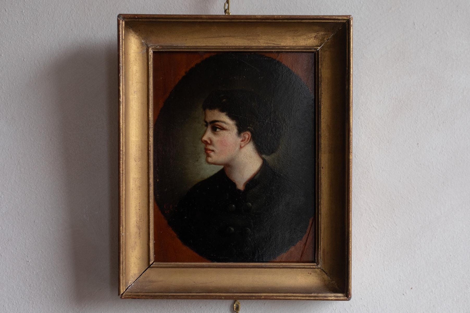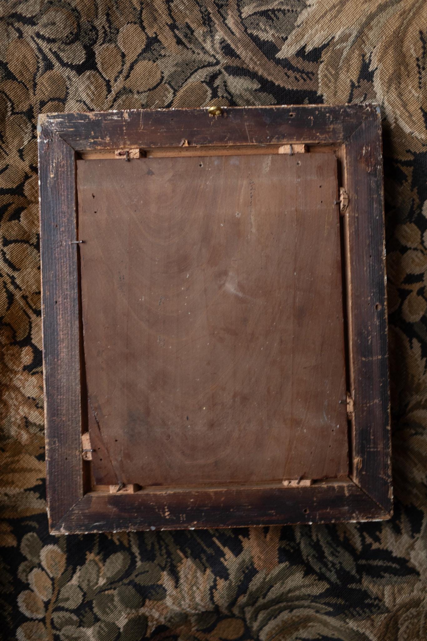 Good antique condition with light age-related wear. Panel is stable. Paint surface shows gentle craquelure consistent with age. Frame retains its original gilding with minor wear and patina. The painting is executed on wood panel, lending stability and a smooth surface to the brushwork. It is housed in its original gilt frame, whose warm patina and clean lines complement the understated elegance of the portrait. The painting has recently been to the restorer for a professional cleaning and new varnish applied.