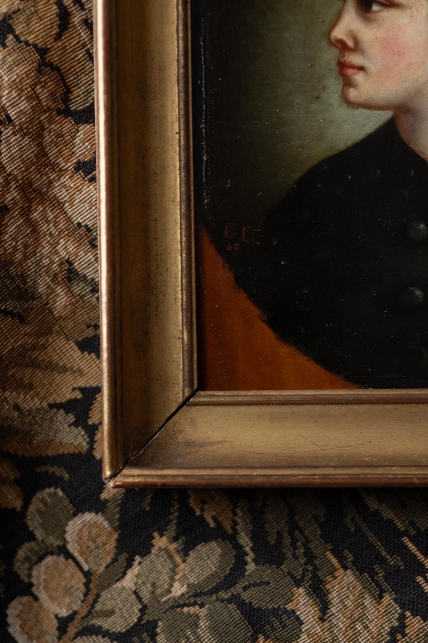 Painted in 1866, (dated center left) the work reflects regional French portrait traditions rather than Parisian academic display. The artist has favoured sincerity and likeness over theatricality, using a restrained palette and soft modelling to convey character and presence. The dark background enhances the luminosity of the skin tones, while subtle highlights define the nose, cheek, and eye with precision.